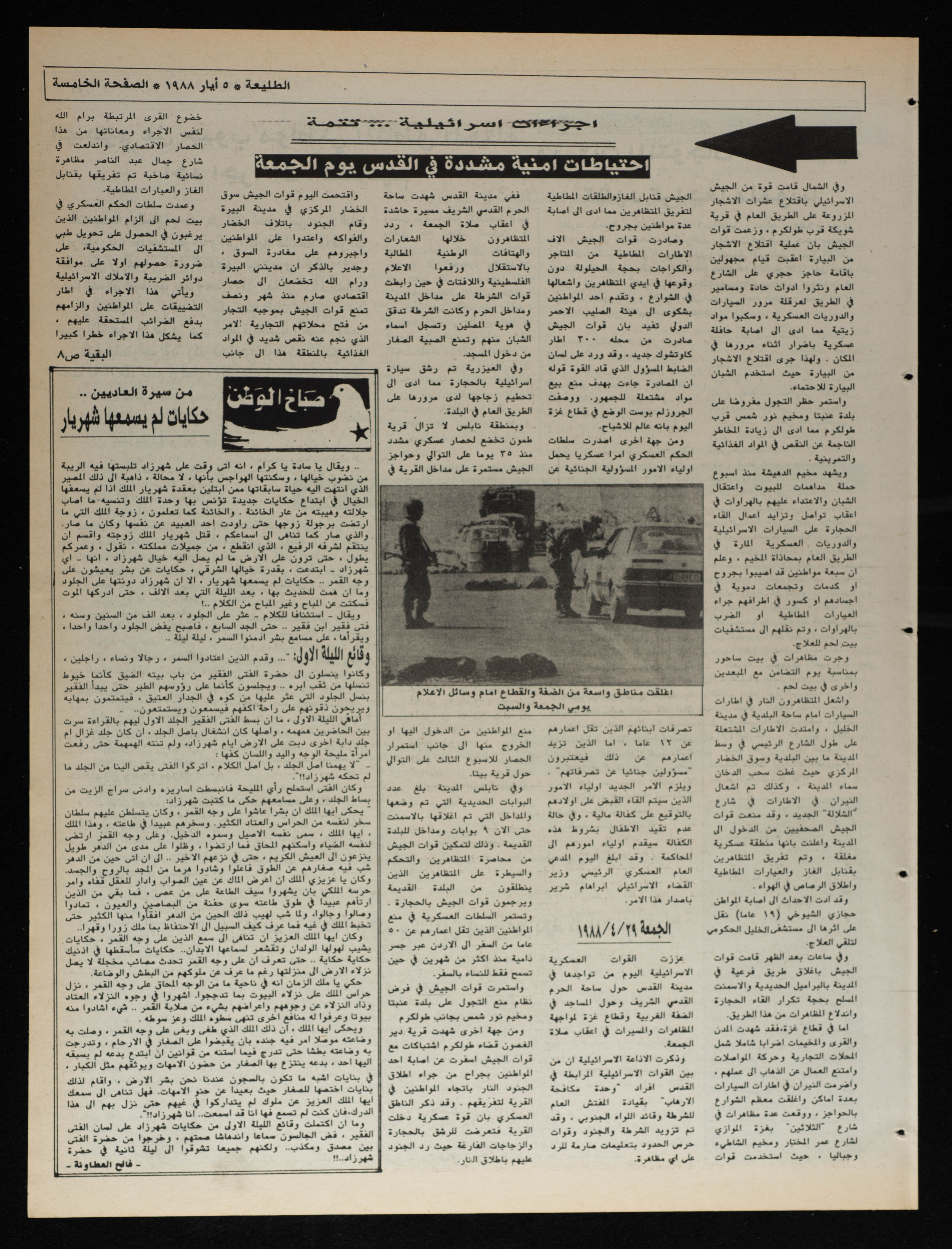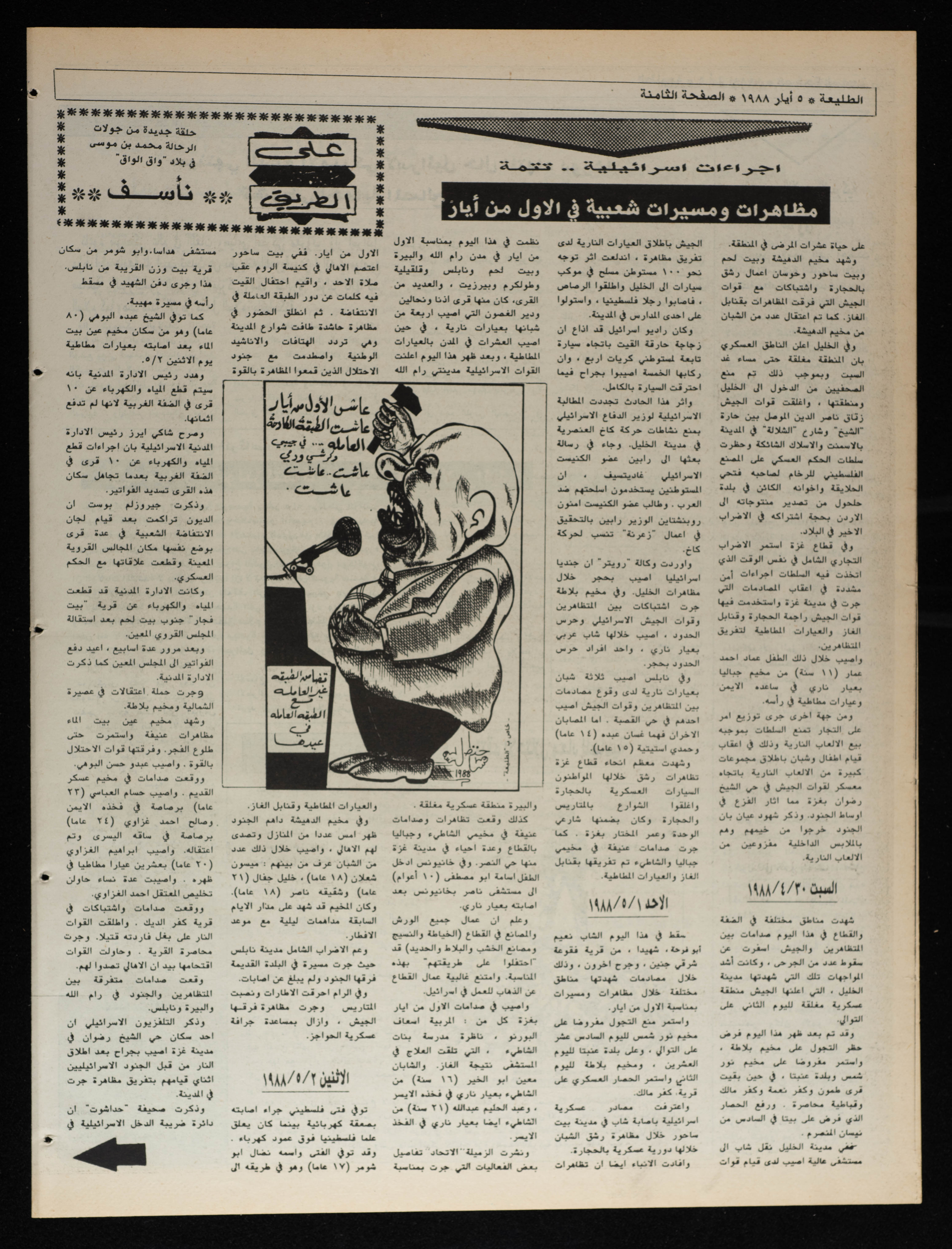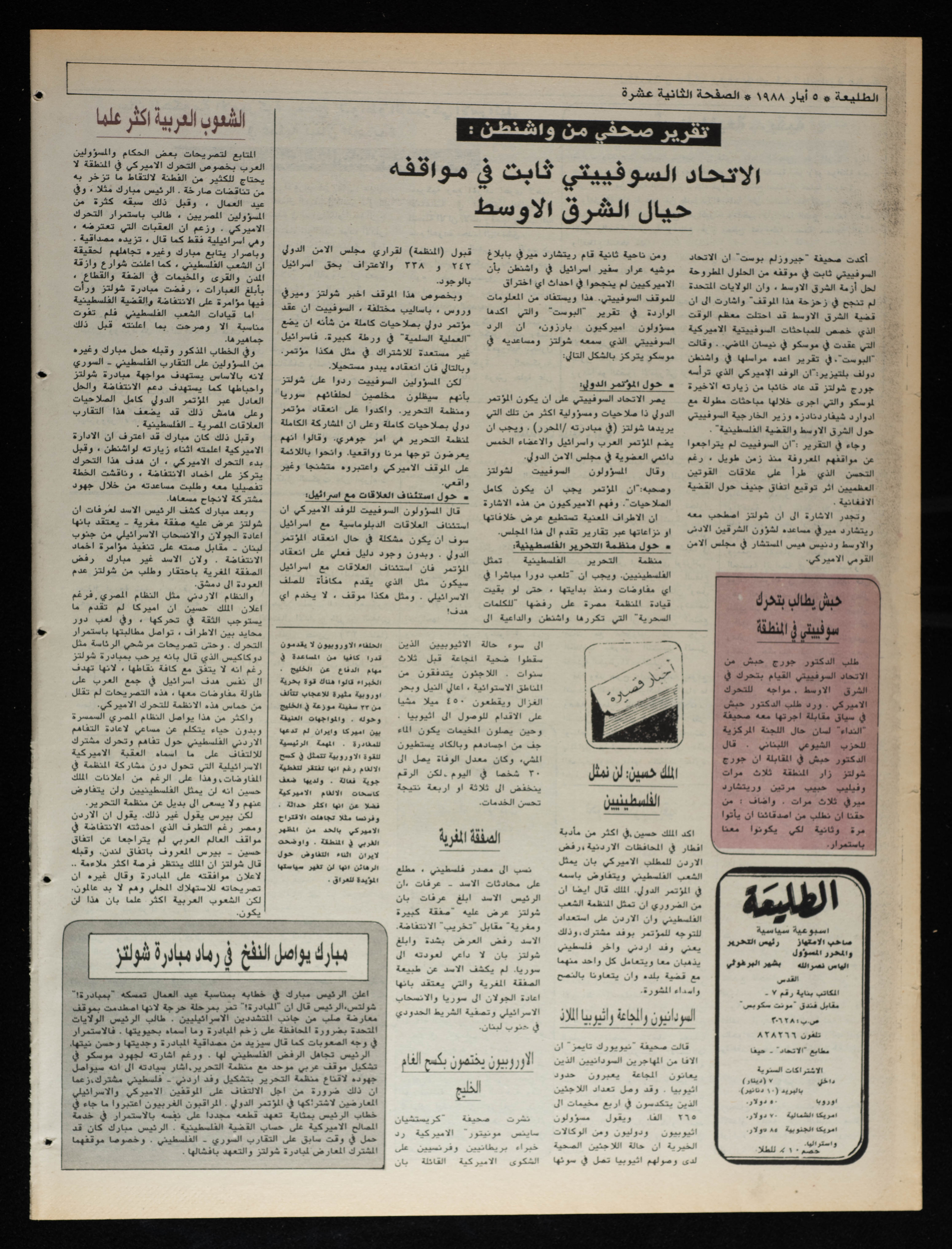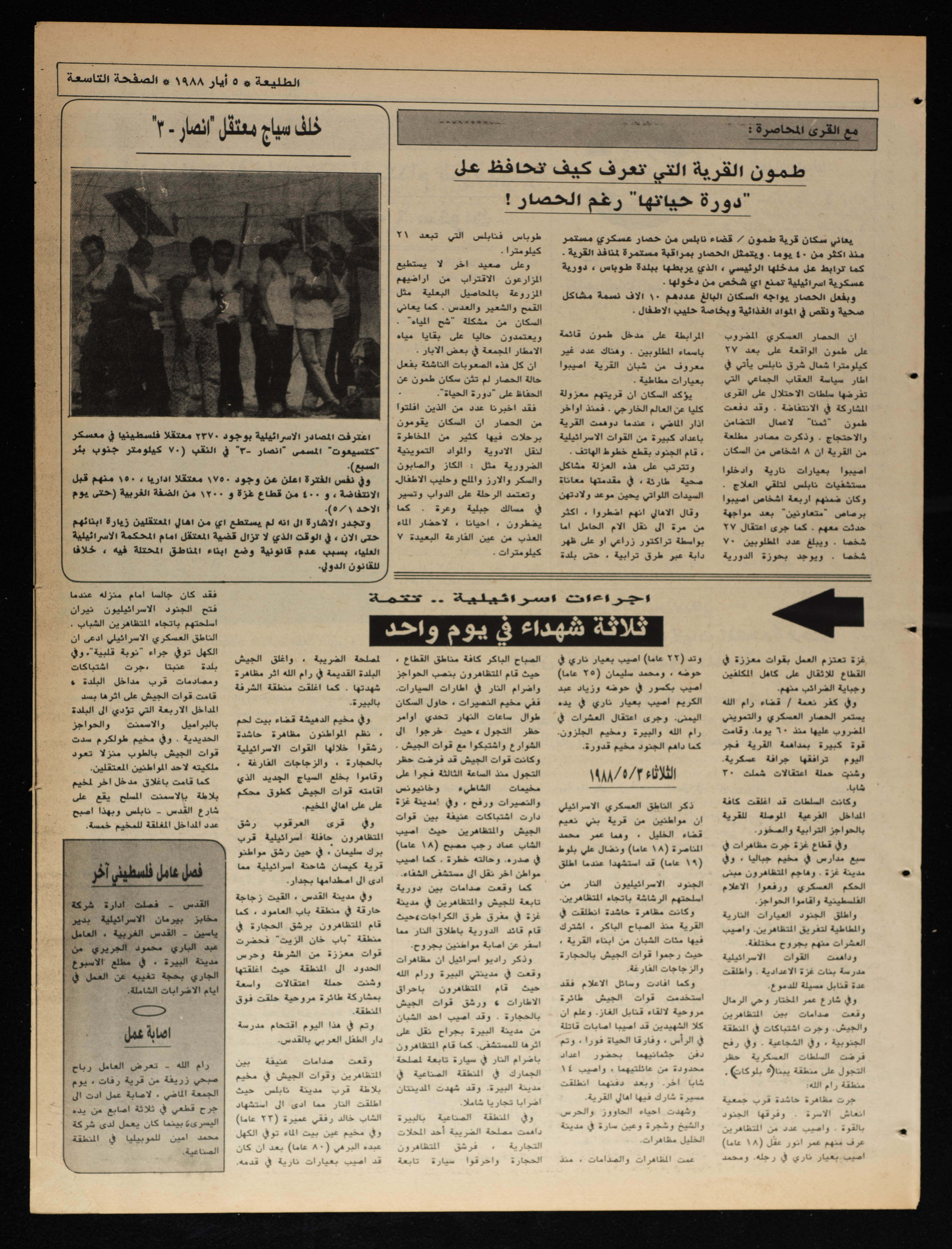 Printed in Salah ad-Din Press with Bashir al-Barghuthy as the managing editor, this 12-page issue no. 531 of Attaliʾah Newspaper was issued on 5 May 1987 and features the following news pieces: A shaheed and injuries at the labour day demonstrations. A full strike in the West Bank and Gaza Strip, curfew and blocking outlets with concrete. A U.S. military group in Cairo to continue with the memorandum of agreement. Violent confrontations and the death and injury of tens of individuals in the south. Egypt rents police and special forces for Saudi Arabia. A U.S. military movement to escalate the situation in the Gulf. Direct negotiations between Egypt and Israel to implement the U.S. resolution regarding Taba. In one day they said: There cannot be a political victory over the Intifada. An article by Bashir al-Barghuthy titled, "What lies behind raising the tension in the Gulf and Sothern Lebanon?" New Israeli administrative procedures following 21 weeks of the Intifada. Seven shuhadaʾ in six days. Security precautions in al-Quds (Jerusalem) on Friday. A significant deficit in revenues on Israeli products. The U.S. support of Israel ends when it no longer plays the protector of the U.S. interests. Public demonstrations and walkouts on 1 May. Tammun, the village that knows how to maintain its "life cycle" despite the blockades. Washington wanted a "Soviet Vietnam" Afghanistan but agreed to a solution it had refused for 6 years. The statement of the U.S. Government exposes the U.S.-Israeli collusion in the new Lebanon operation. Administrative detention against youth from the Bani Naʿim and Yatta. A press report from Washington: The Soviet Union stands with its stance on the Middle East.