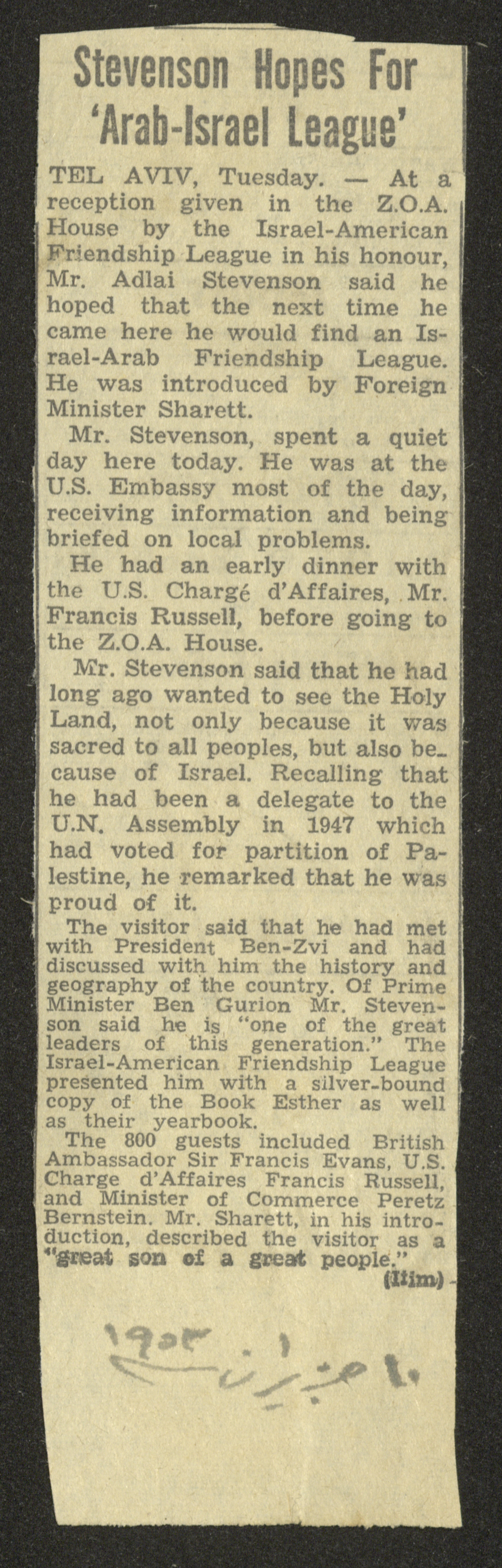 قصاصة من جريدة غير معروفة، بتاريخ 10 حزيران 1953، تحمل تصريحات للسياسي الأمريكي أدلاي ستيفينسون حول آفاق التعاون العربي الإسرائيلي.
