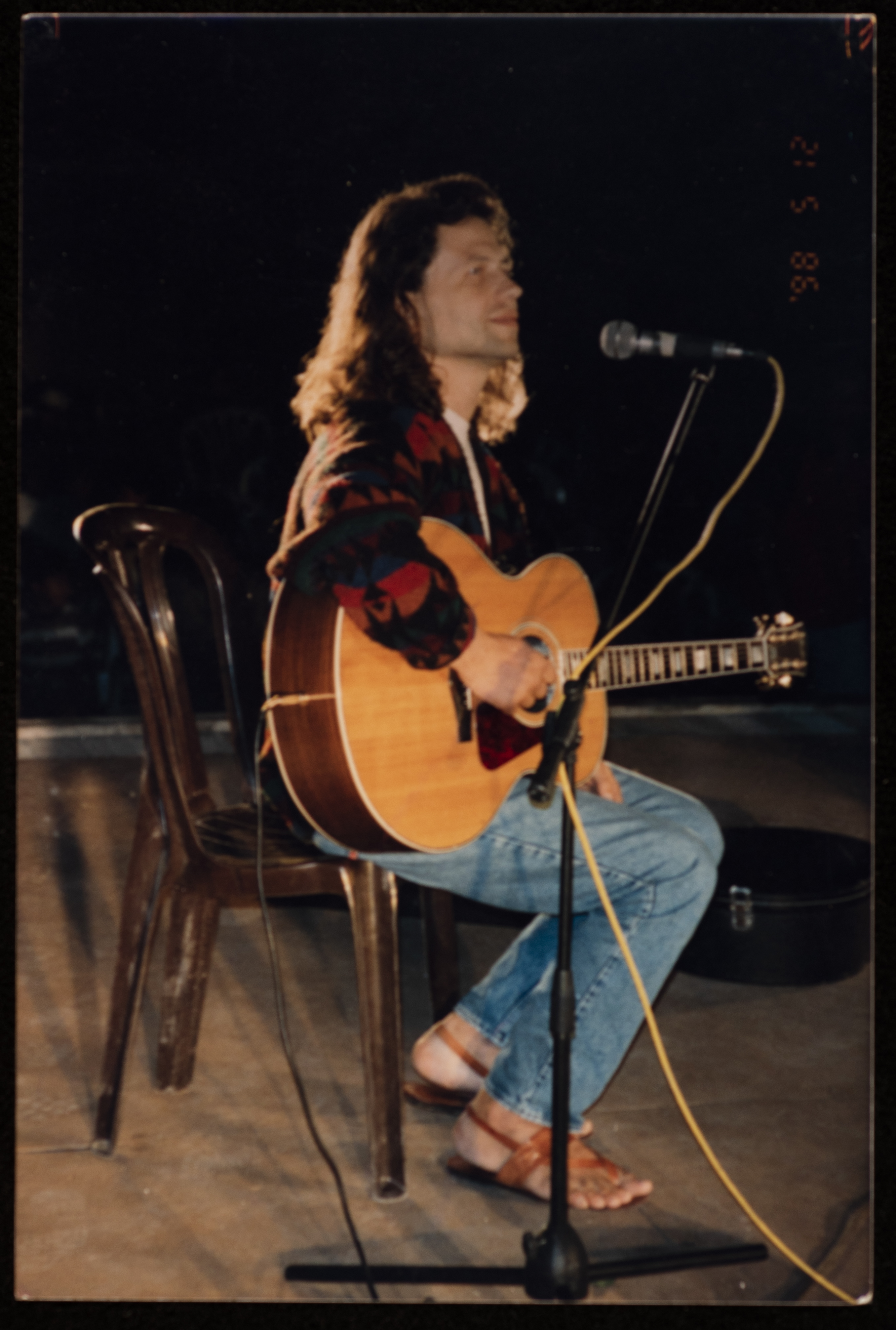 صورة لعازف جيتار أثناء فعاليات مهرجان صفا للتراث والثقافة والفنون الذي استمر لمدة خمسة أيام في مدرسة بنات قرية صفا عام 1998 من تنظيم مركز حنظلة الثقافي.