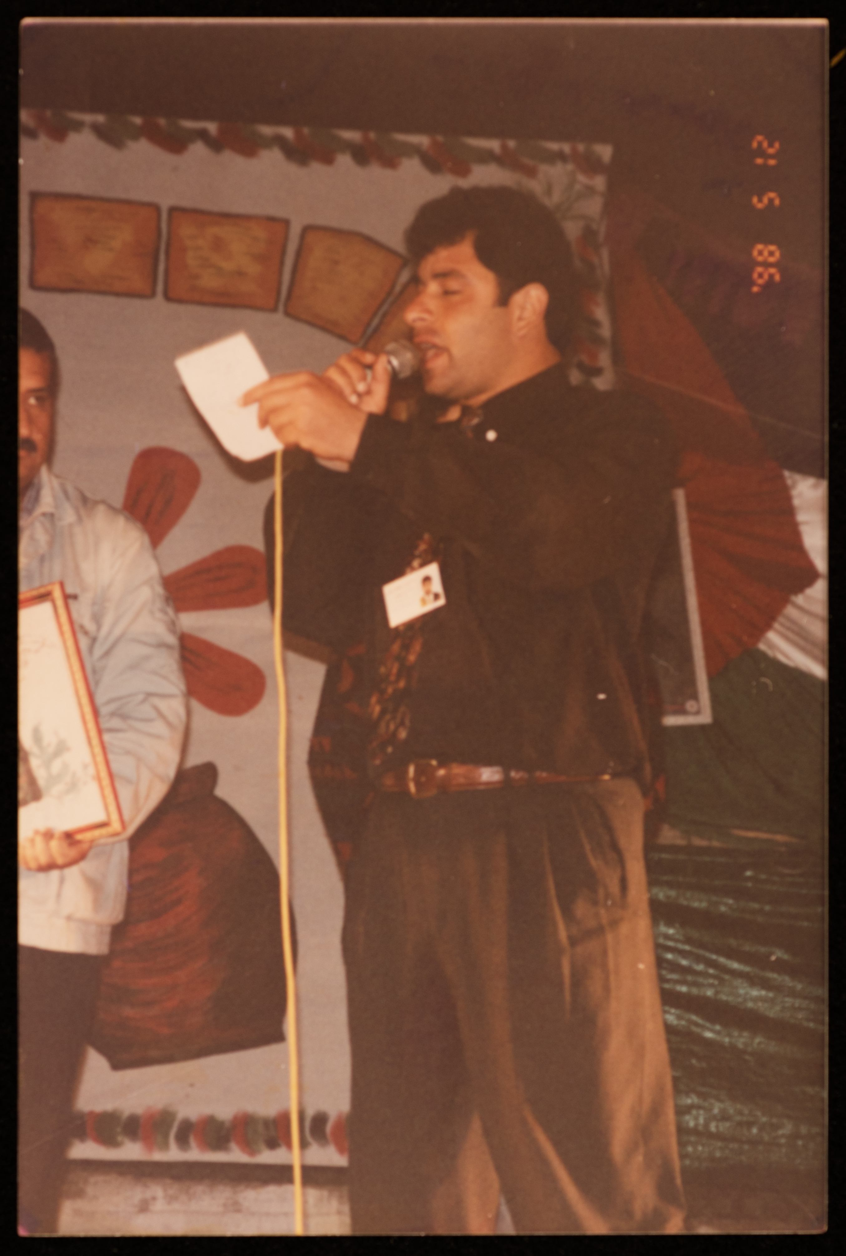 صورة لسمارة كراجة، أحد أعضاء مركز حنظلة الثقافي، يلقي خطابًا أثناء مهرجان صفا للتراث والثقافة والفنون الذي أقامه مركز حنظلة لمدة خمسة أيام في مدرسة بنات صفا عام 1998.