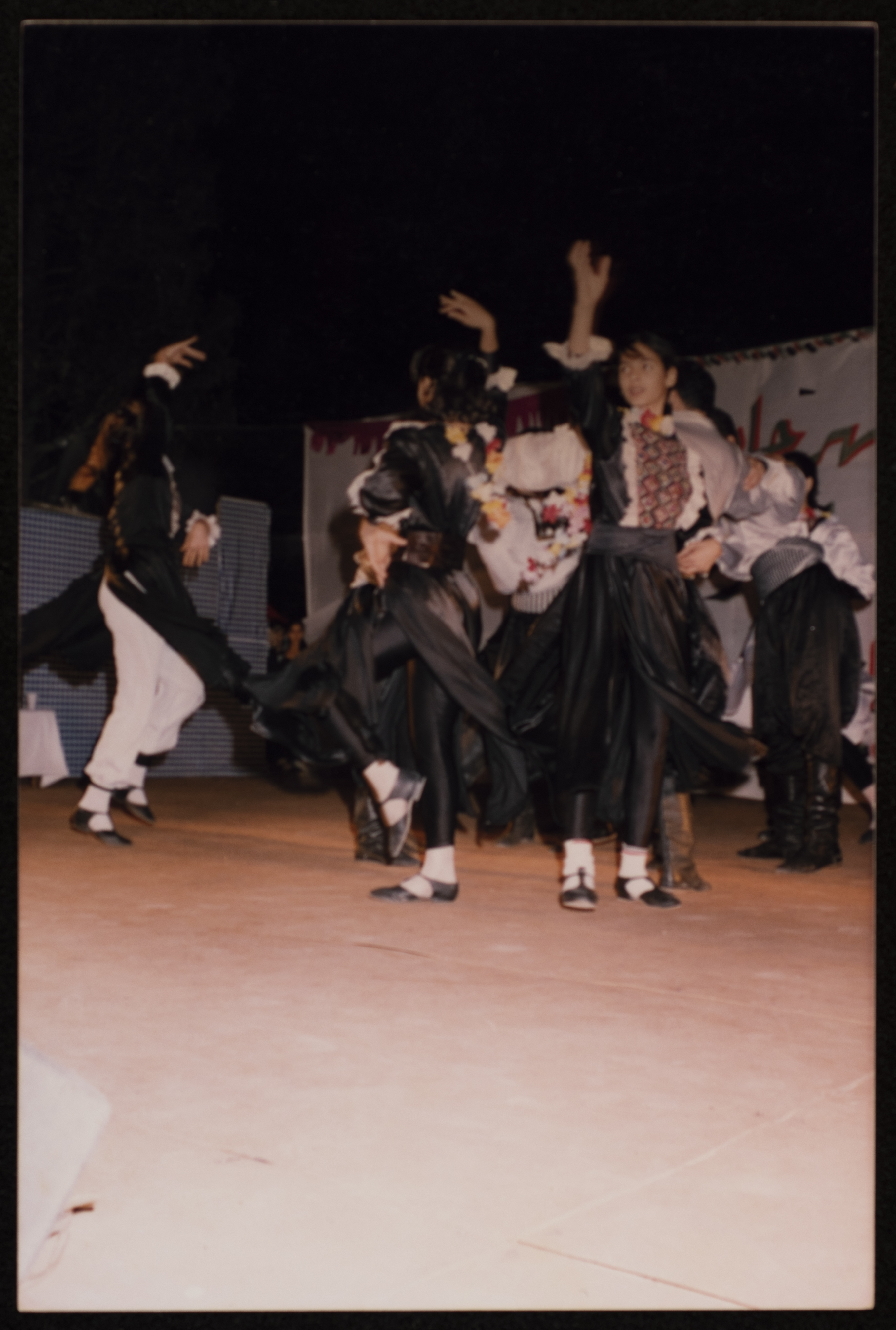 صورة من عرض فرقة دبكة أثناء فعاليات مهرجان صفا للتراث والثقافة والفنون الذي استمر لمدة خمسة أيام في مدرسة بنات قرية صفا عام 1998 من تنظيم مركز حنظلة الثقافي.
