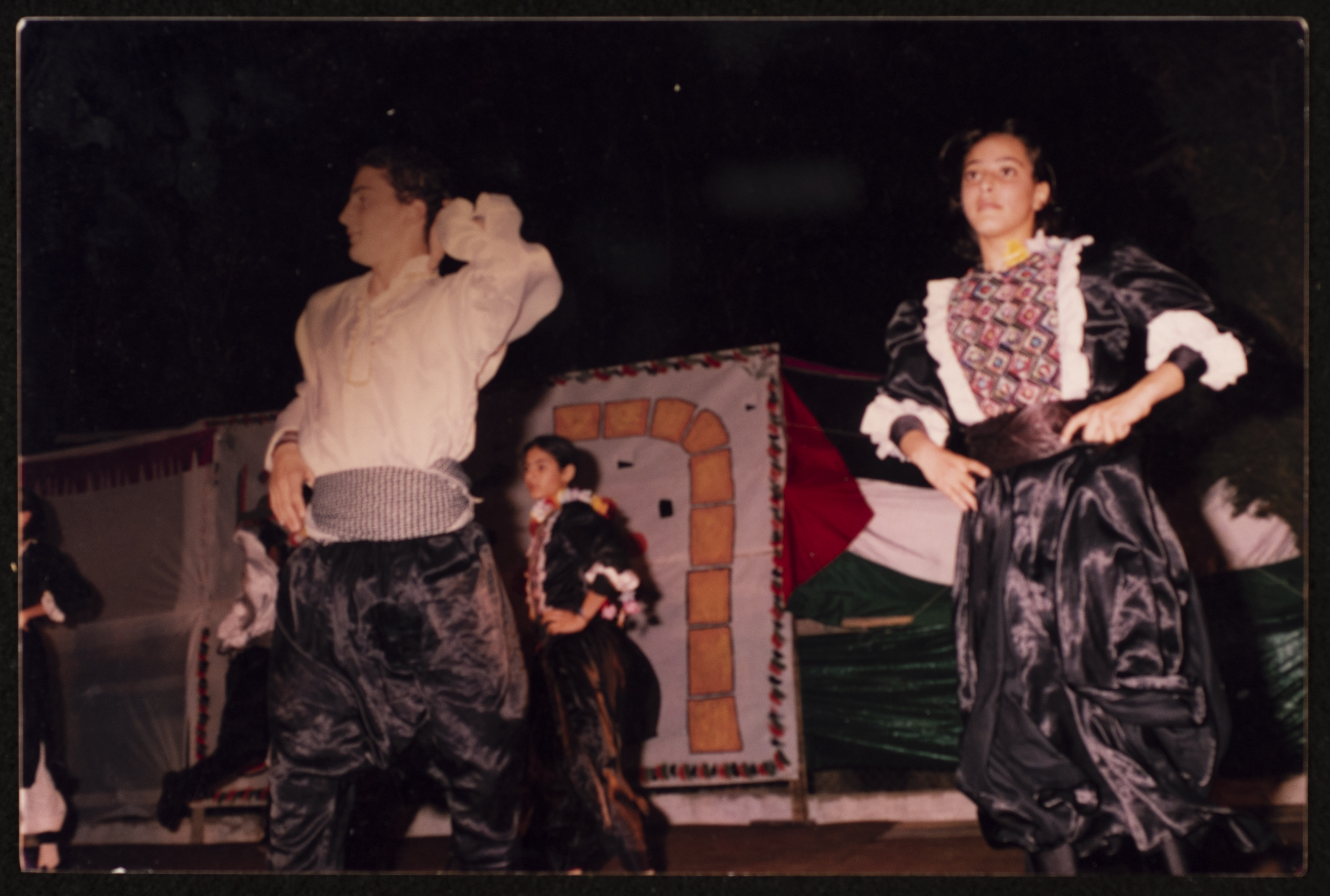 صورة من عرض فرقة دبكة أثناء فعاليات مهرجان صفا للتراث والثقافة والفنون الذي استمر لمدة خمسة أيام في مدرسة بنات قرية صفا عام 1998 من تنظيم مركز حنظلة الثقافي.