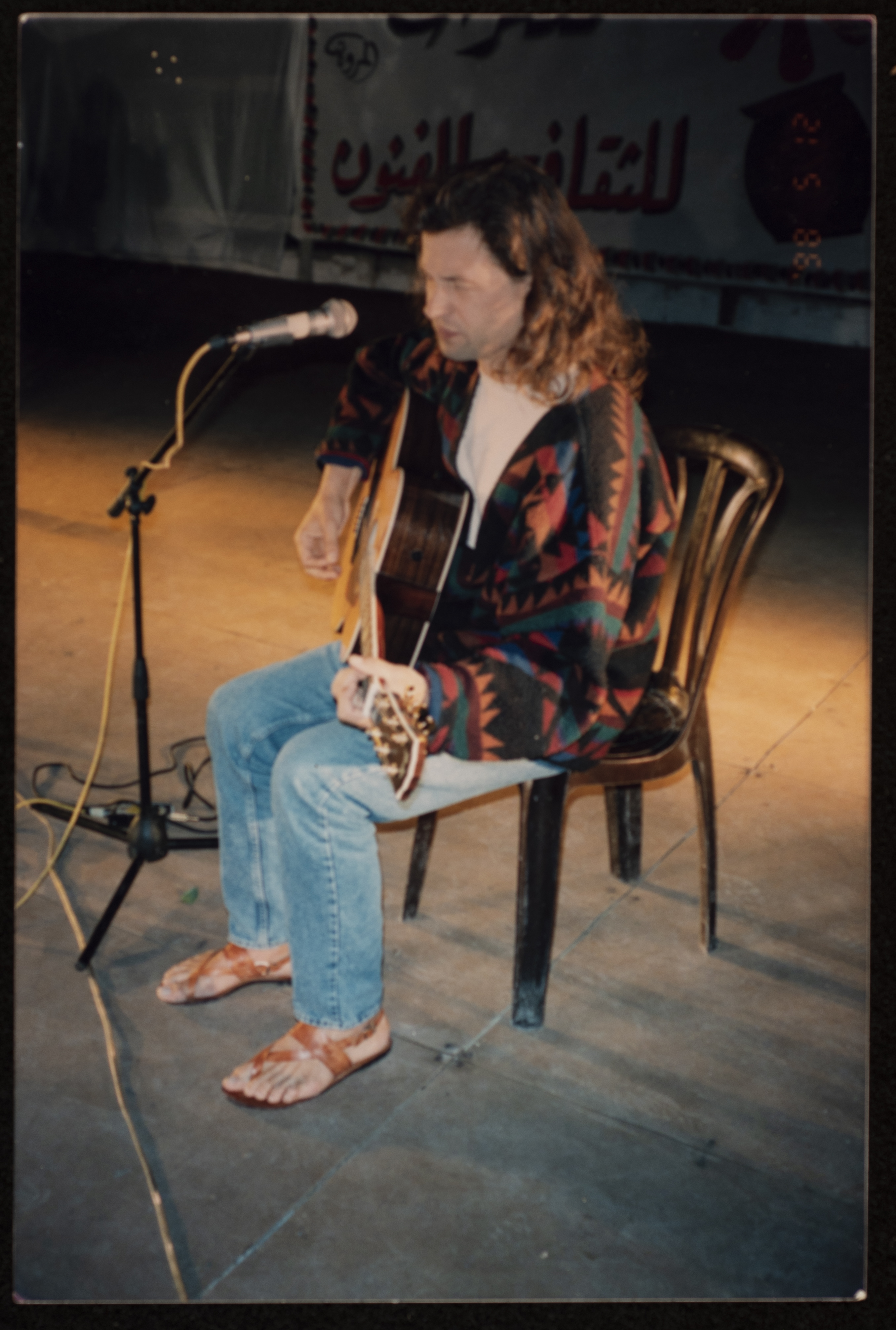 صورة يظهر فيها عازف جيتار أثناء مشاركته في فعاليات مهرجان صفا للتراث والثقافة والفنون الذي أقامه مركز حنظلة الثقافي واستمر لمدة خمسة أيام في مدرسة بنات صفا عام 1998.