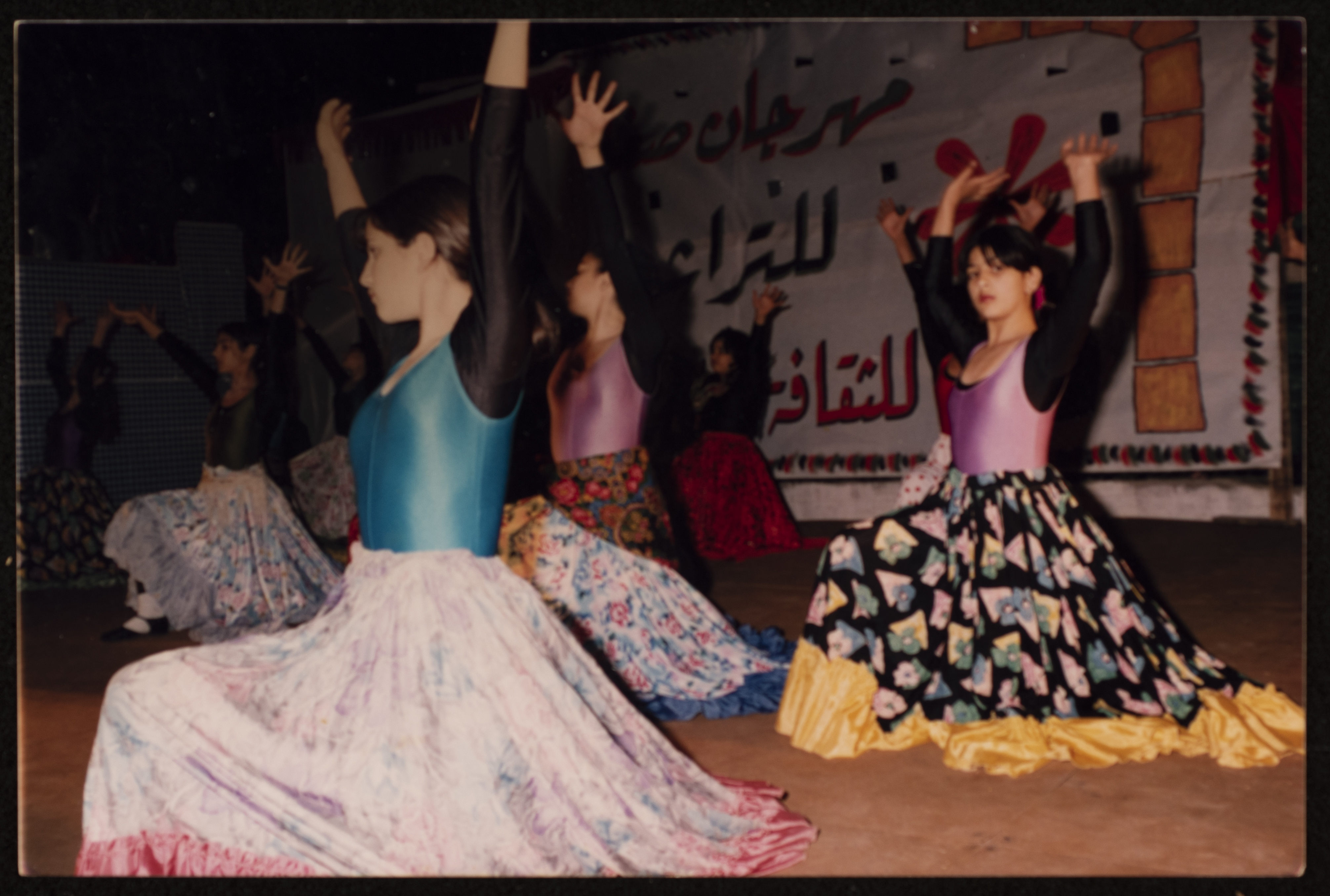 صورة من عرض فرقة دبكة أثناء فعاليات مهرجان صفا للتراث والثقافة والفنون الذي استمر لمدة خمسة أيام في مدرسة بنات قرية صفا عام 1998 من تنظيم مركز حنظلة الثقافي.