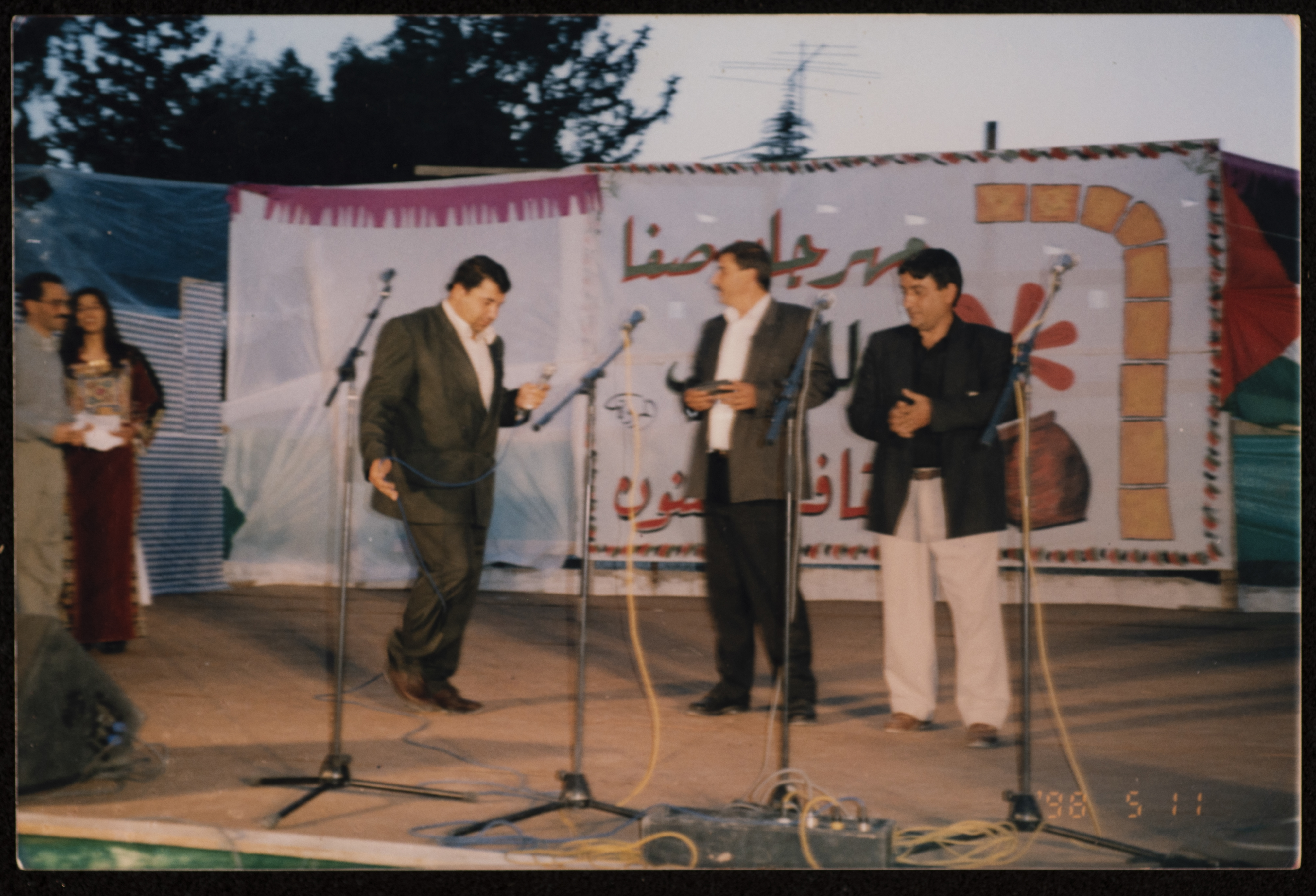 صورة من عرض فرقة دبكة أثناء فعاليات مهرجان صفا للتراث والثقافة والفنون الذي استمر لمدة خمسة أيام في مدرسة بنات قرية صفا عام 1998 من تنظيم مركز حنظلة الثقافي.