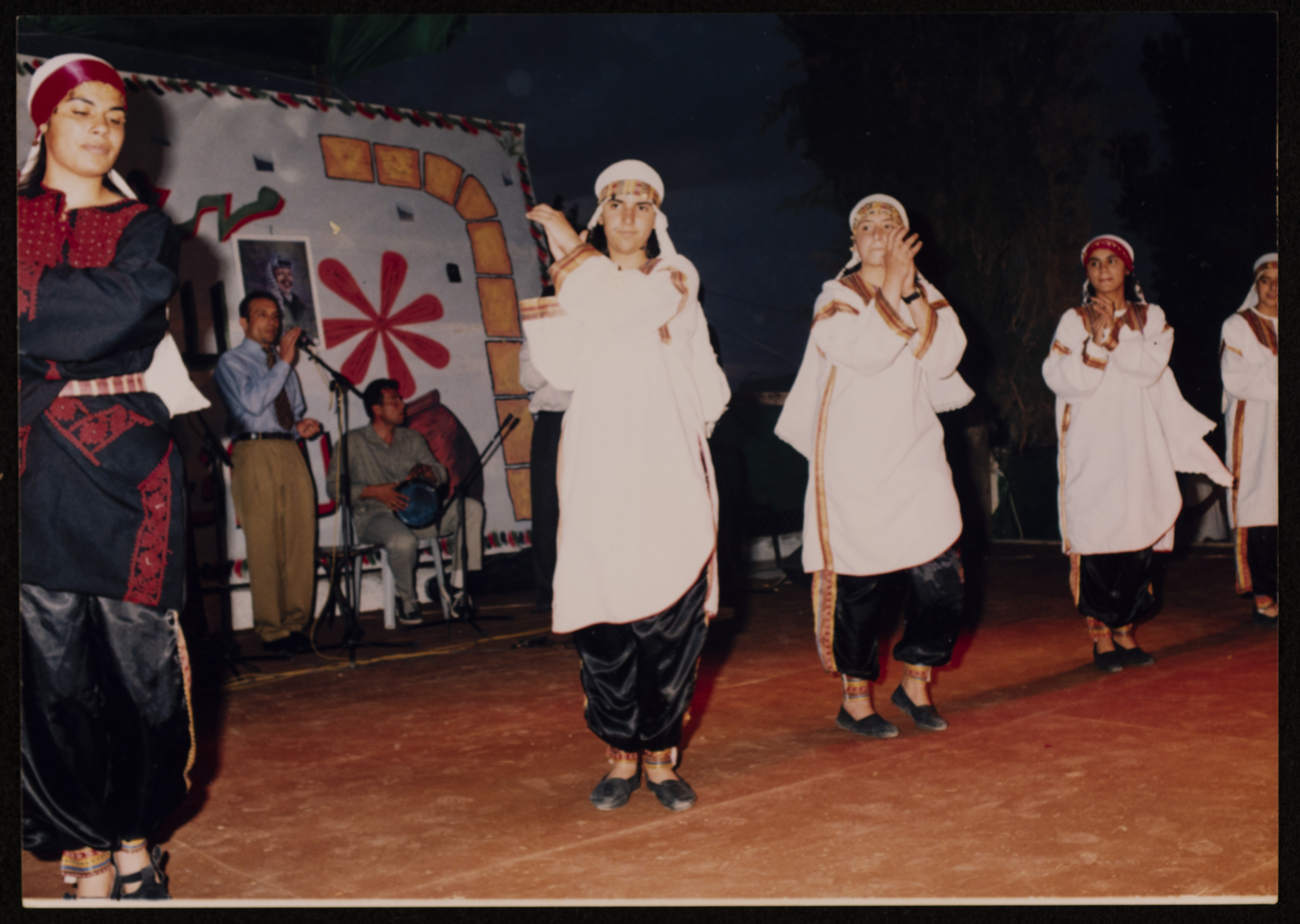 صورة من عرض فرقة دبكة أثناء فعاليات مهرجان صفا للتراث والثقافة والفنون الذي استمر لمدة خمسة أيام في مدرسة بنات قرية صفا عام 1998 من تنظيم مركز حنظلة الثقافي.
