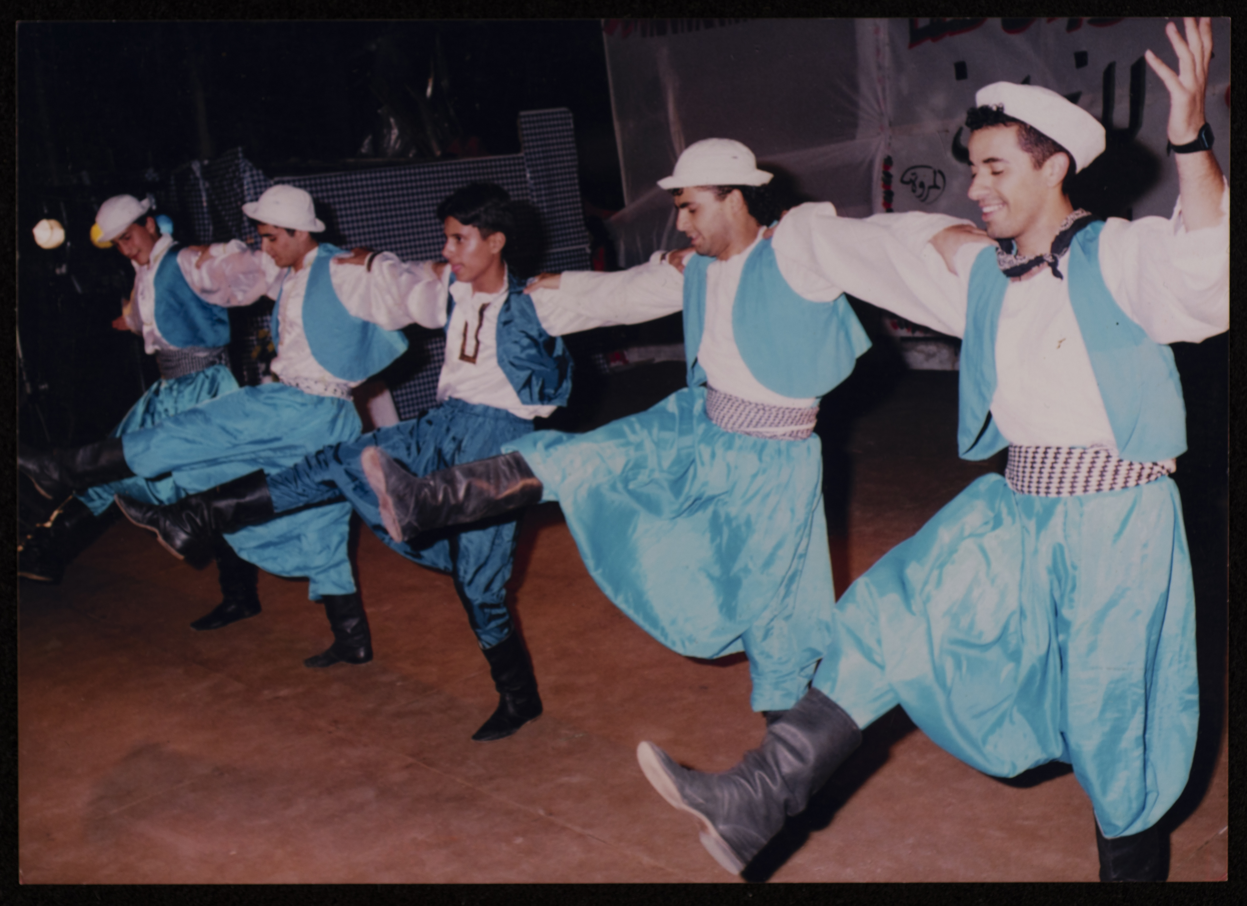 صورة من عرض فرقة دبكة أثناء فعاليات مهرجان صفا للتراث والثقافة والفنون الذي استمر لمدة خمسة أيام في مدرسة بنات قرية صفا عام 1998 من تنظيم مركز حنظلة الثقافي.