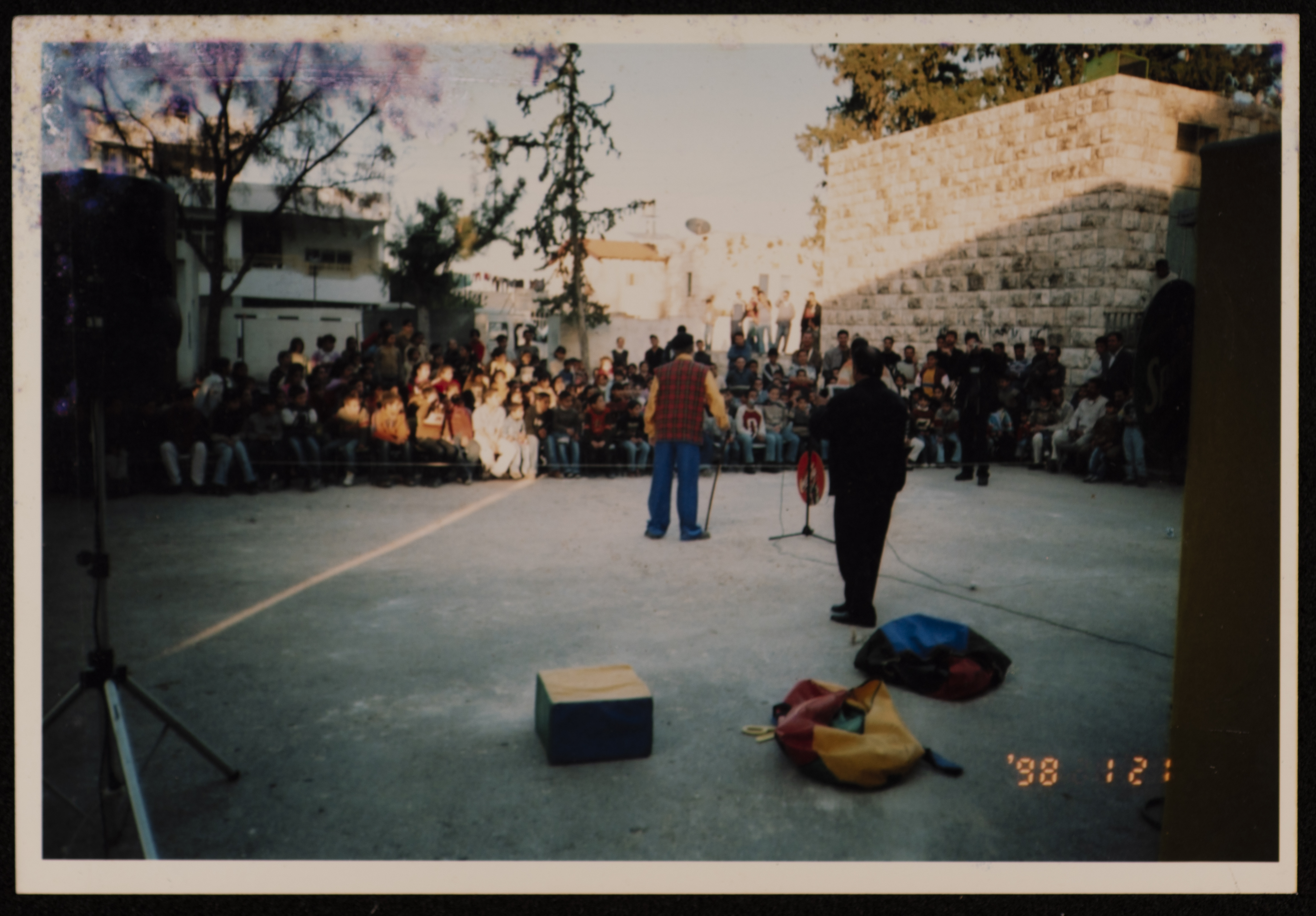 صورة التقطت خلال عرض مسرحي أثناء فعاليات مهرجان صفا للتراث والثقافة والفنون الذي أقامه مركز حنظلة الثقافي واستمر لمدة خمسة أيام في مدرسة بنات صفا عام 1998.