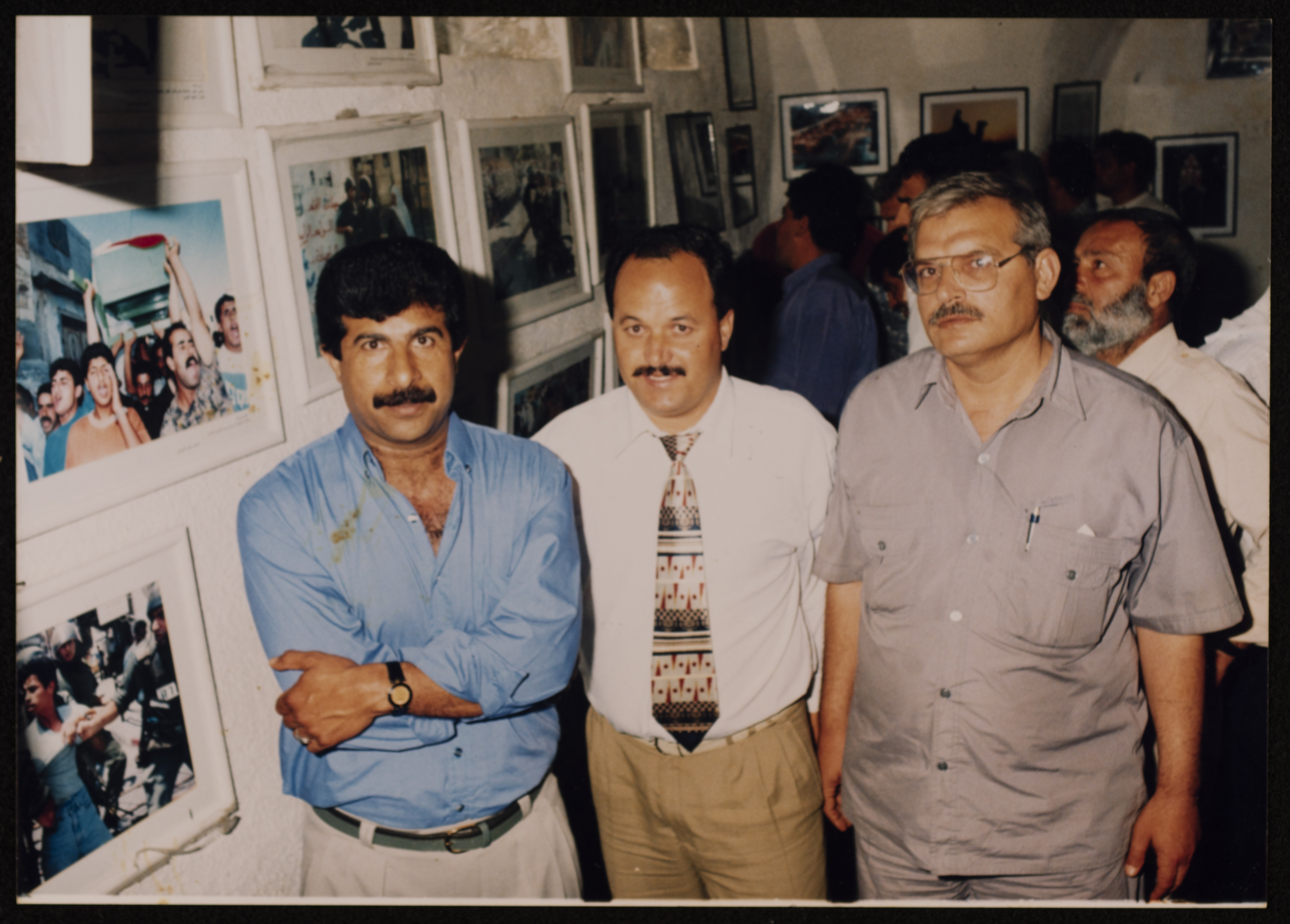 صورة يظهر فيها، من اليسار لليمين، نمر عطية البحلوز ونمر أبو أسعد وحلمي عنقاوي في معرض صور أقامه مركز حنظلة الثقافي ضمن فعاليات مهرجان صفا للتراث والثقافة والفنون الذي استمر لمدة خمسة أيام في مدرسة بنات صفا عام 1998.