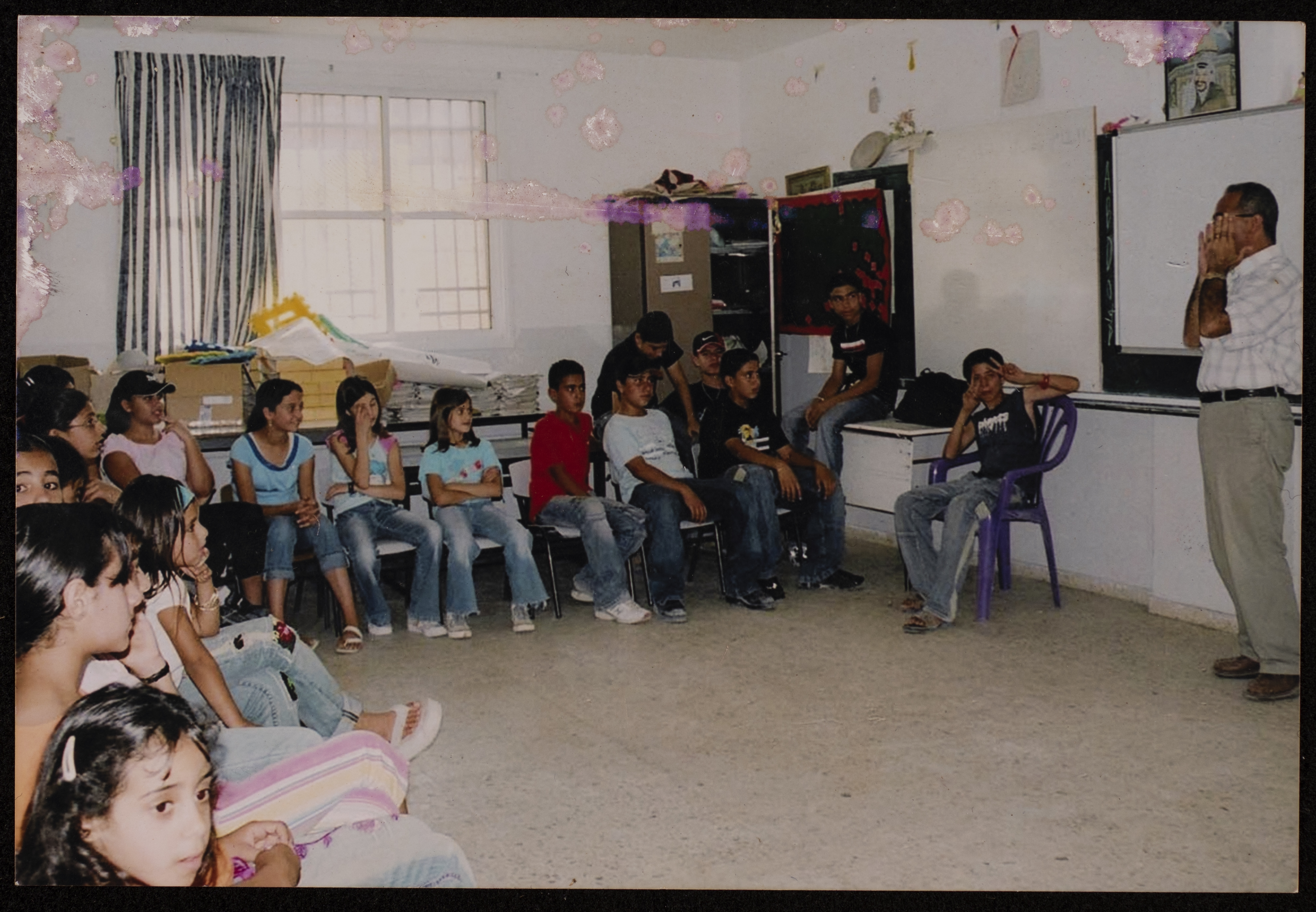 صورة لمجموعة من الأطفال أثناء المشاركة في فعاليات مخيم غسان كنفاني الصيفي الذي نظمه مركز حنظلة الثقافي في مدرسة ذكور صفا الاساسية.