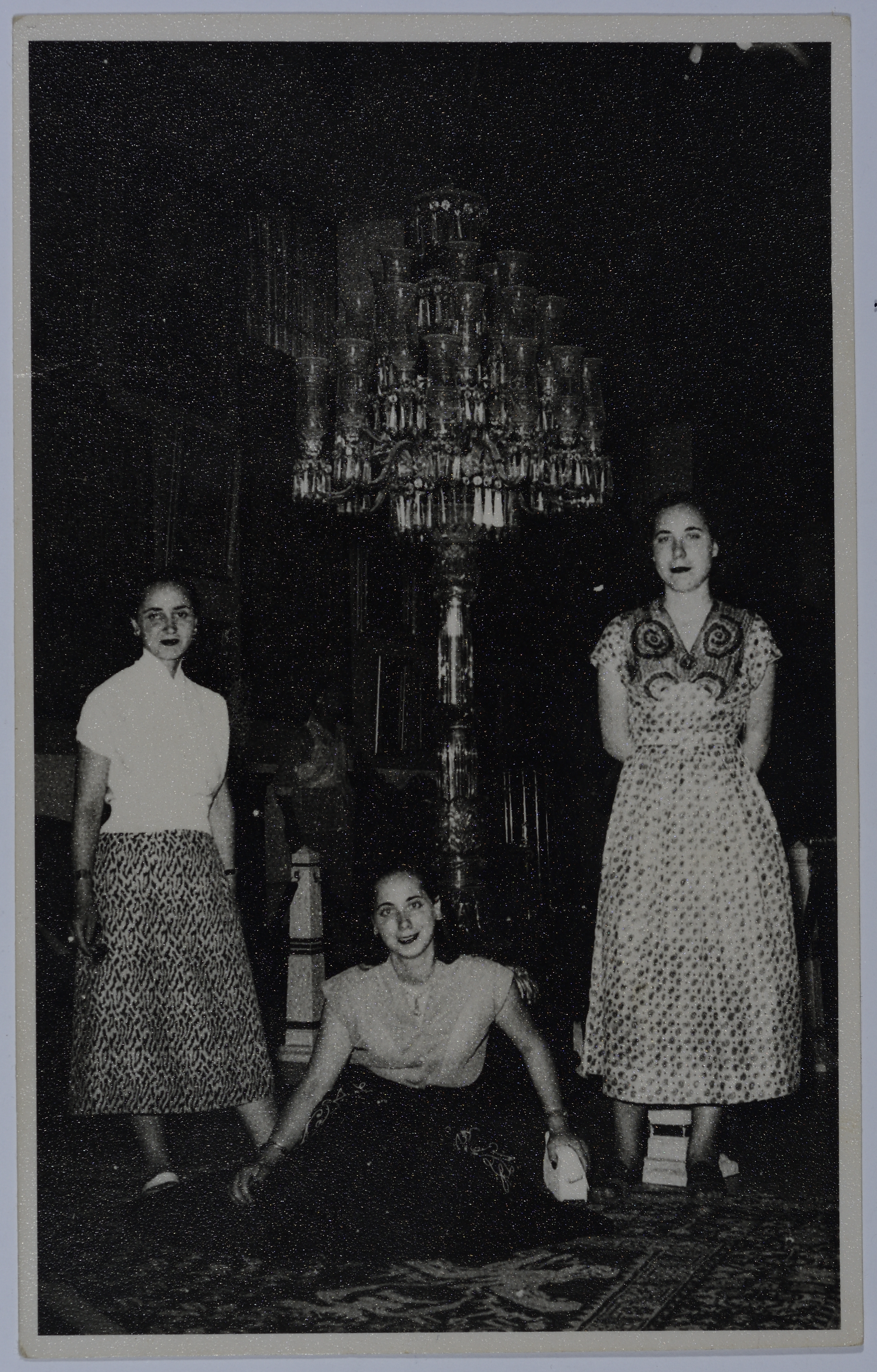 Taken on 11 August 1956, this photograph shows Mahira Dajani and two other girls in one of the palaces of King Farouk in Alexandria.