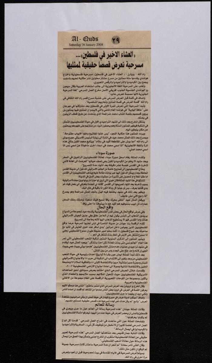 Issued on 26 January 2008, this newspaper clipping from al-Ayyam, issue no. 4318, contains an article titled, "The Last Supper in Palestine: Six Palestinian Stories Told with Tragic Comedy and Contemporary Dance." The Last Supper in Palestine is a play produced by Ashtar Theatre and performed by 6 actors in Arabic and English. The play participated in the Dancing On the Edge Festival in the Netherlands in 2007.