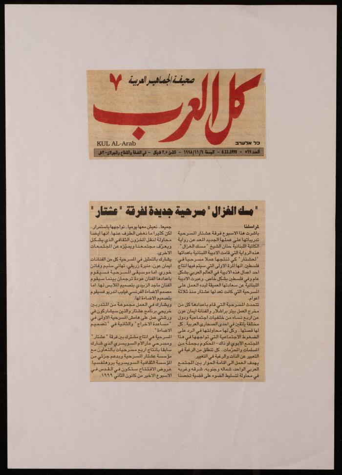 "Misk al-Ghazal...A New Play by Ashtar Theatre", a Newspaper Clipping from Kul al-Arab, 6 November 1998