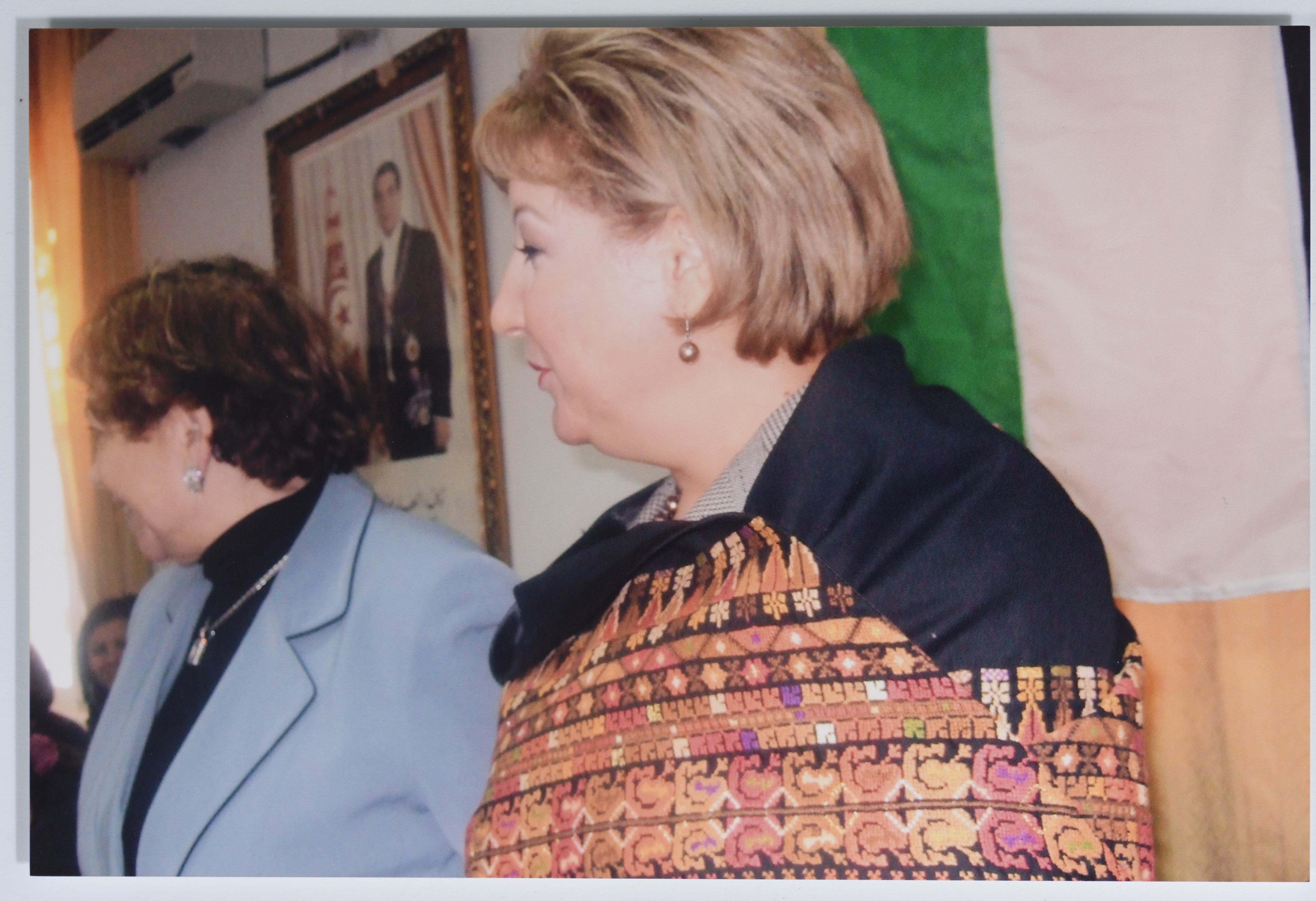 صورة ملونة تظهر بها السيدة انتصار الوزير (أم جهاد) ووزيرة المرأة التونسية خلال لقاء وفد لاتحاد العام للمرأة الفلسطينية في تونس.