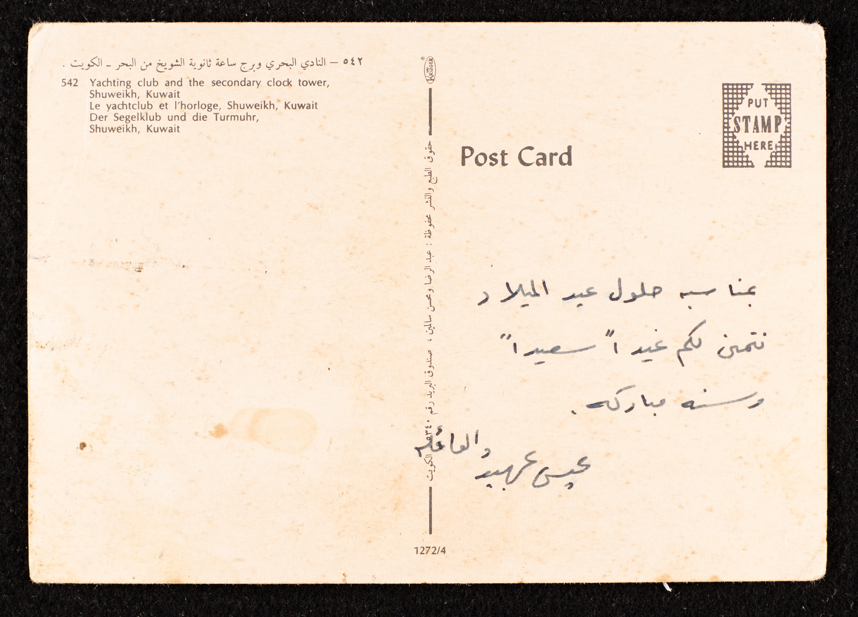 An undated postcard card from Issa Arbeed and his family sent while accomodating in Kuwait in celebration of Christmas and the new year.