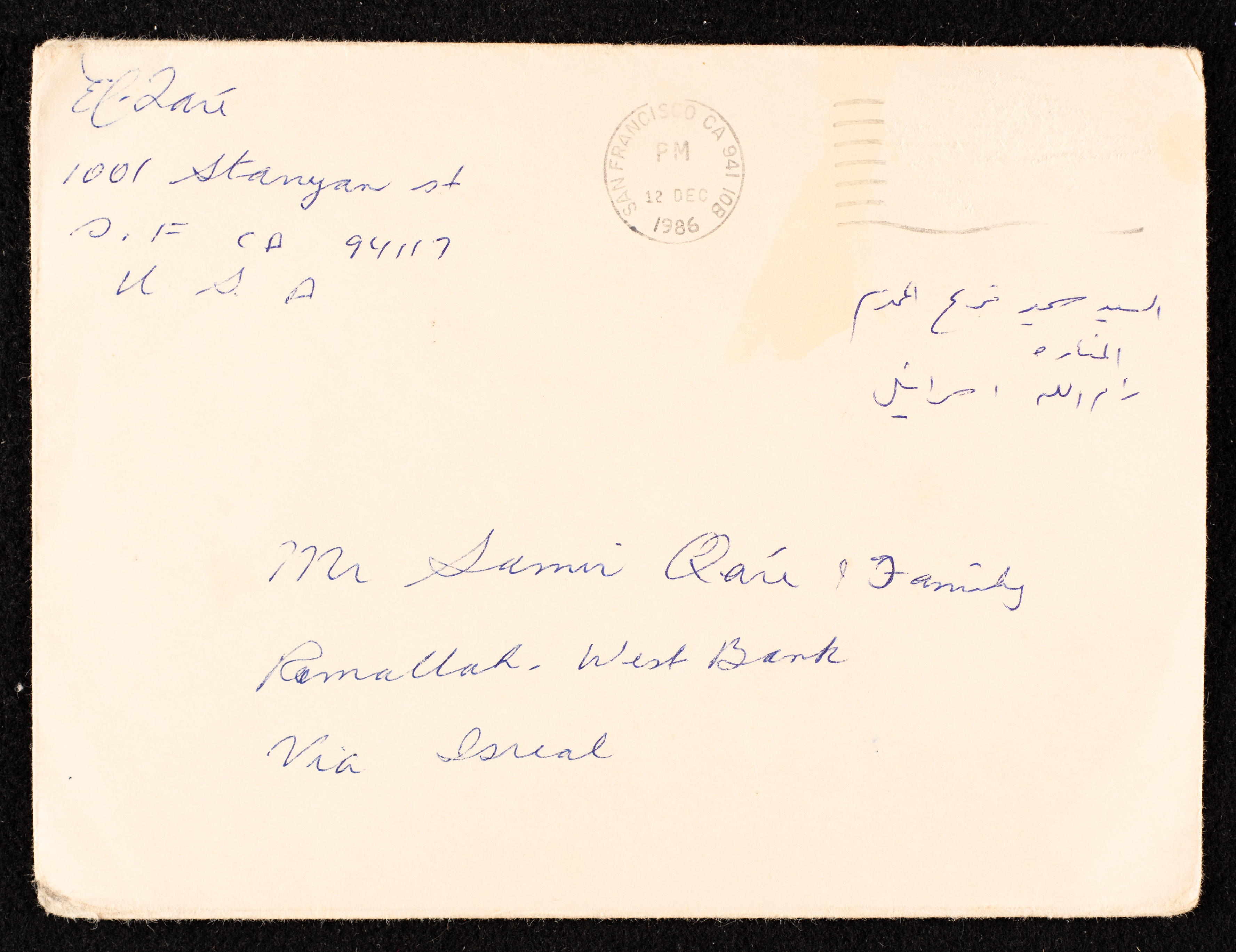 Sent on 12 December 1986, this document shows a letter envelope addressed to Fo'ad Qare from Ramallah.