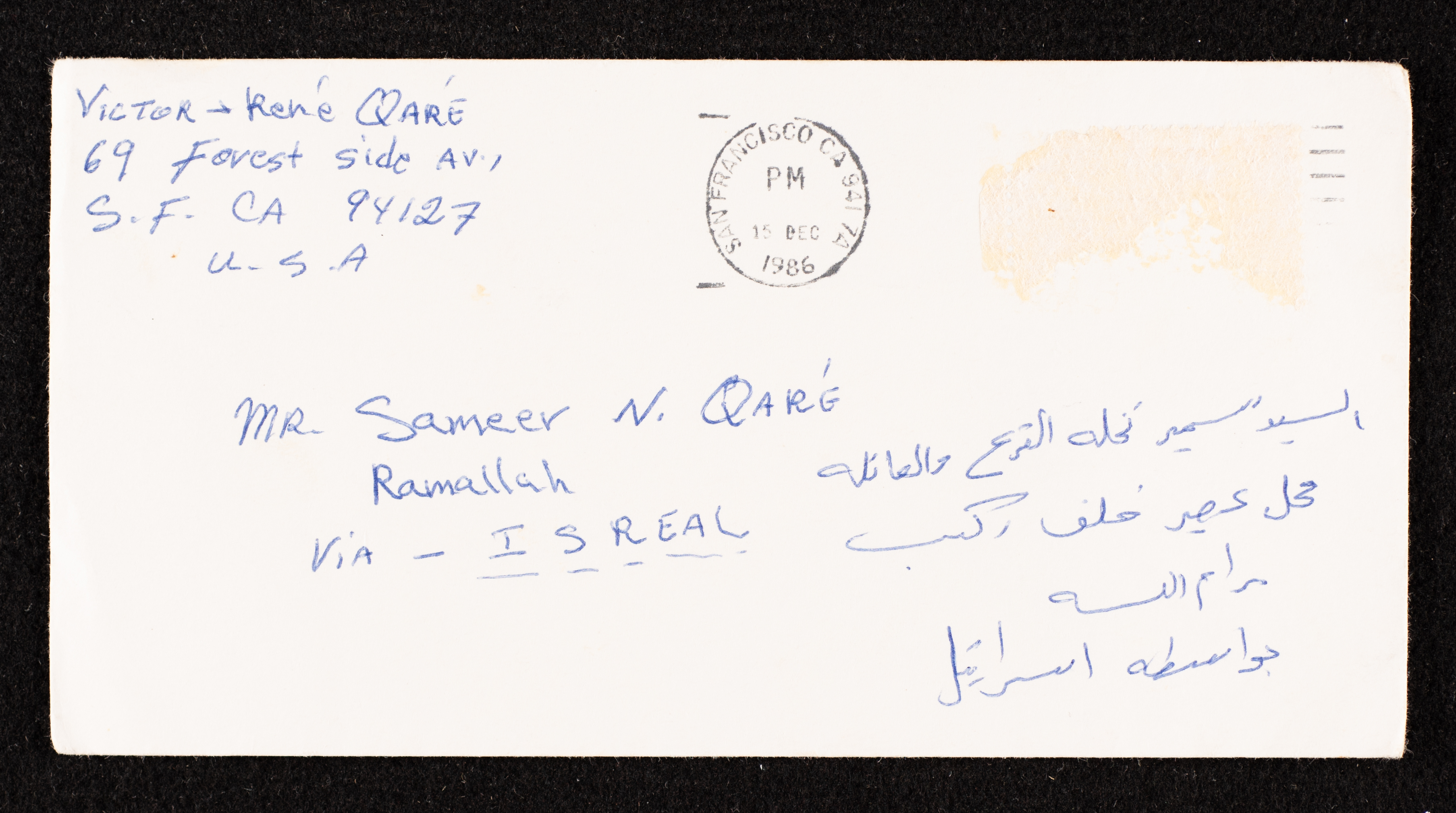 Dated 15 December 1986, this document shows a letter envelop addressed from Victor Qare residing in the United States of America to Fo'ad Nakhleh Qare, the owner of the juice shop behind Rokab's street in downtown Ramallah.