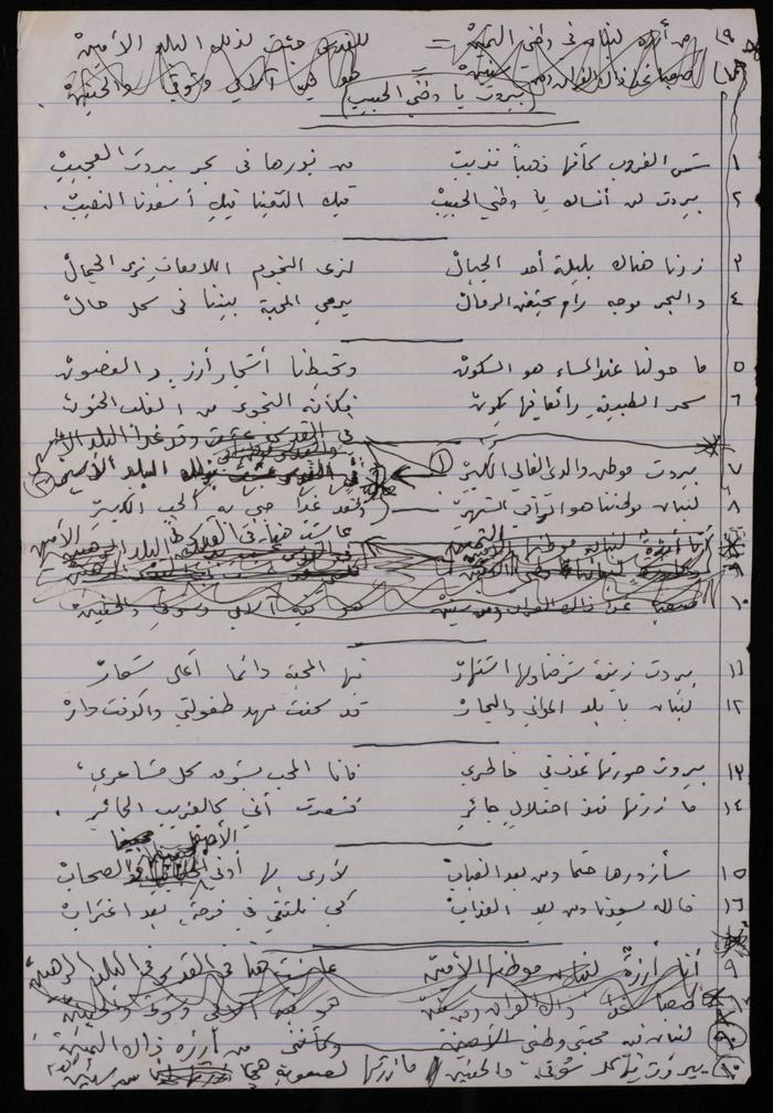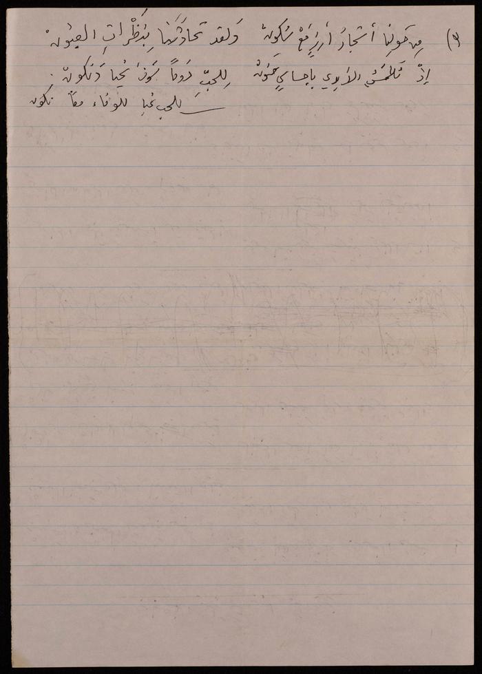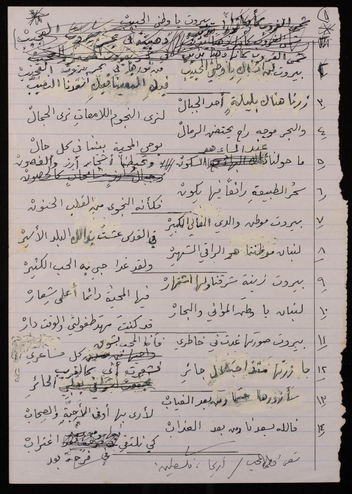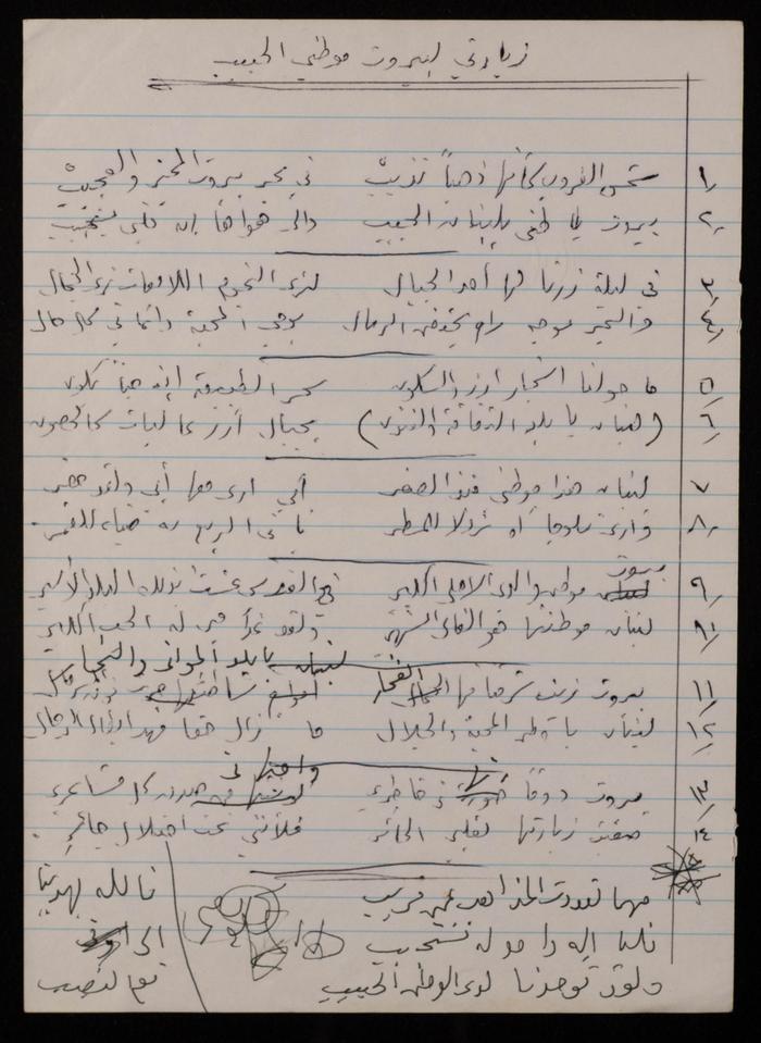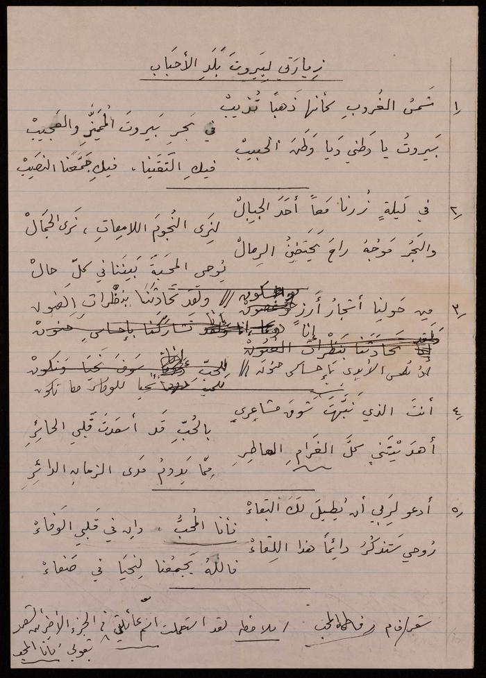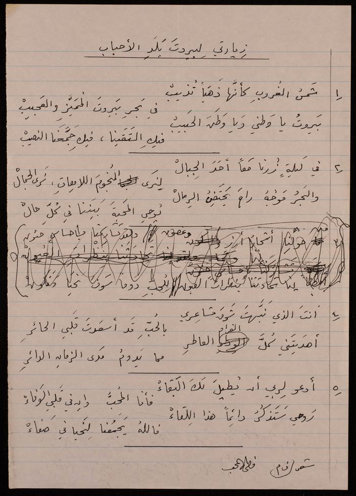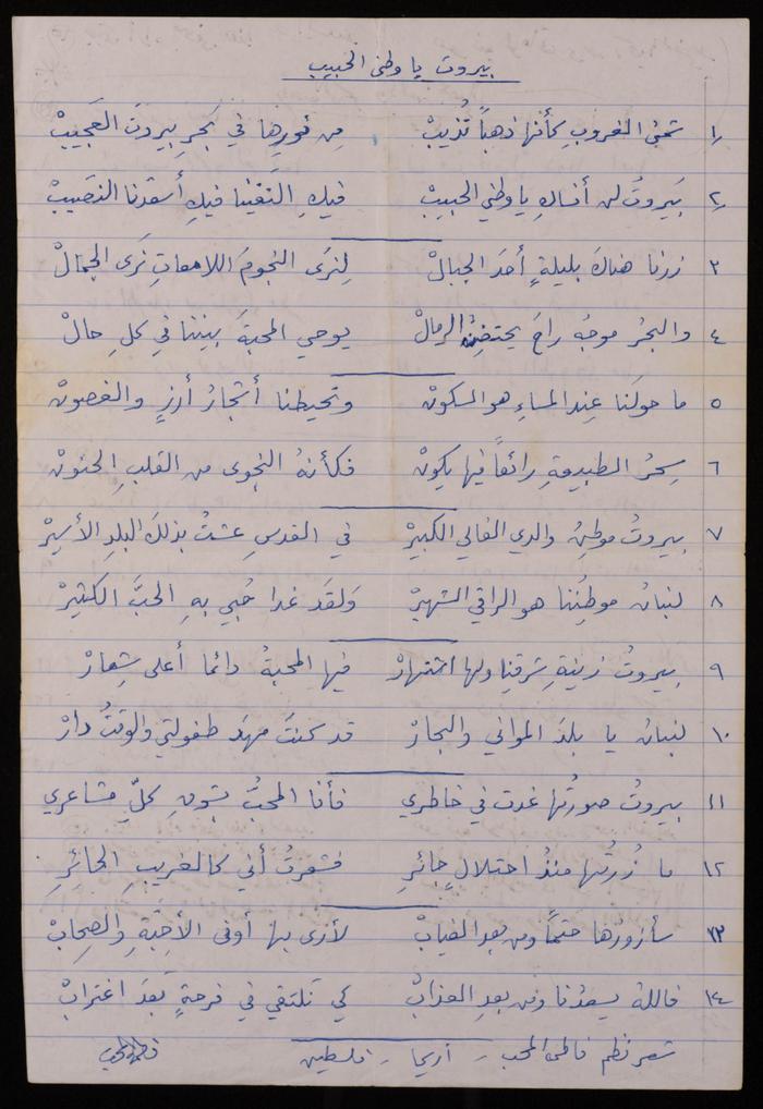Found in the Omar al-Jallad Collection, this handwritten document shows a poem by artist Fatima al-Muhib titled "Beirut My Lovely Home" where she describes her love for Beirut, its sea and mountain, and her longing to visit.