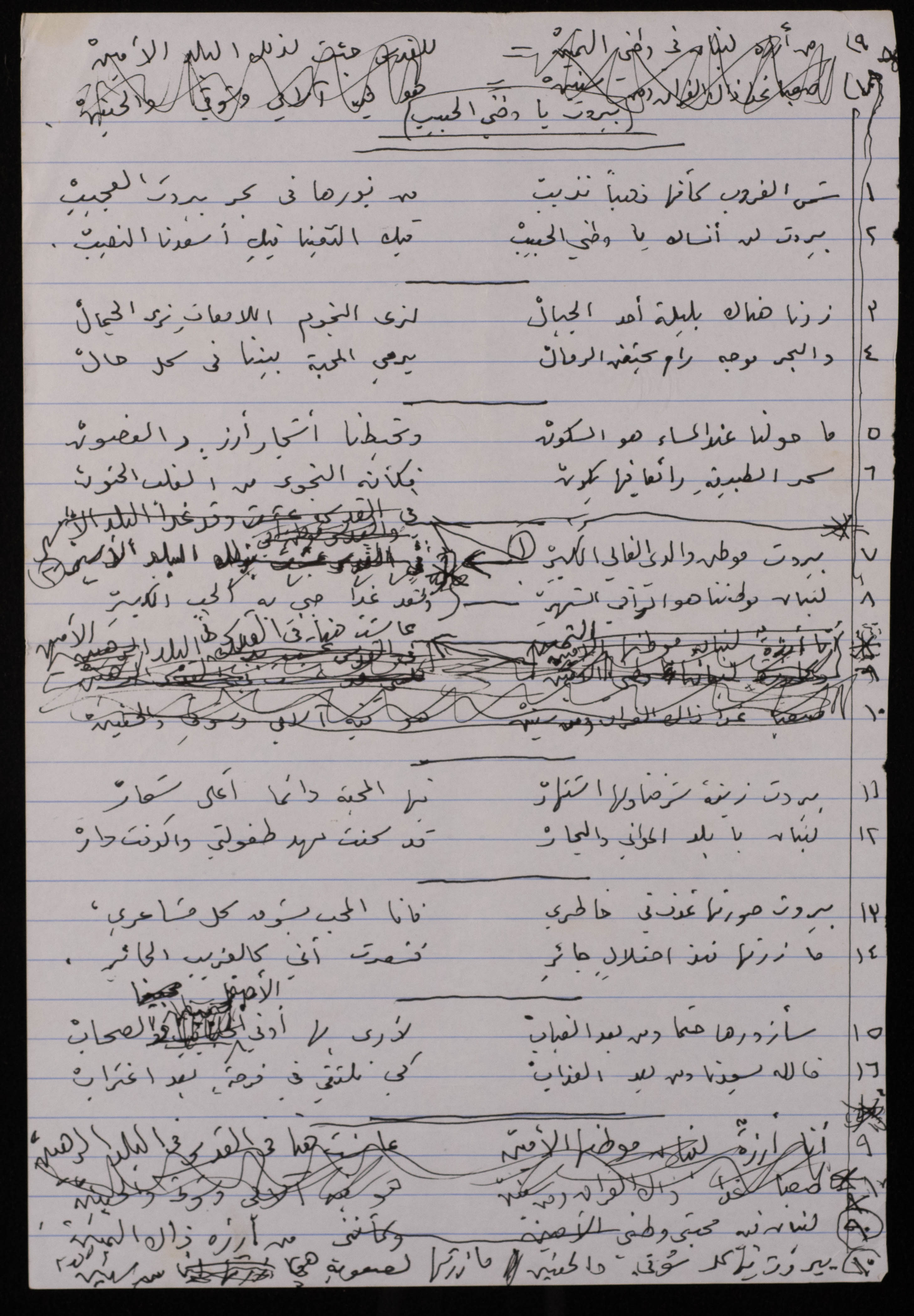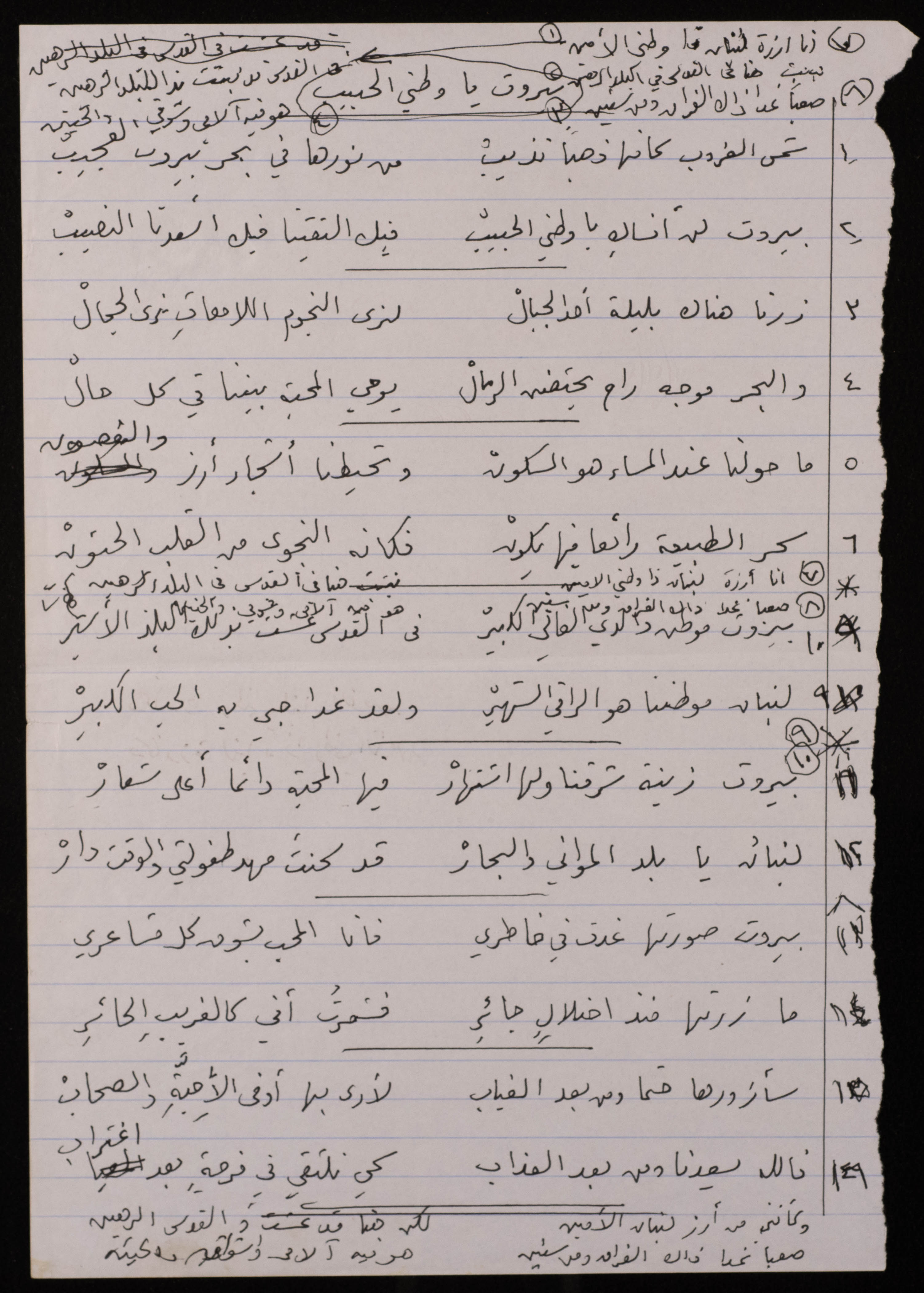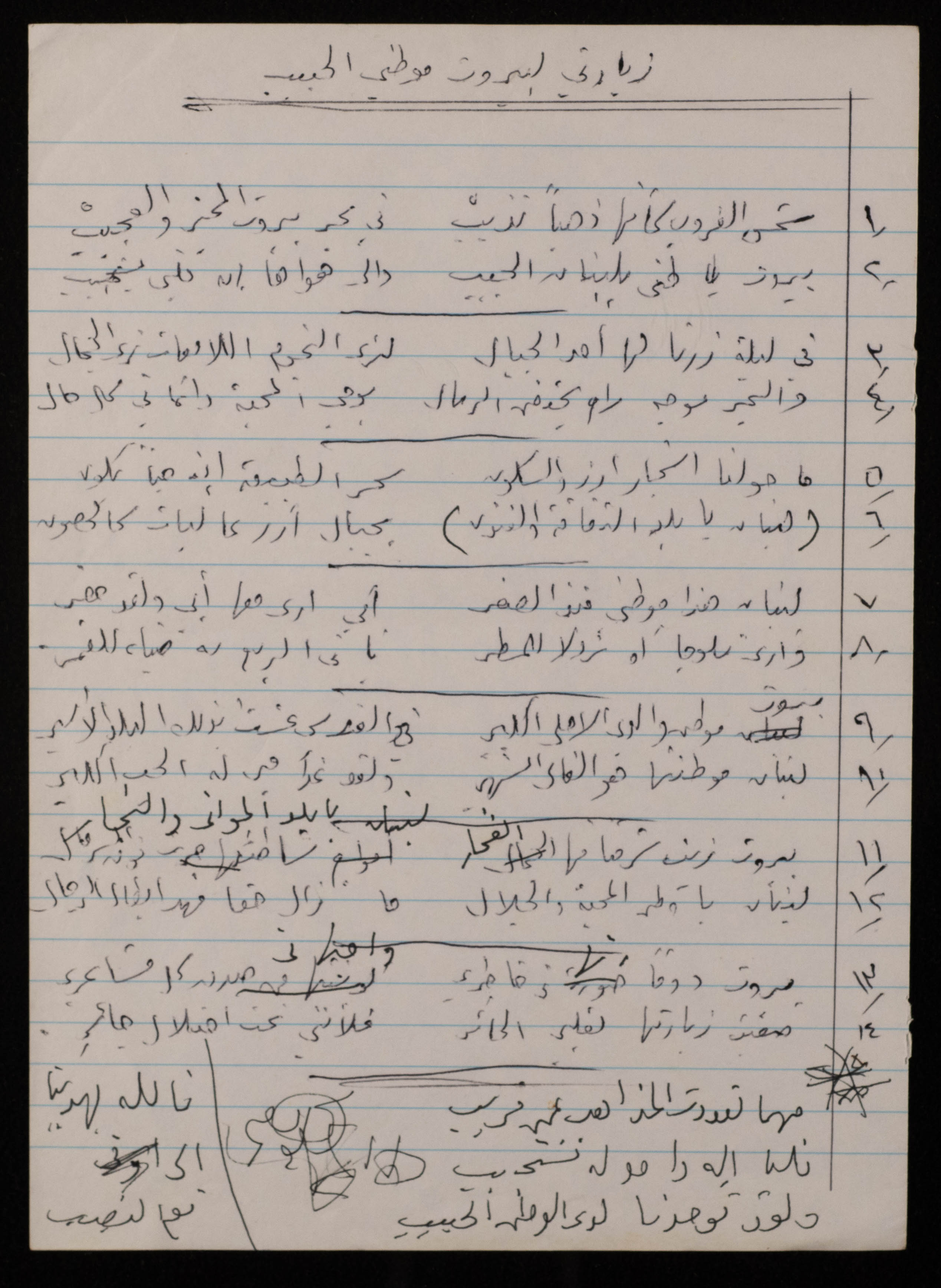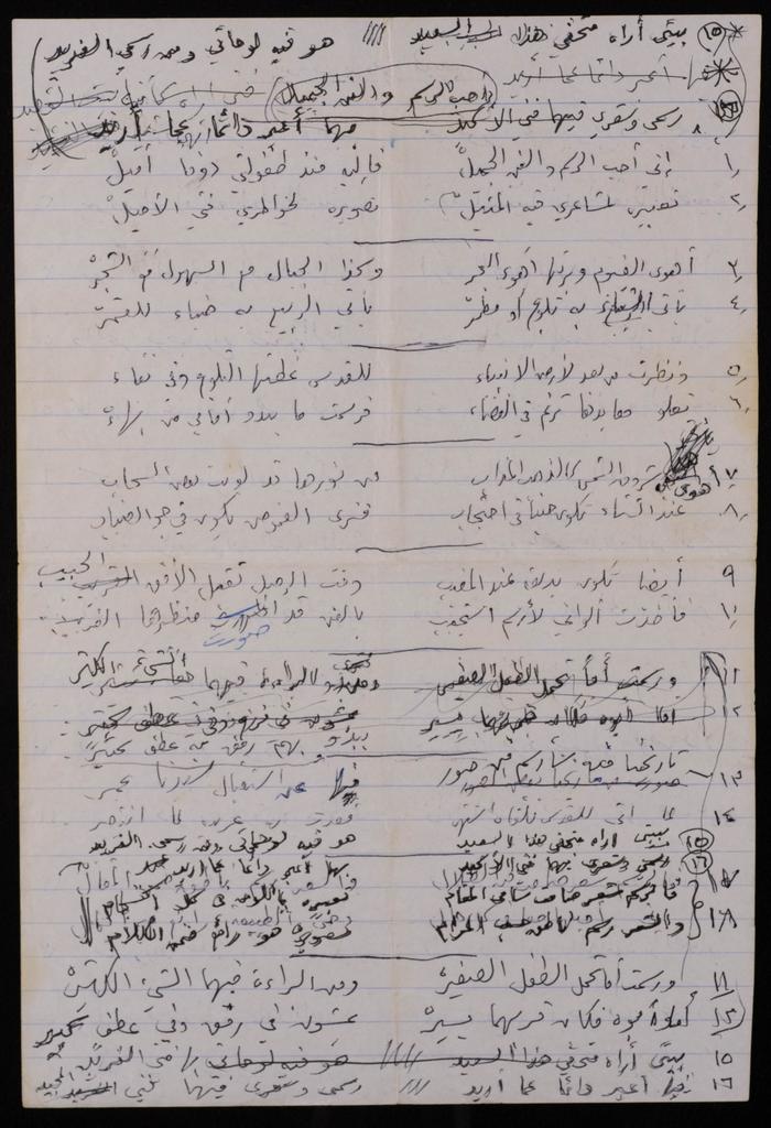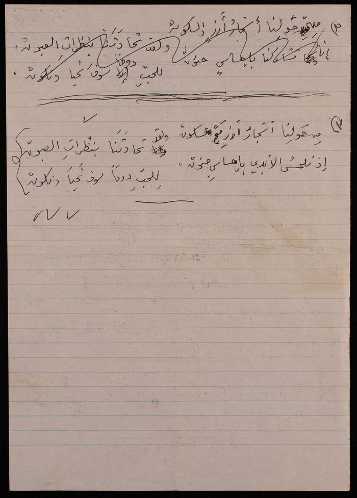 Found in the Omar al-Jallad Collection, this handwritten document shows a poem by artist Fatima al-Muhib titled "Beirut My Lovely Home" where she describes her love for Beirut, its sea and mountain, and her longing to visit.