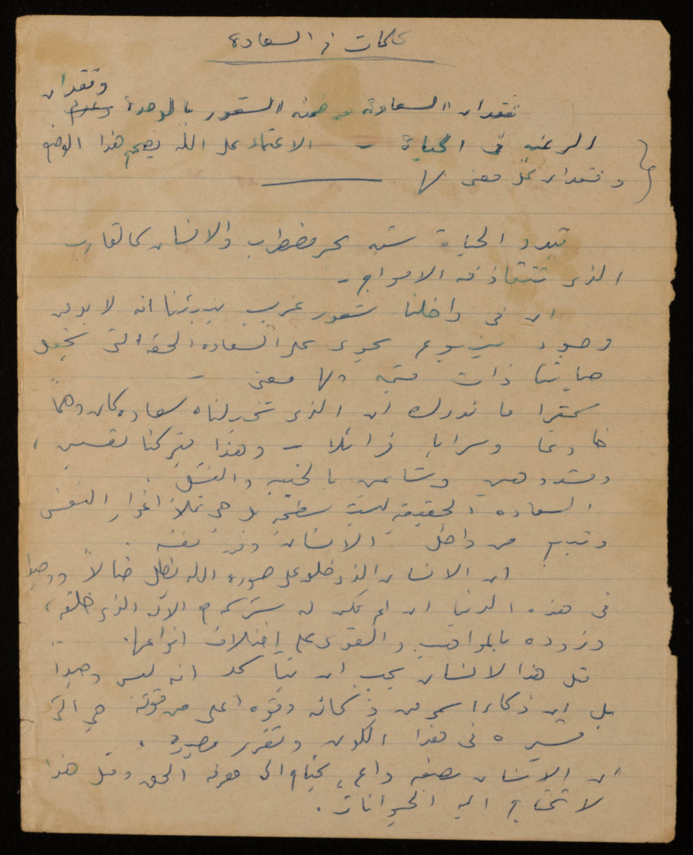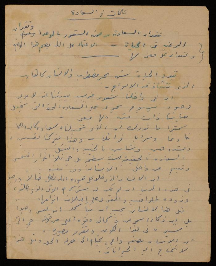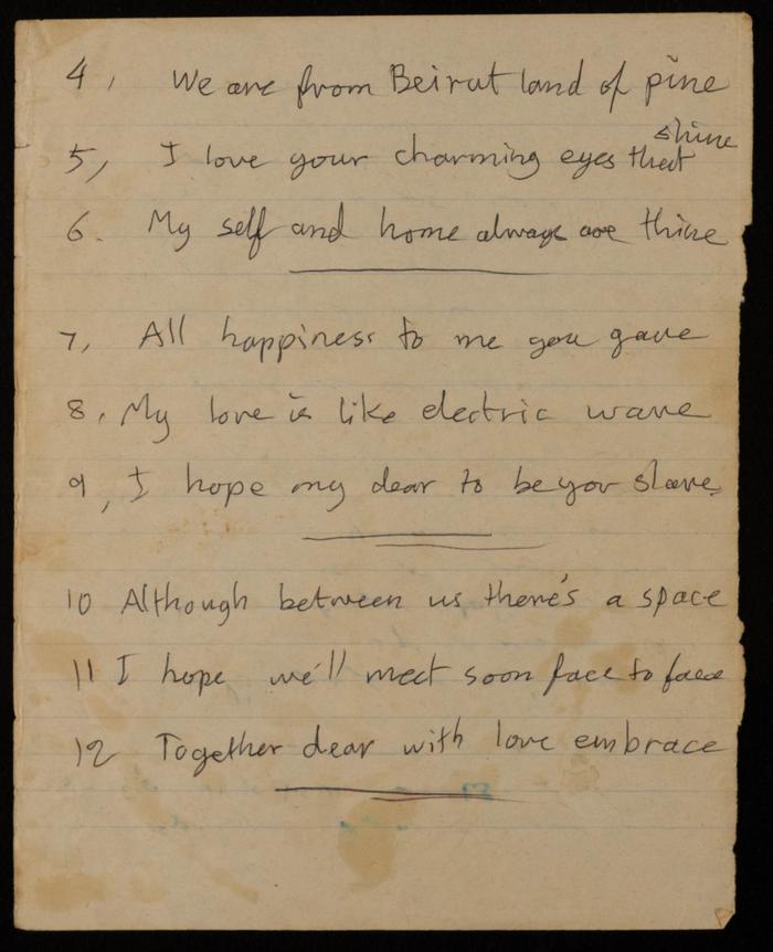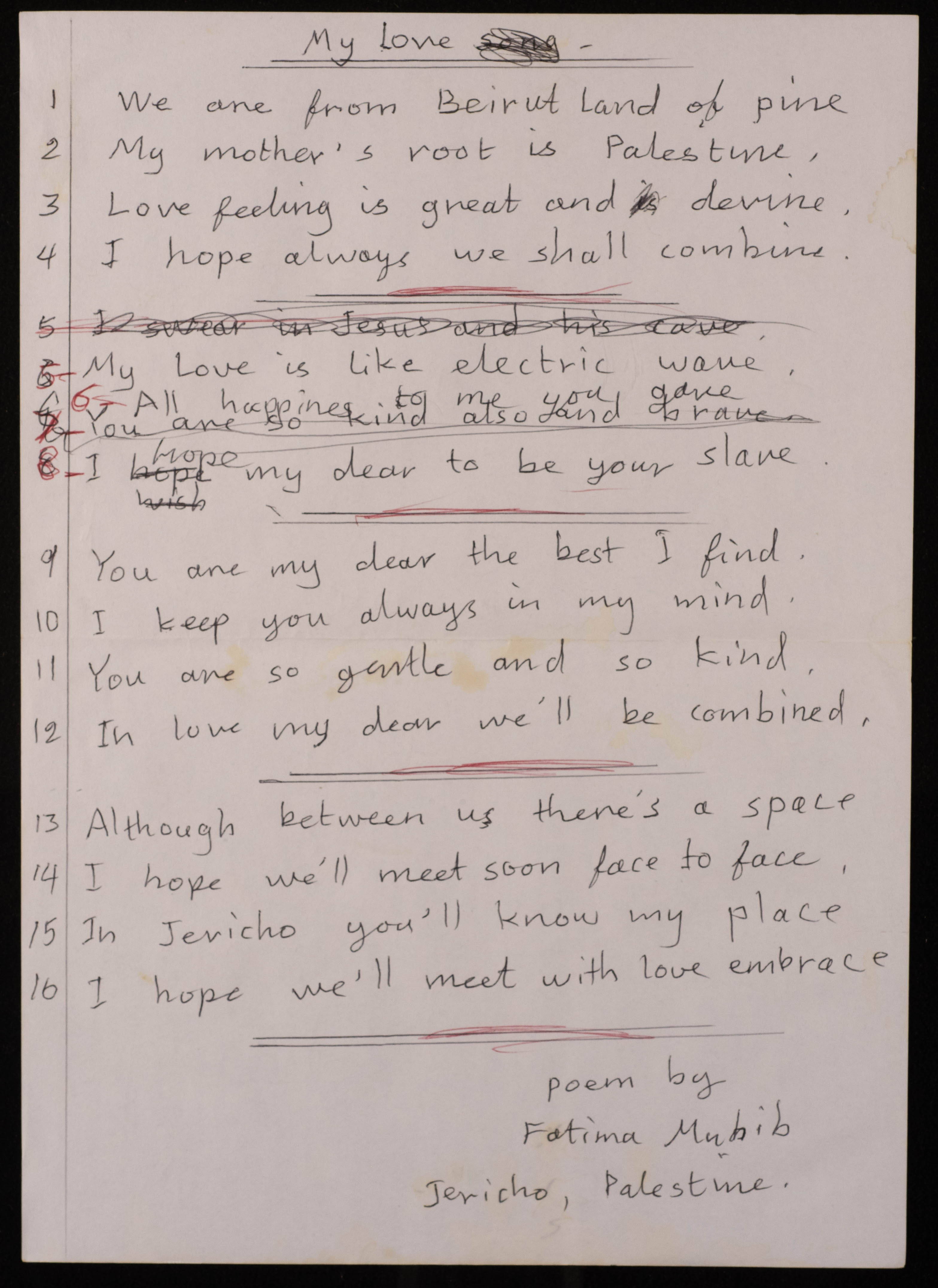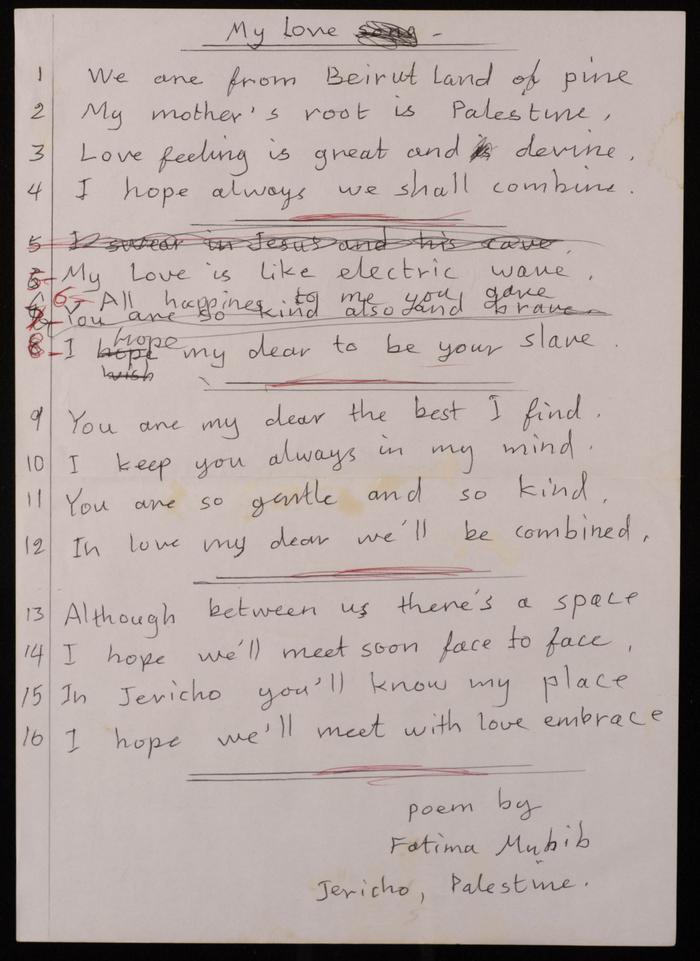 وثيقة مكتوبة بخط اليد باللغة الإنجليزية، وُجدت في مجموعة عمر الجلّاد الأرشيفية، وهي عبارة عن قصيدة للفنانة التشكيلية فاطمة المُحب، بعنوان: "حبي"، تصف فيها حبها للمحبوب وأمنياتها اتجاهه.