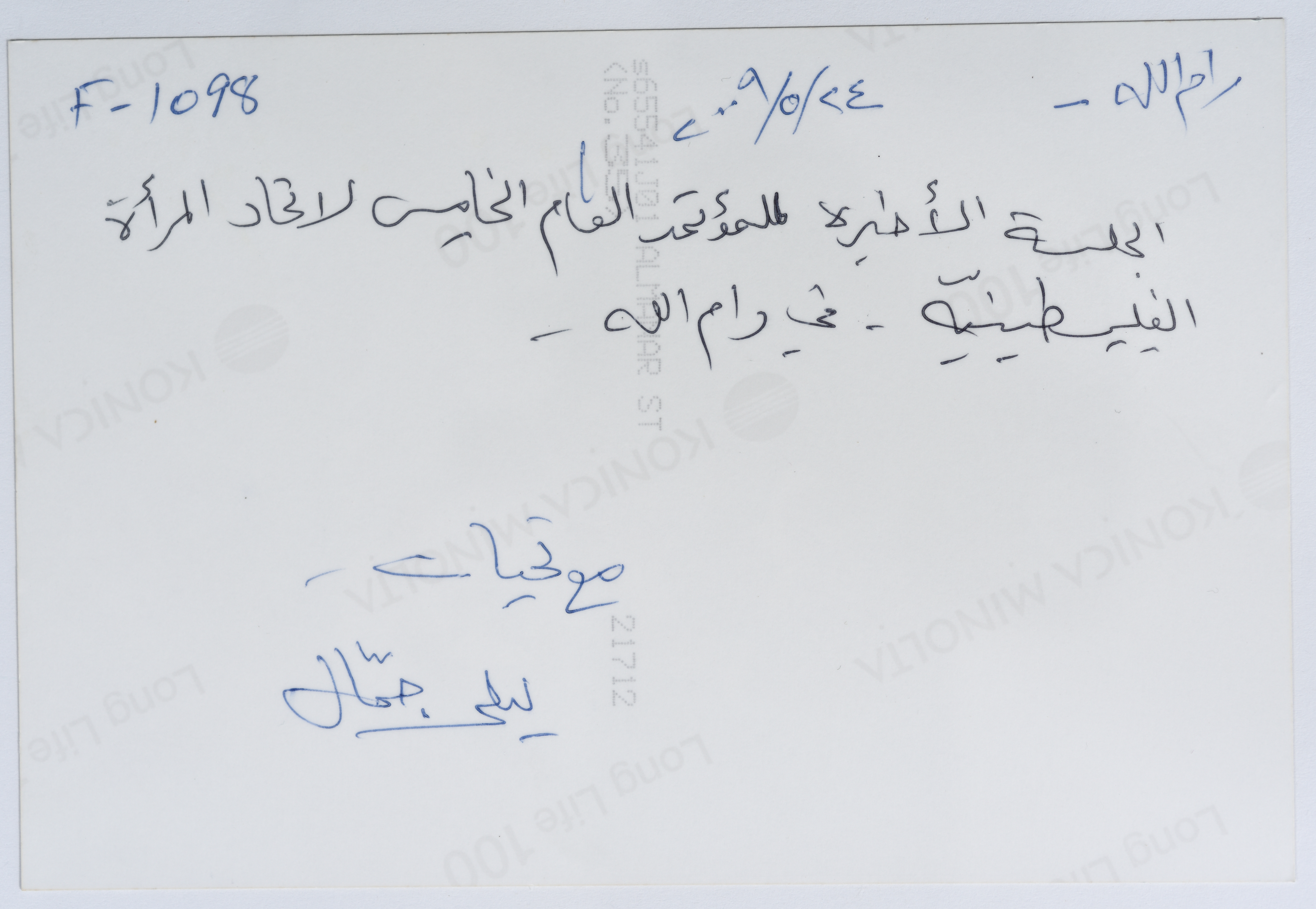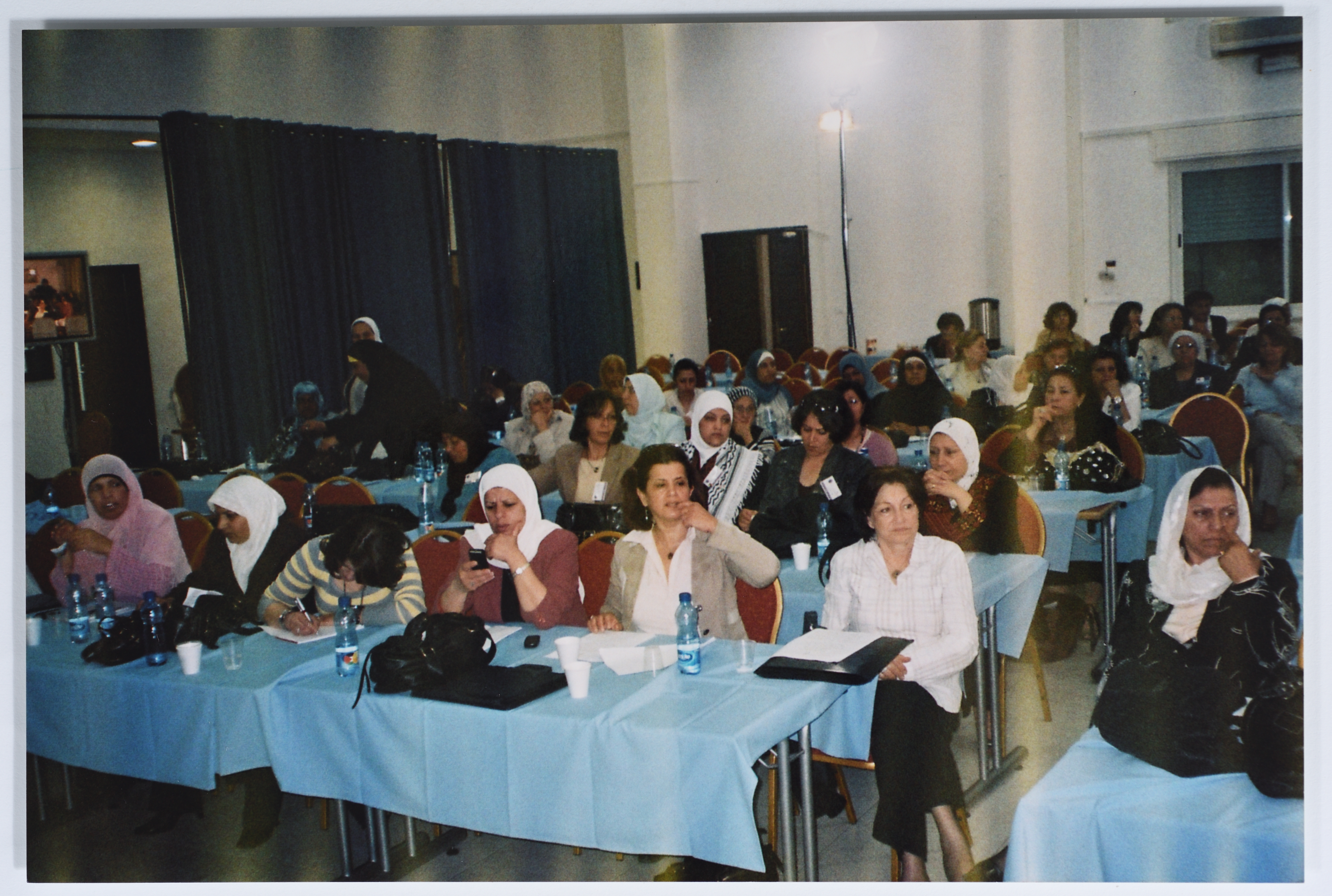 صورة ملونة من للمشاركات في الجلسة الختامية للمؤتمر الخامس للاتحاد العام للمرأة الفلسطينية المنعقد في رام الله في العام 2009.