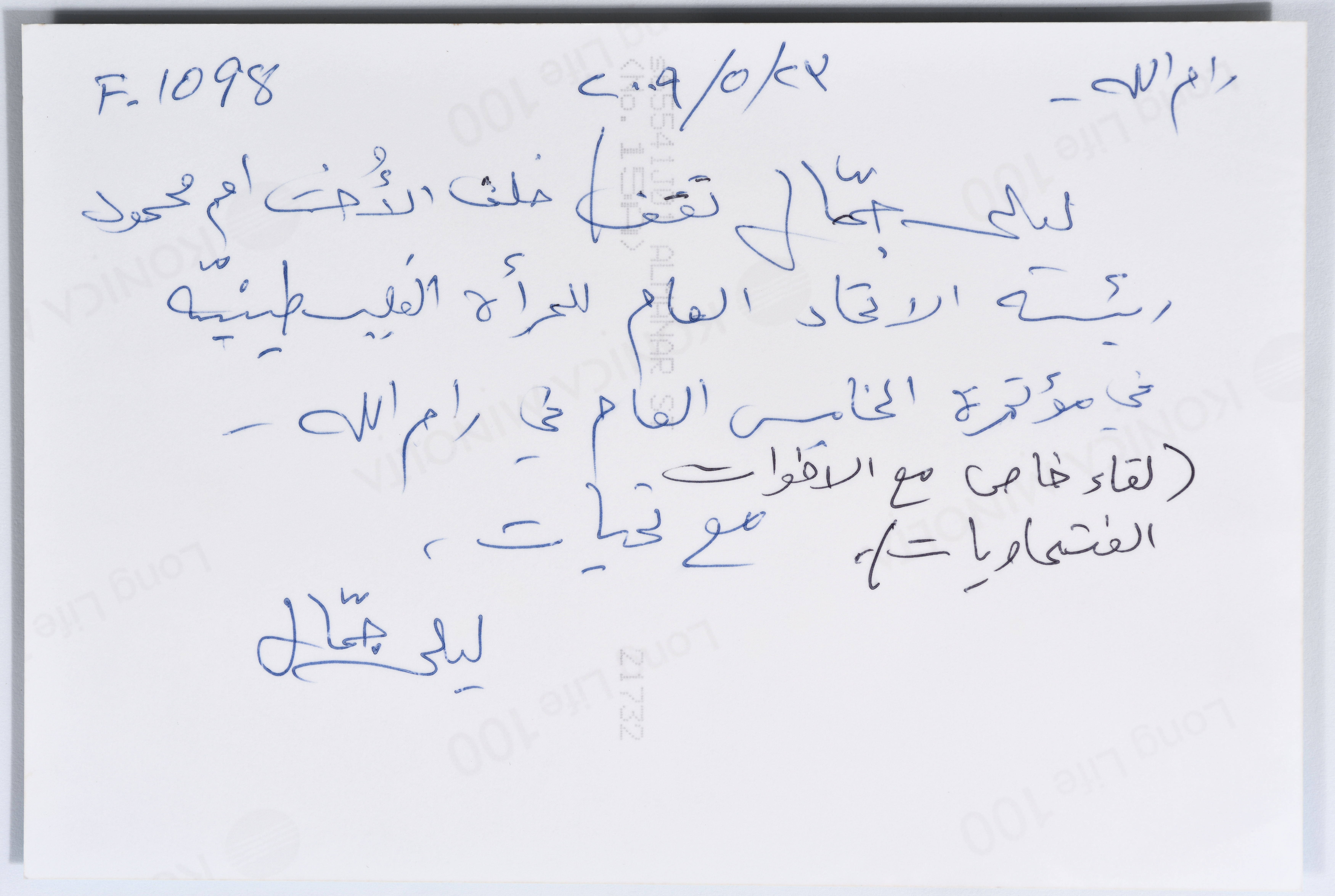 Muna al-Khalili (GPUW Sec. General), interview with PMDA researcher Lama Ghosheh, June - August 2018, non-transcript, the Palestinian Museum Digital Archive.