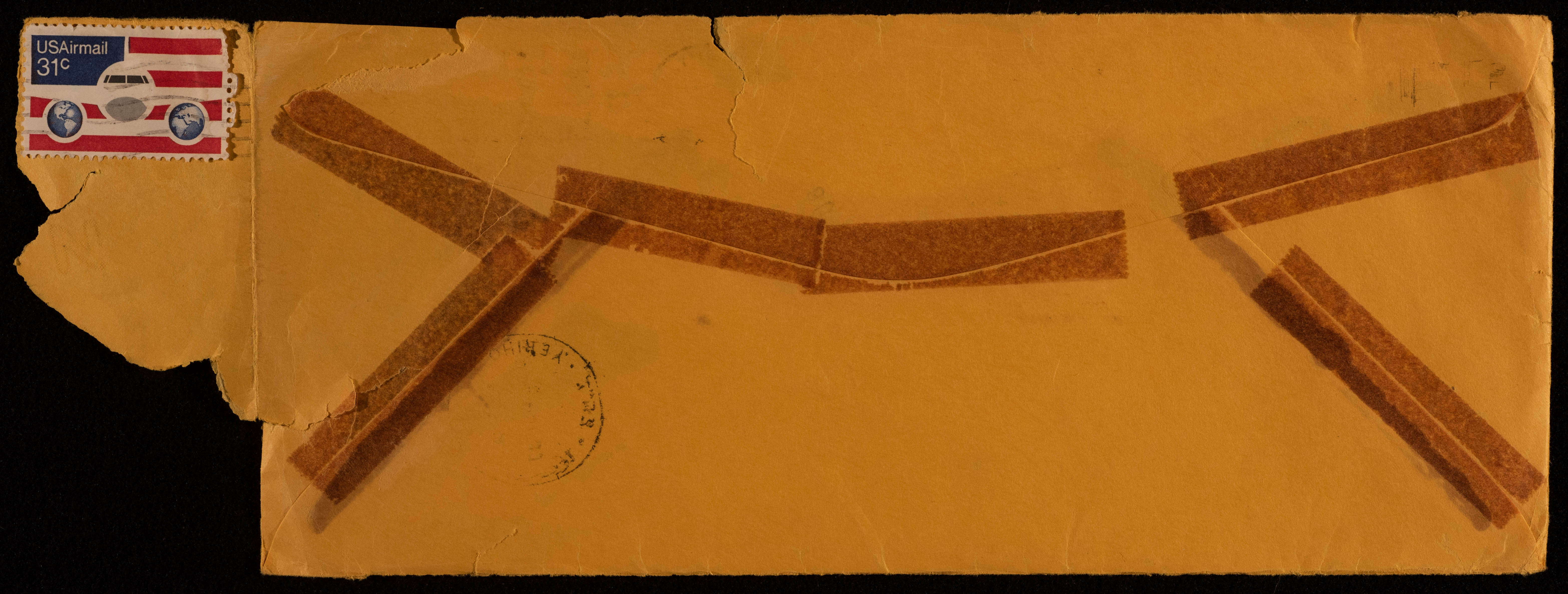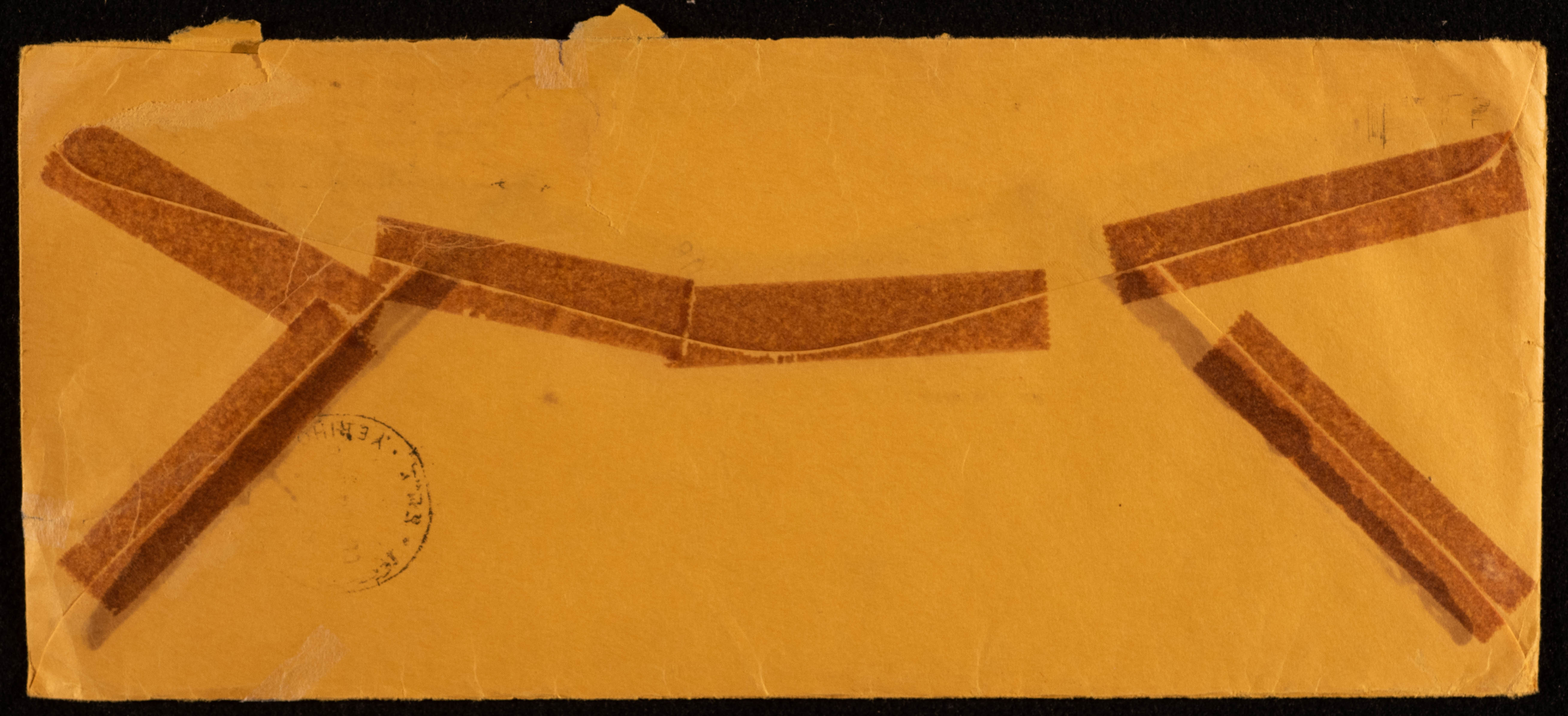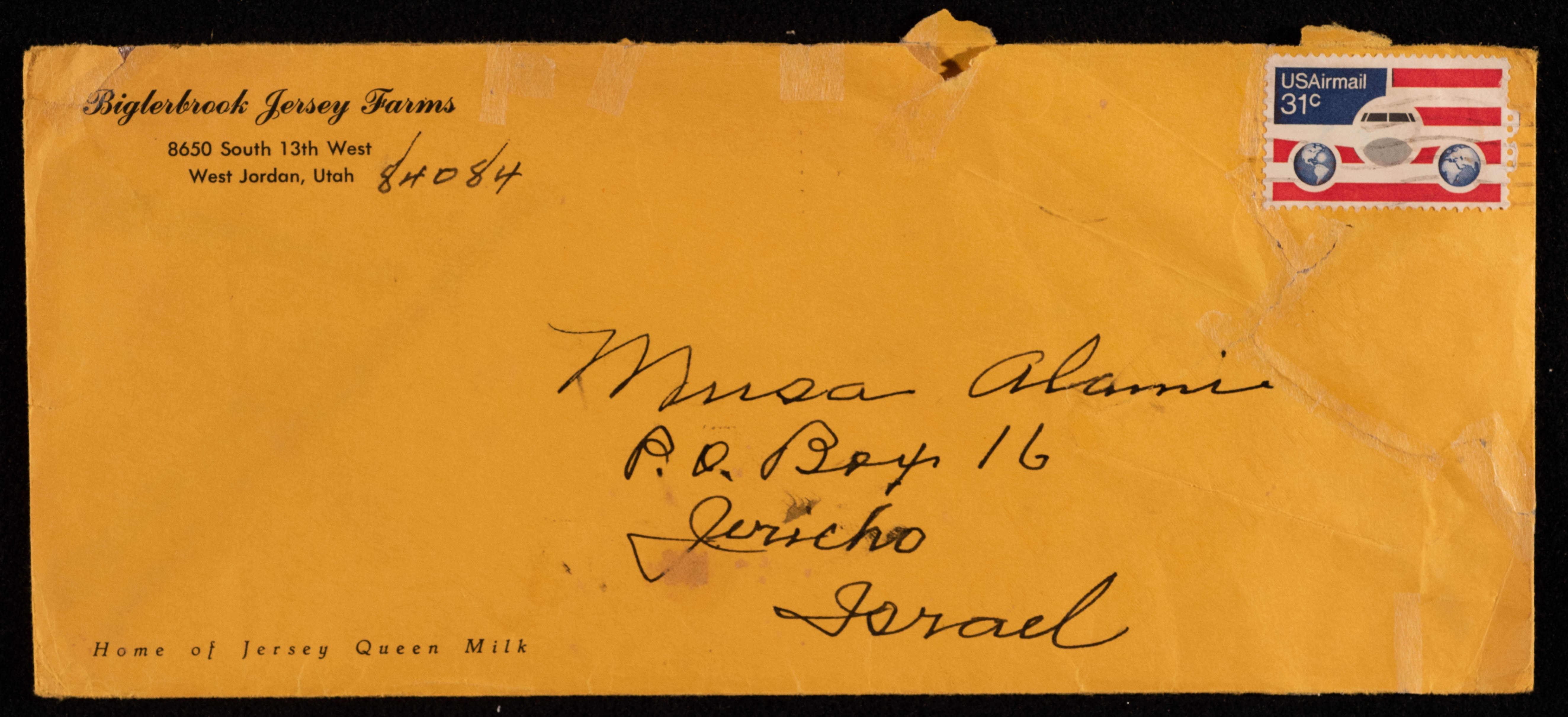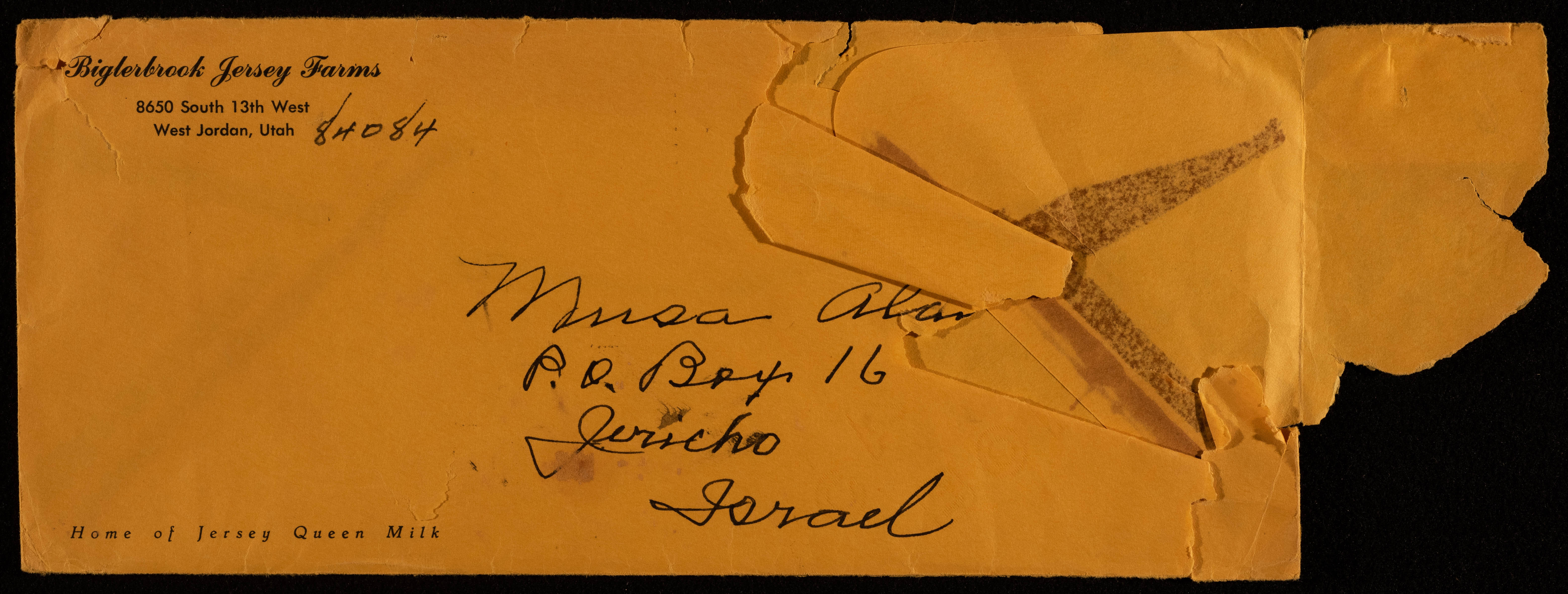 مغلف رسالة من مزارع بيجليربروك جيرسي إلى موسى العلمي، رئيس جمعية المشروع الإنشائي العربي في أريحا.