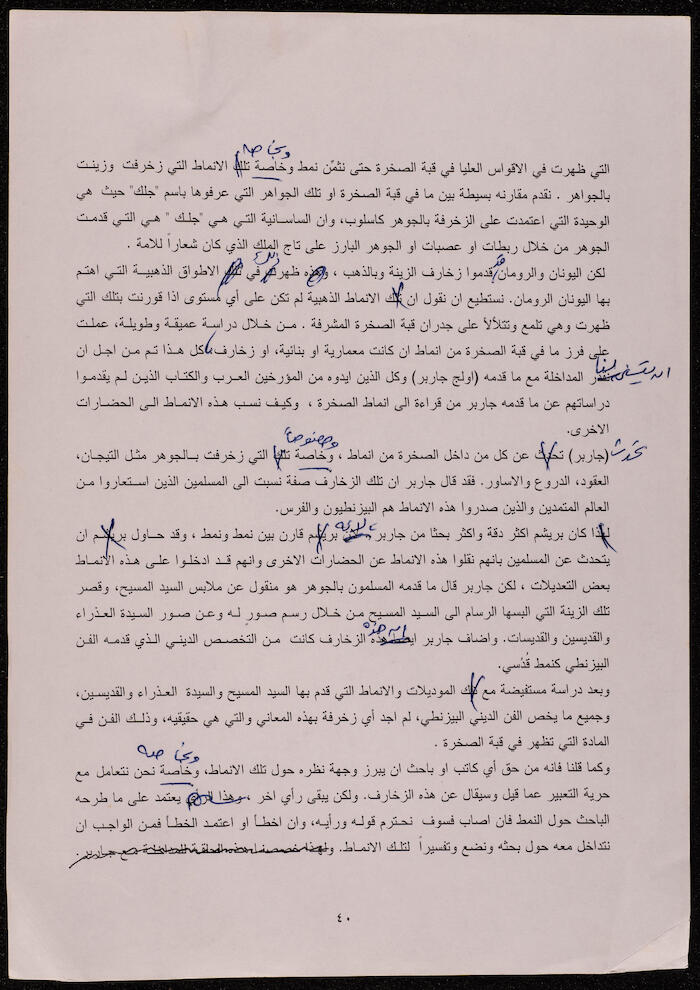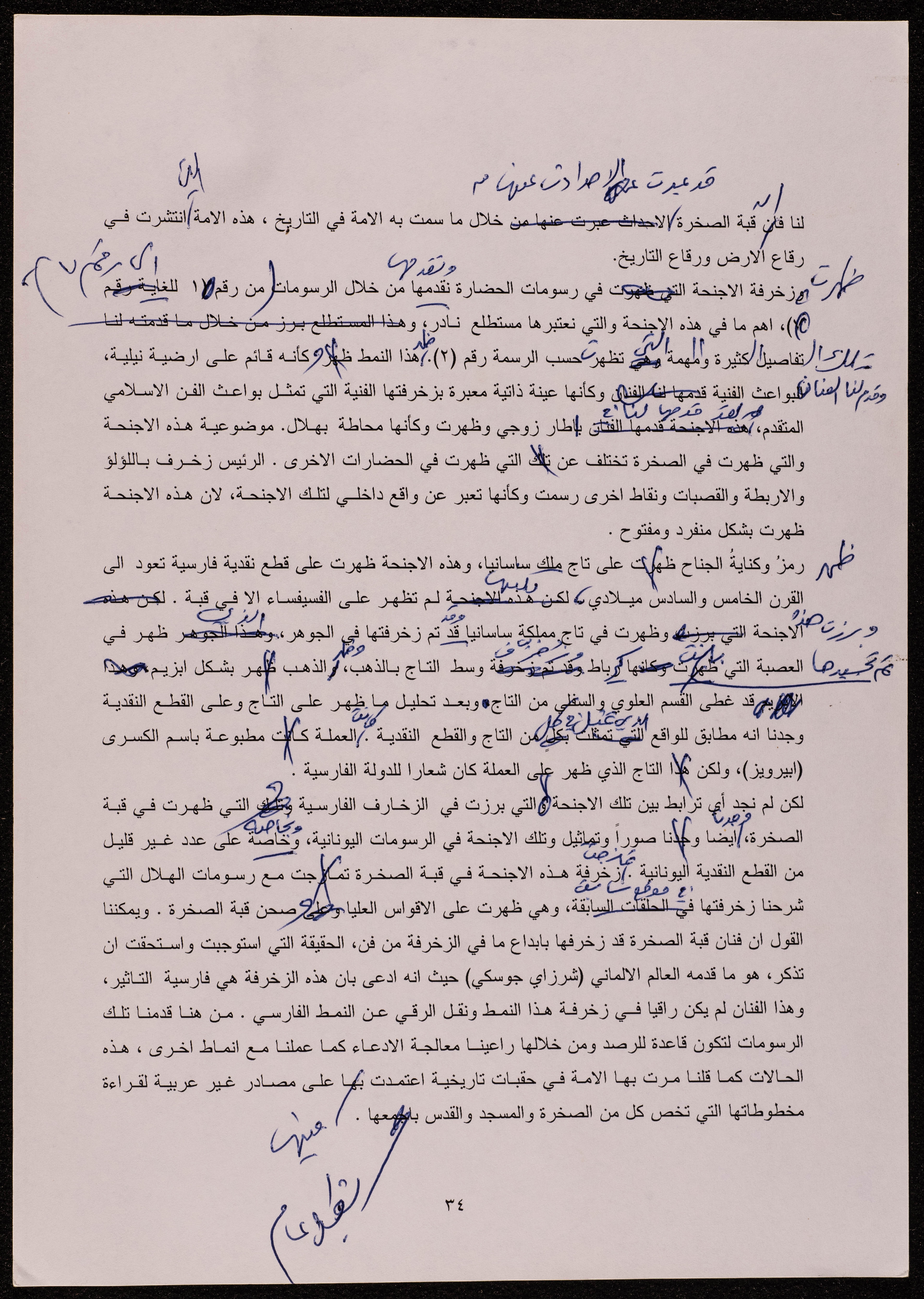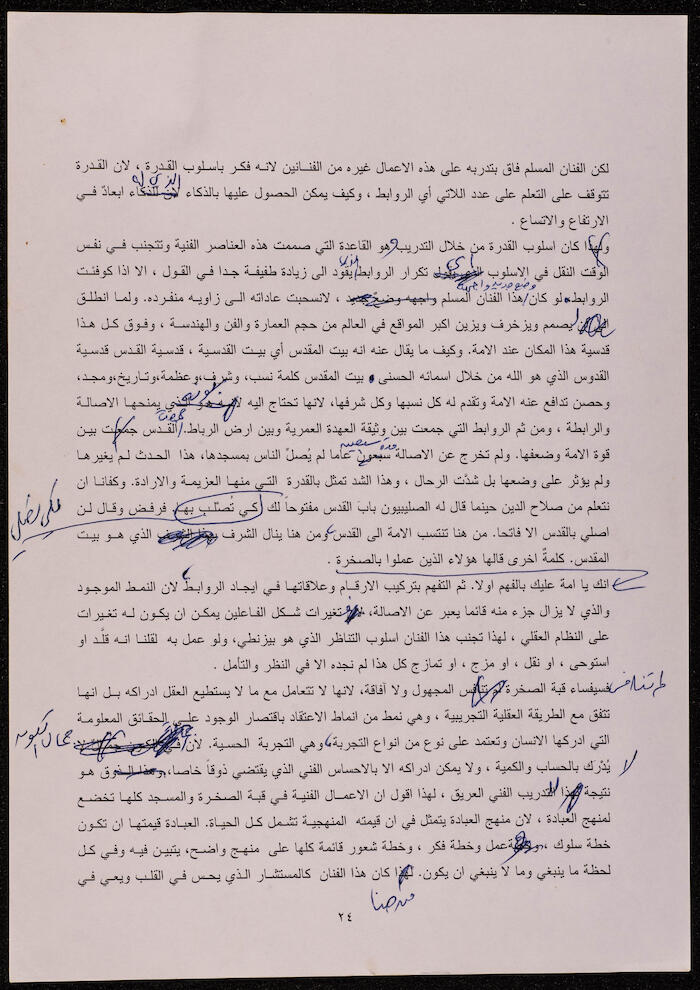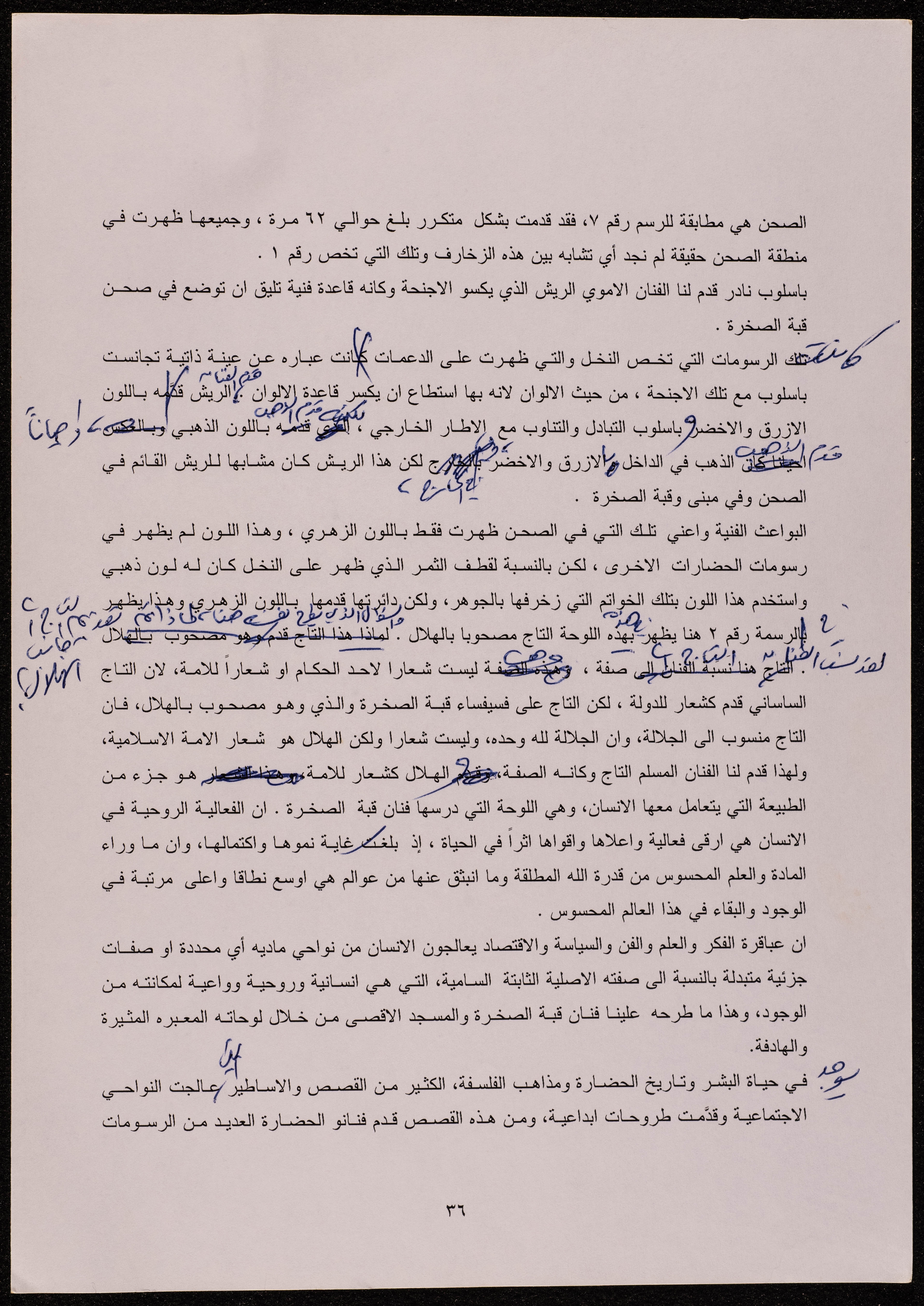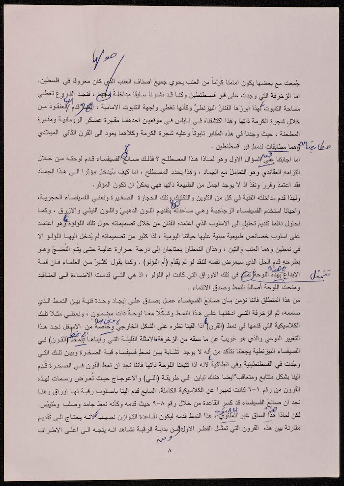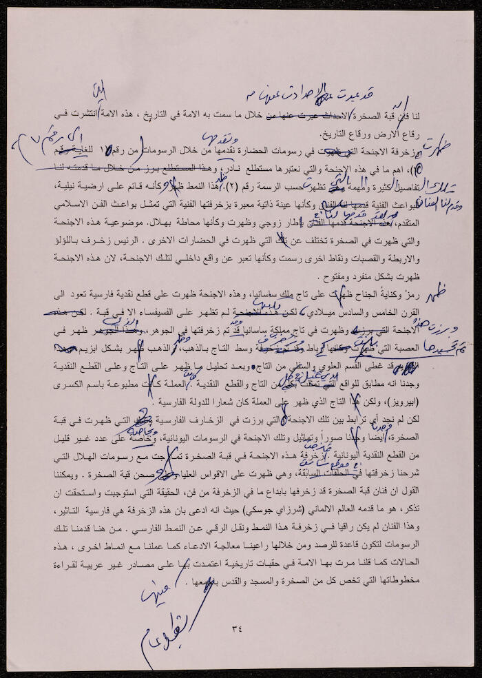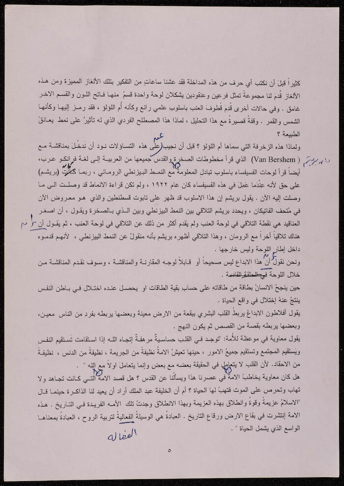 توثق هذه المادة الأرشيفية غير المؤرخة، والمطبوعة باللغة العربية، ورقة تحليلية لإبراهيم الفنّي حول فسيفساء قبة الصخرة، حيث تتبع الكاتب فن الزخرفة والفسيفساء في العصر البيزنطي والروماني واليوناني، ومجالات الفسيفساء الوجدانية والمعرفية والحركية، إضافة إلى مداخلة عن الزخرفة بأشكالها وأنواعها وتفسير وتحليل الرسومات الزخرفية حسب العصور التاريخية، كما وتناول موضوع ولادة الفن الإسلامي في القدس، وتحليل عناصر الزخرفة عبر أنماط الفسيفساء في قبة الصخرة.
