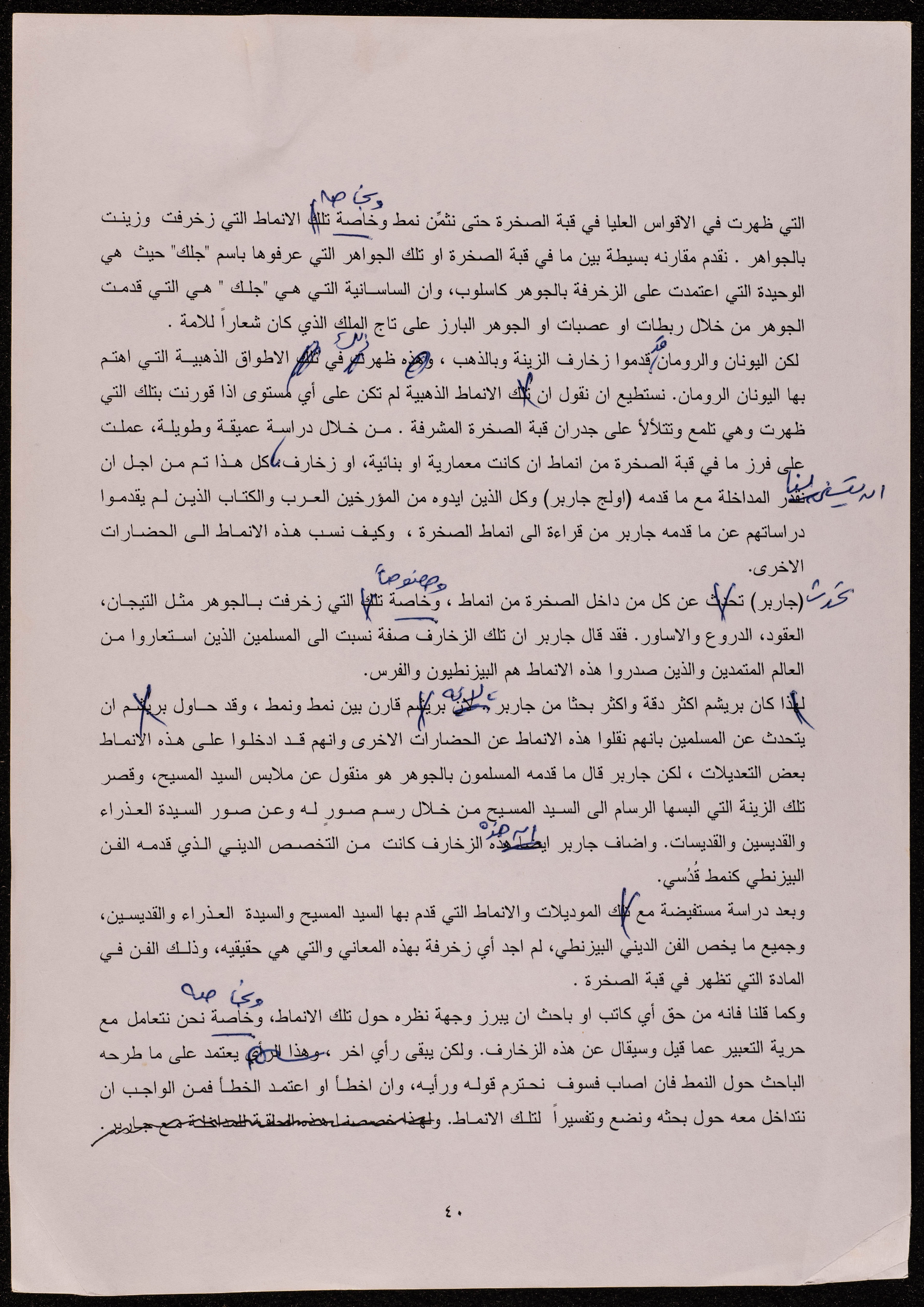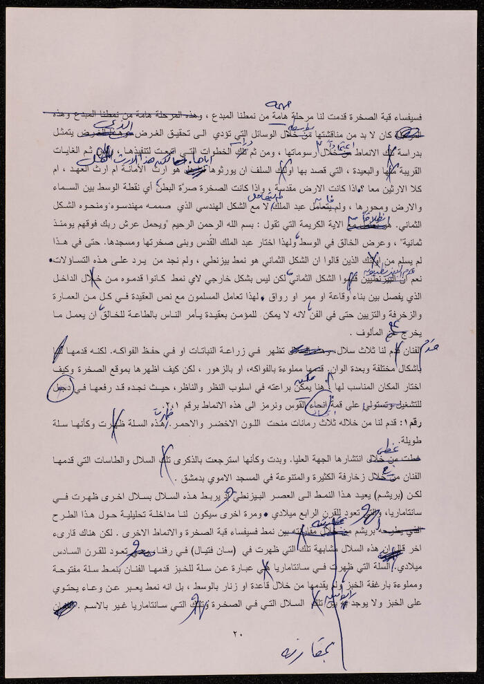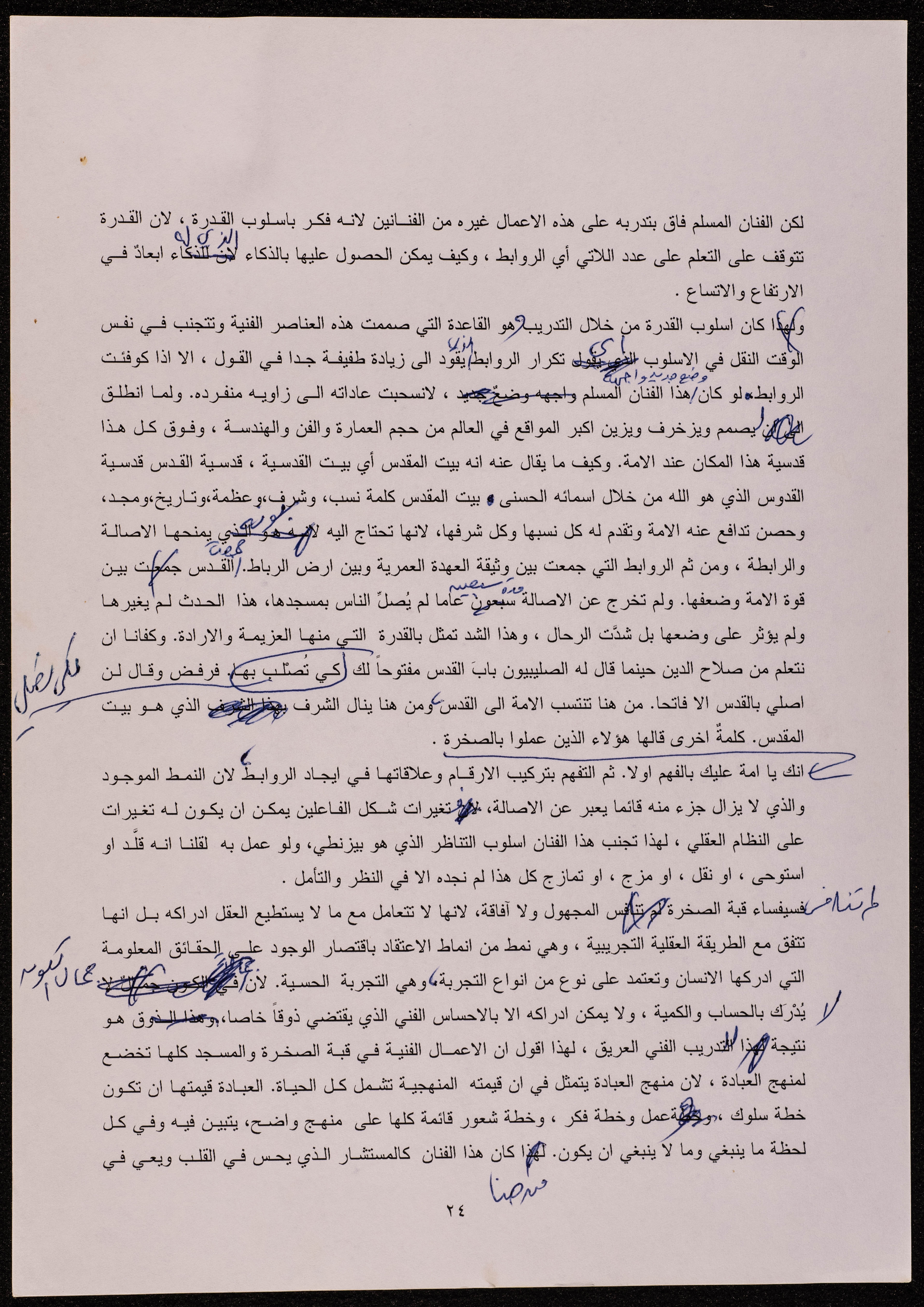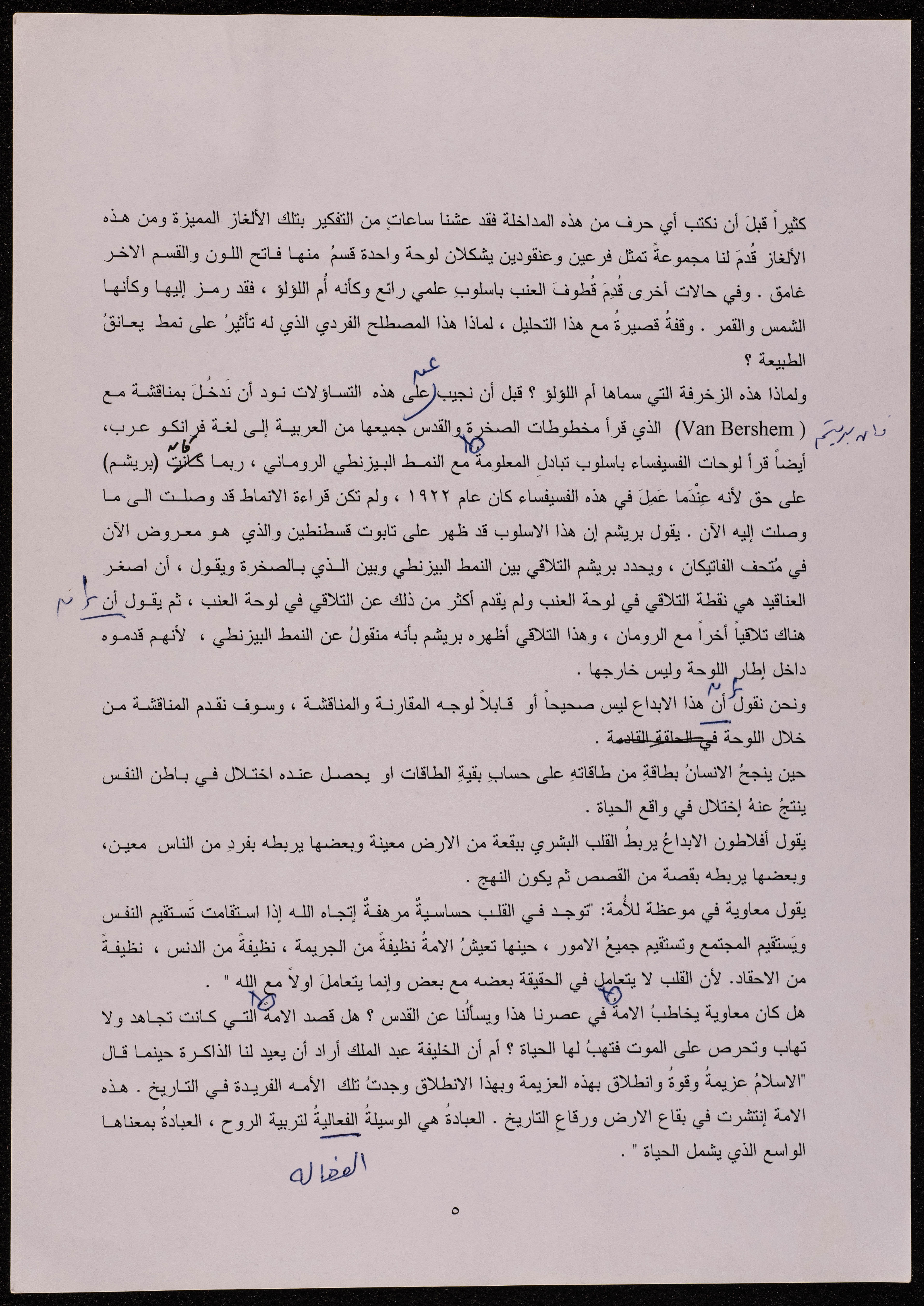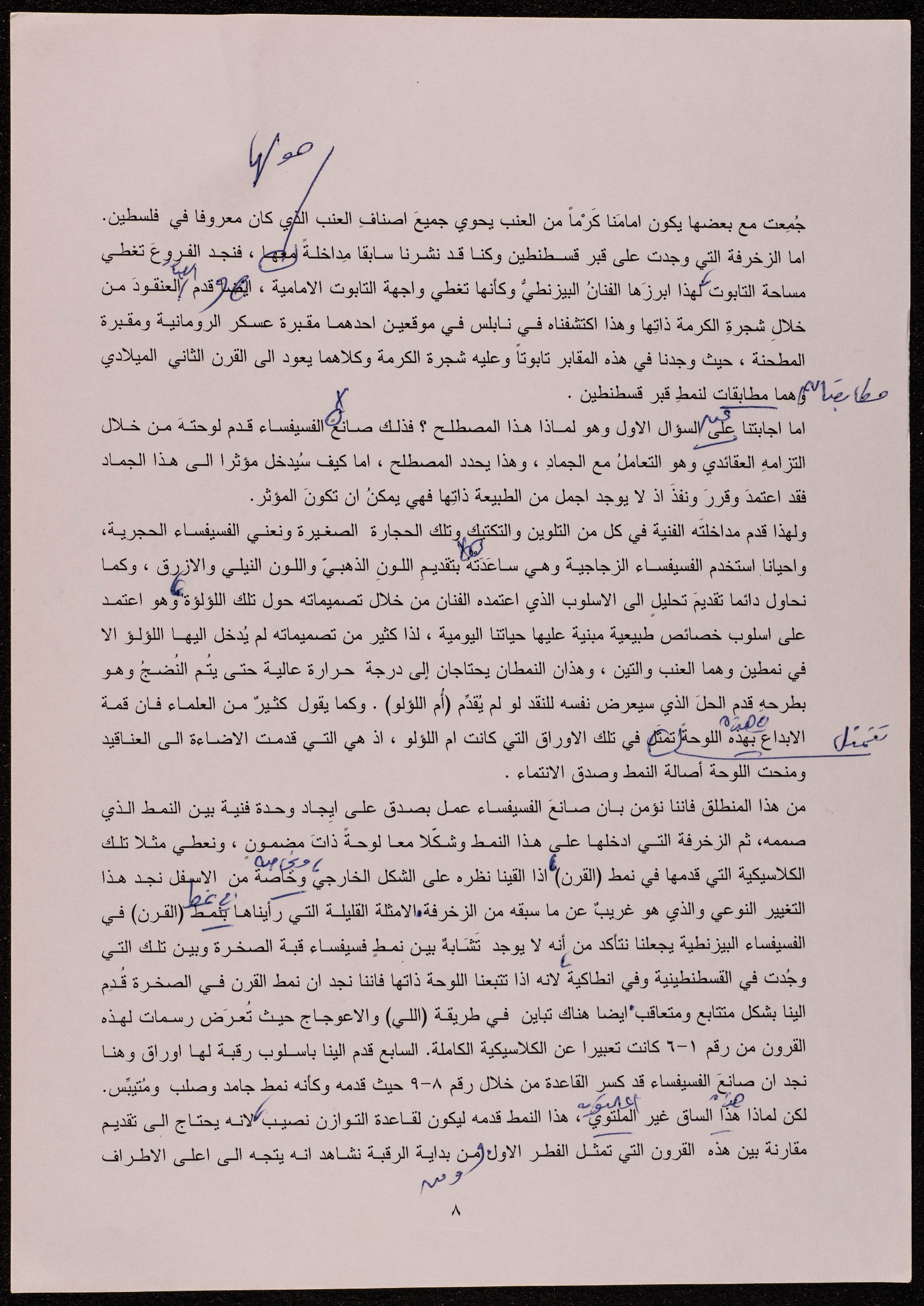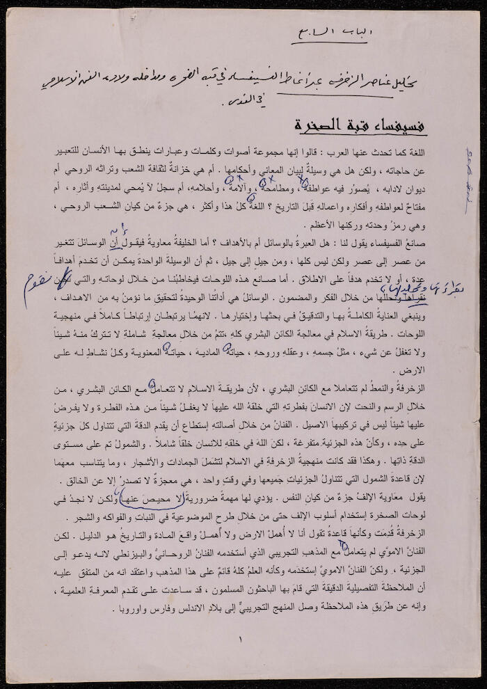 توثق هذه المادة الأرشيفية غير المؤرخة، والمطبوعة باللغة العربية، ورقة تحليلية لإبراهيم الفنّي حول فسيفساء قبة الصخرة، حيث تتبع الكاتب فن الزخرفة والفسيفساء في العصر البيزنطي والروماني واليوناني، ومجالات الفسيفساء الوجدانية والمعرفية والحركية، إضافة إلى مداخلة عن الزخرفة بأشكالها وأنواعها وتفسير وتحليل الرسومات الزخرفية حسب العصور التاريخية، كما وتناول موضوع ولادة الفن الإسلامي في القدس، وتحليل عناصر الزخرفة عبر أنماط الفسيفساء في قبة الصخرة.