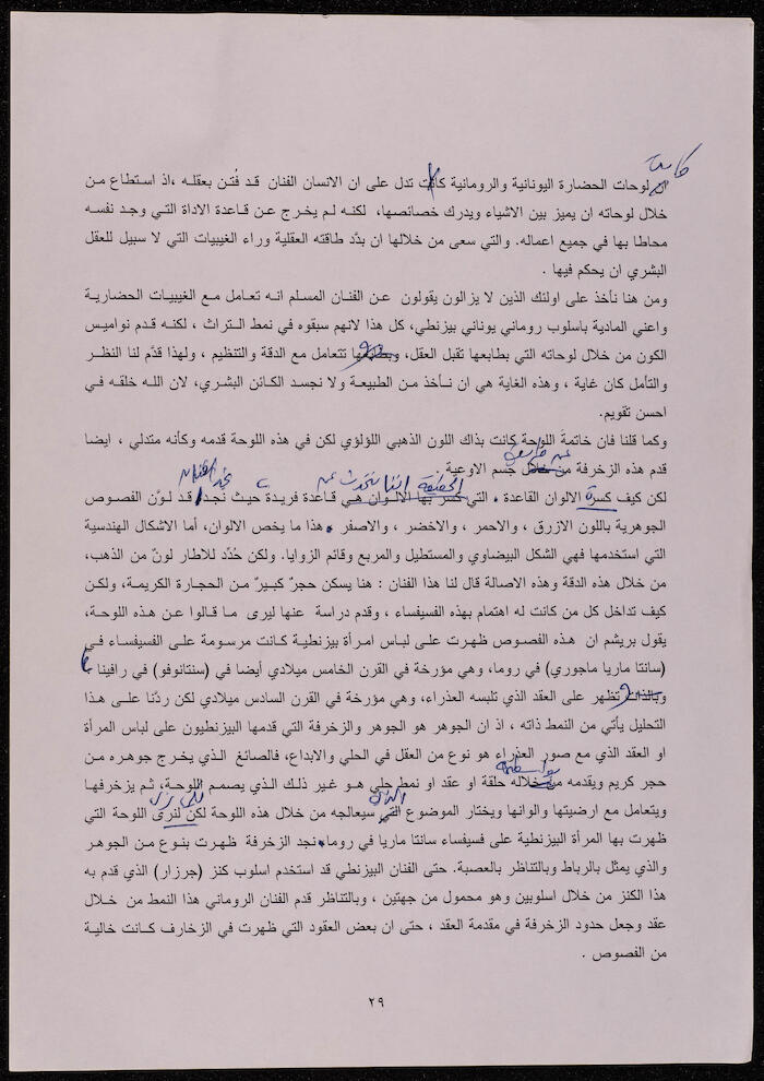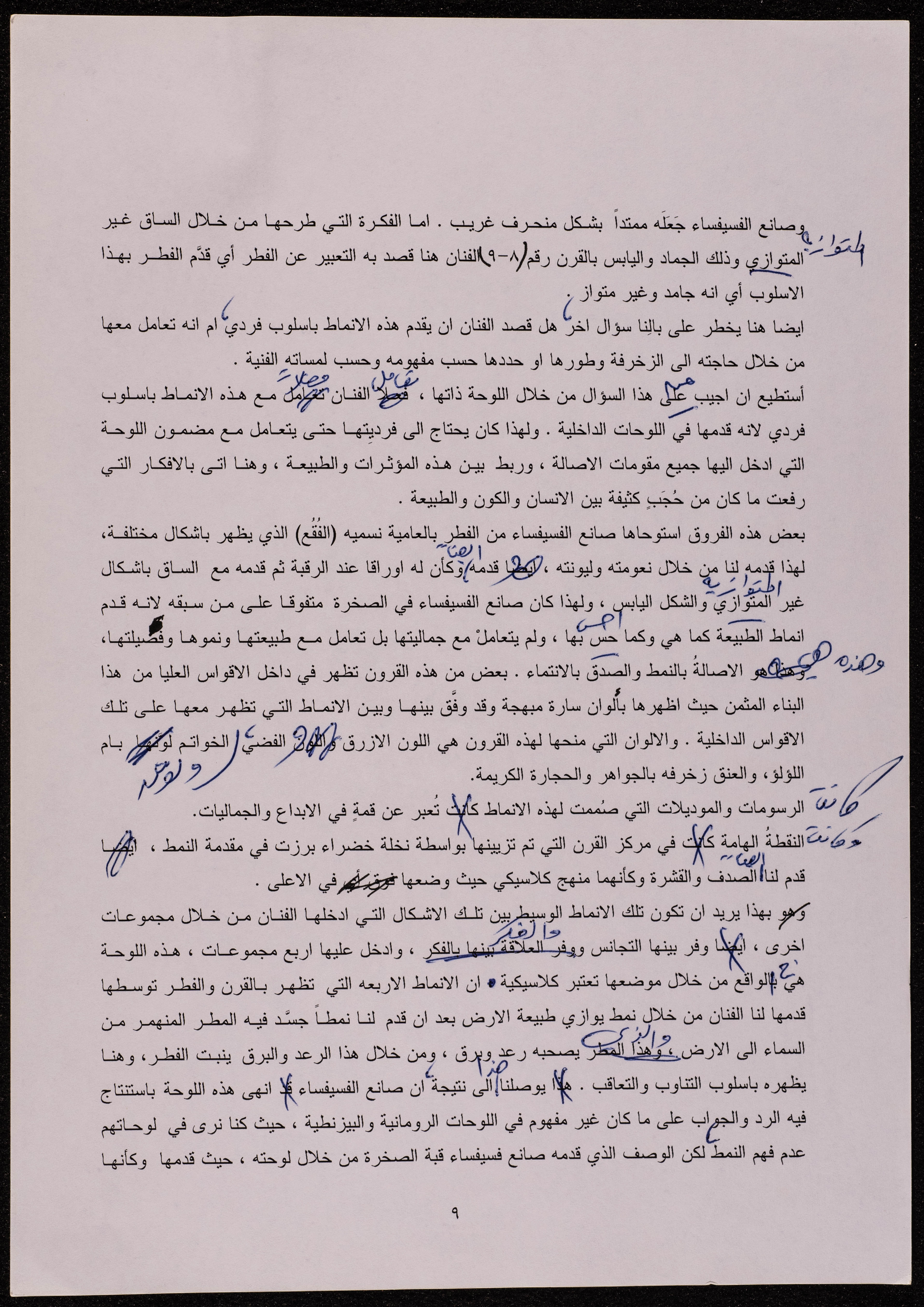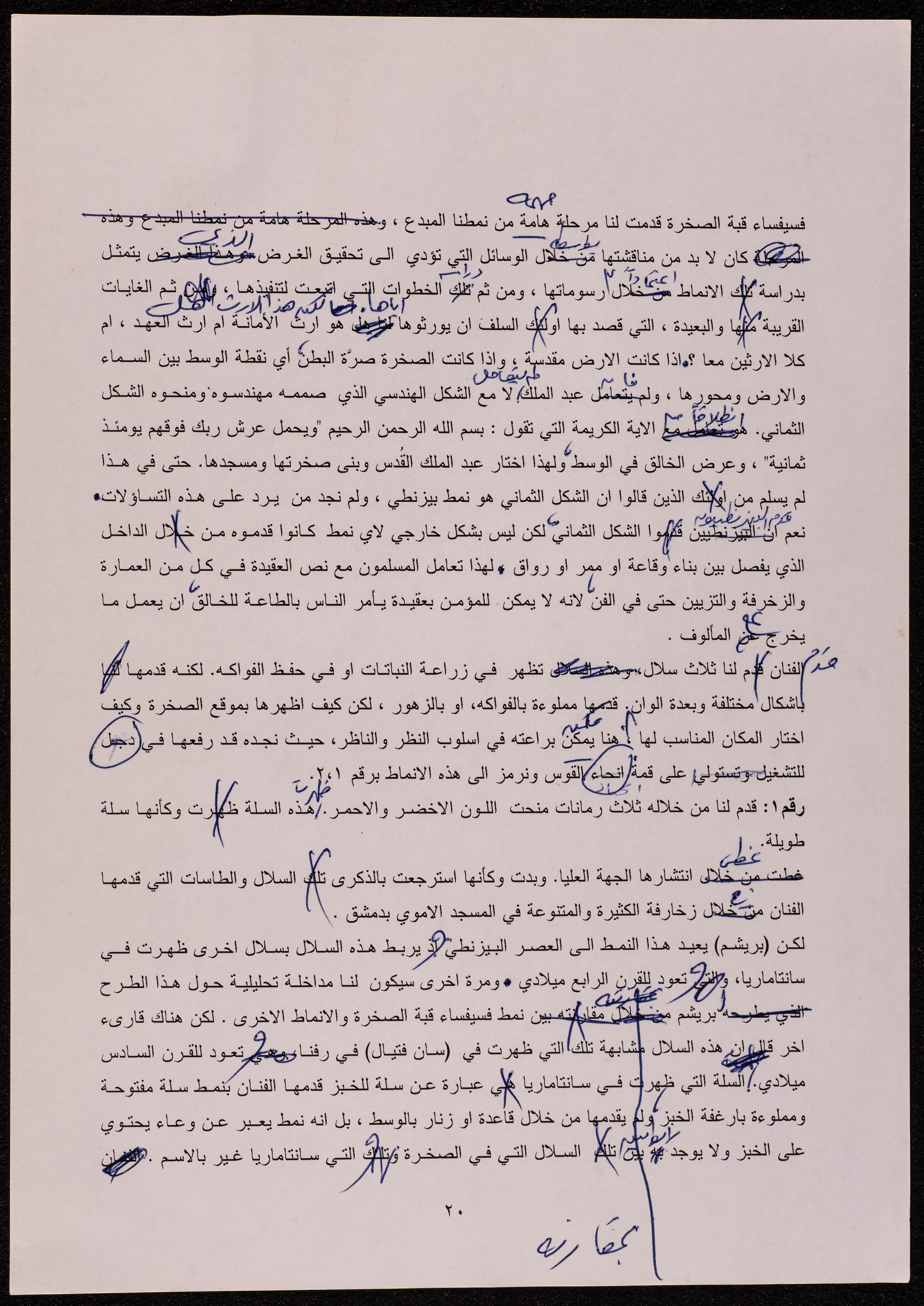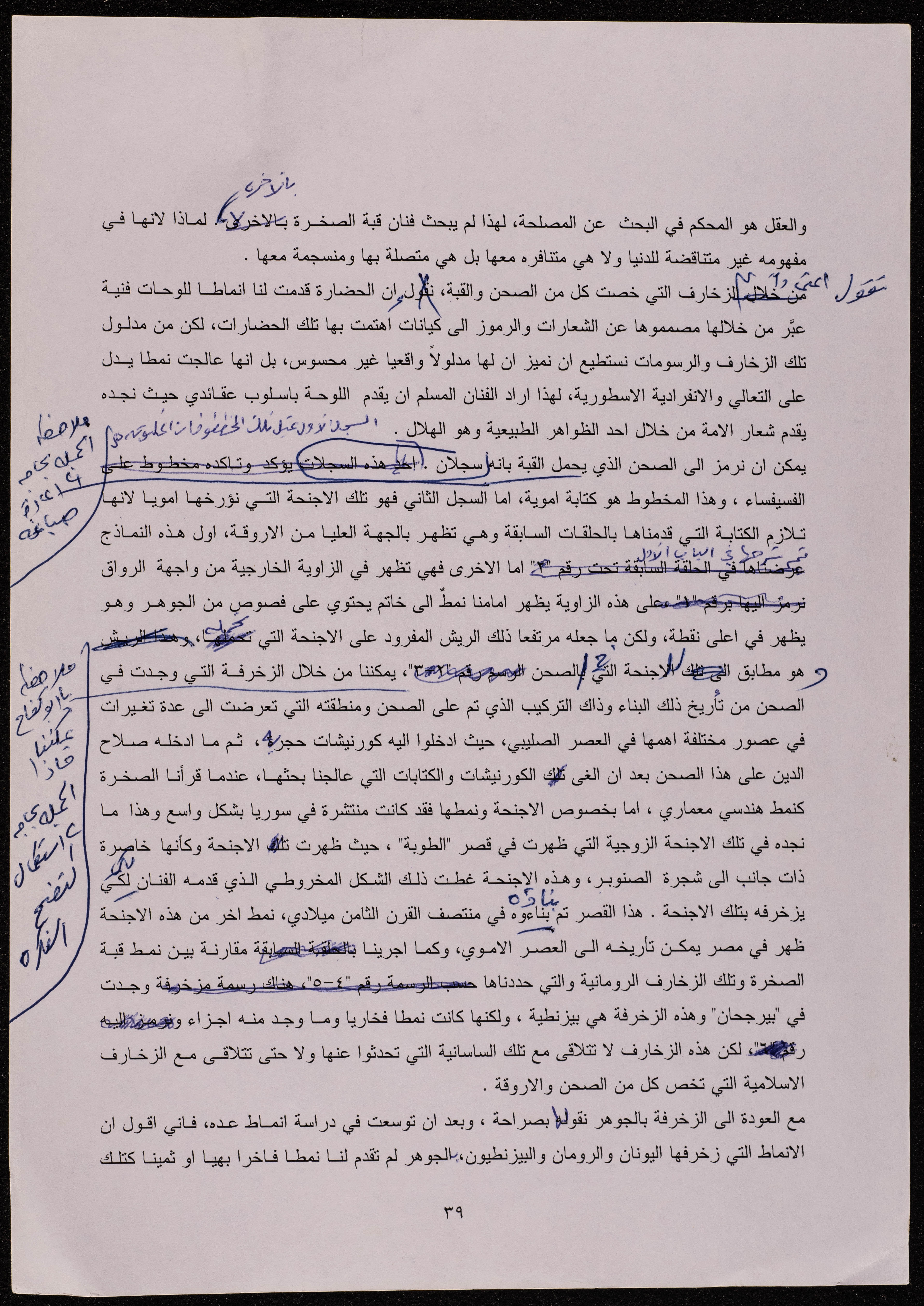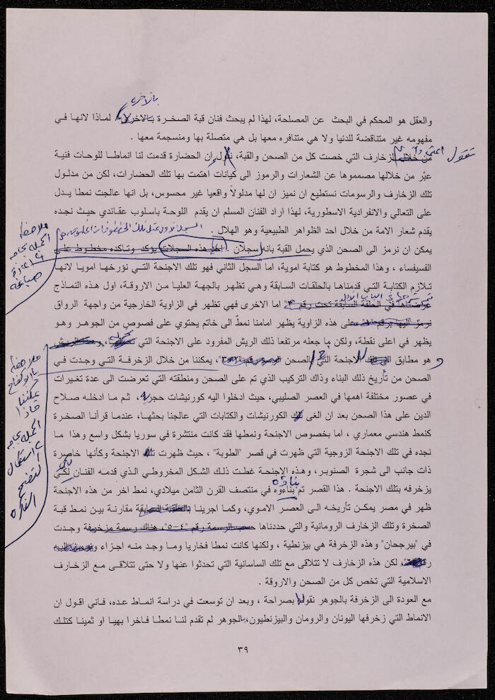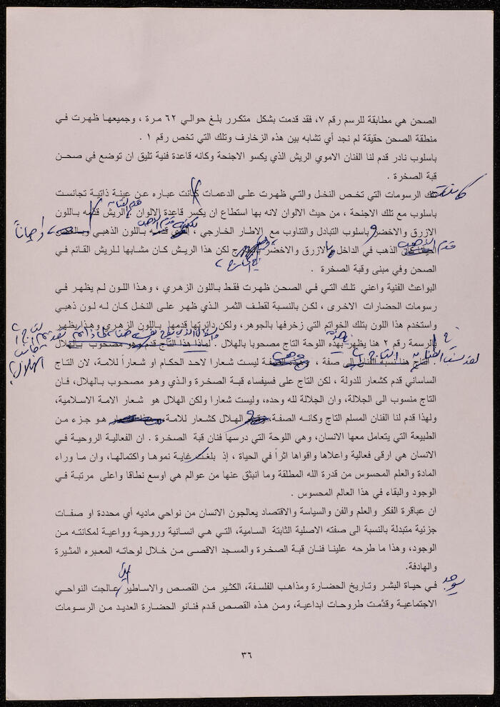 توثق هذه المادة الأرشيفية غير المؤرخة، والمطبوعة باللغة العربية، ورقة تحليلية لإبراهيم الفنّي حول فسيفساء قبة الصخرة، حيث تتبع الكاتب فن الزخرفة والفسيفساء في العصر البيزنطي والروماني واليوناني، ومجالات الفسيفساء الوجدانية والمعرفية والحركية، إضافة إلى مداخلة عن الزخرفة بأشكالها وأنواعها وتفسير وتحليل الرسومات الزخرفية حسب العصور التاريخية، كما وتناول موضوع ولادة الفن الإسلامي في القدس، وتحليل عناصر الزخرفة عبر أنماط الفسيفساء في قبة الصخرة.