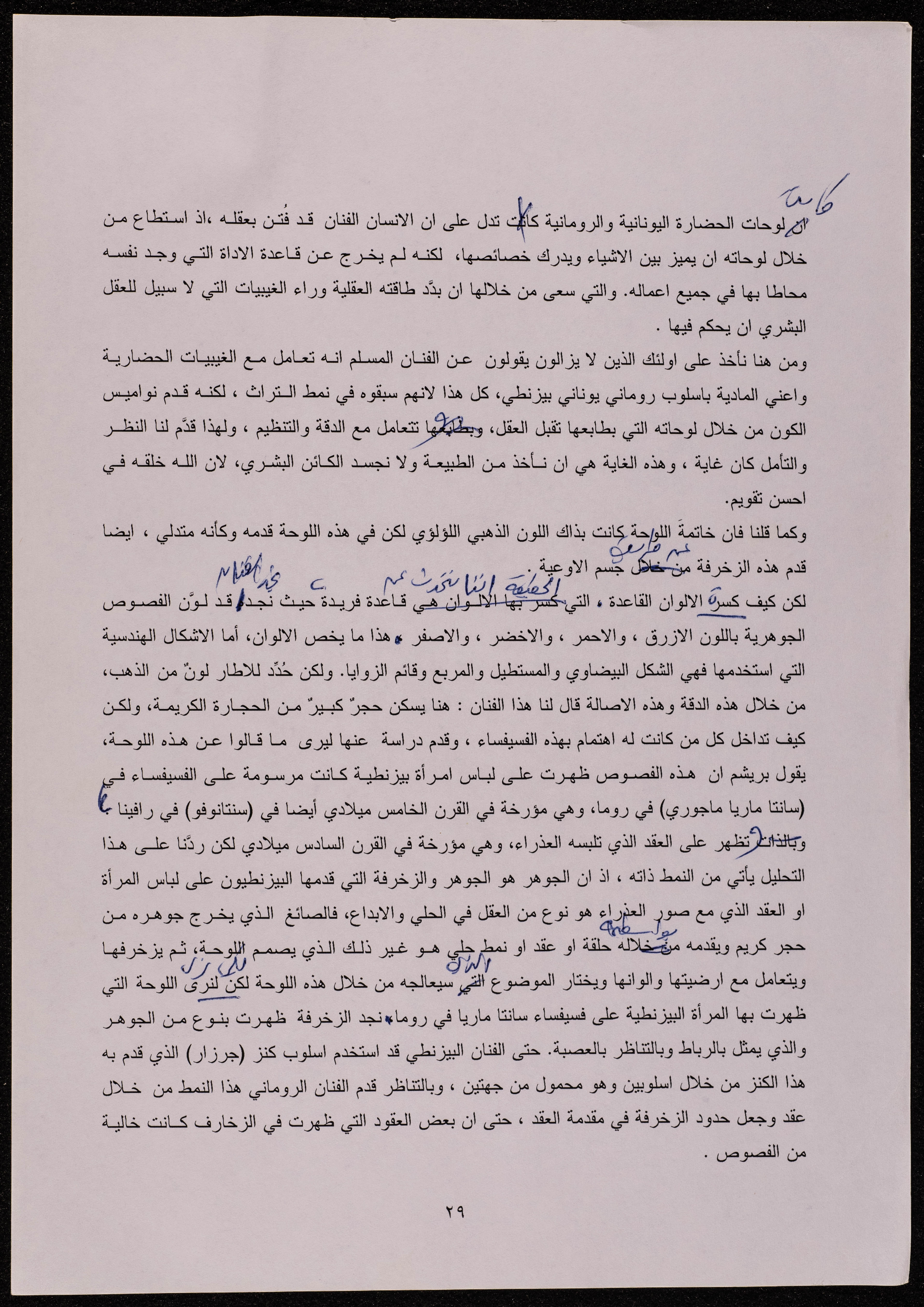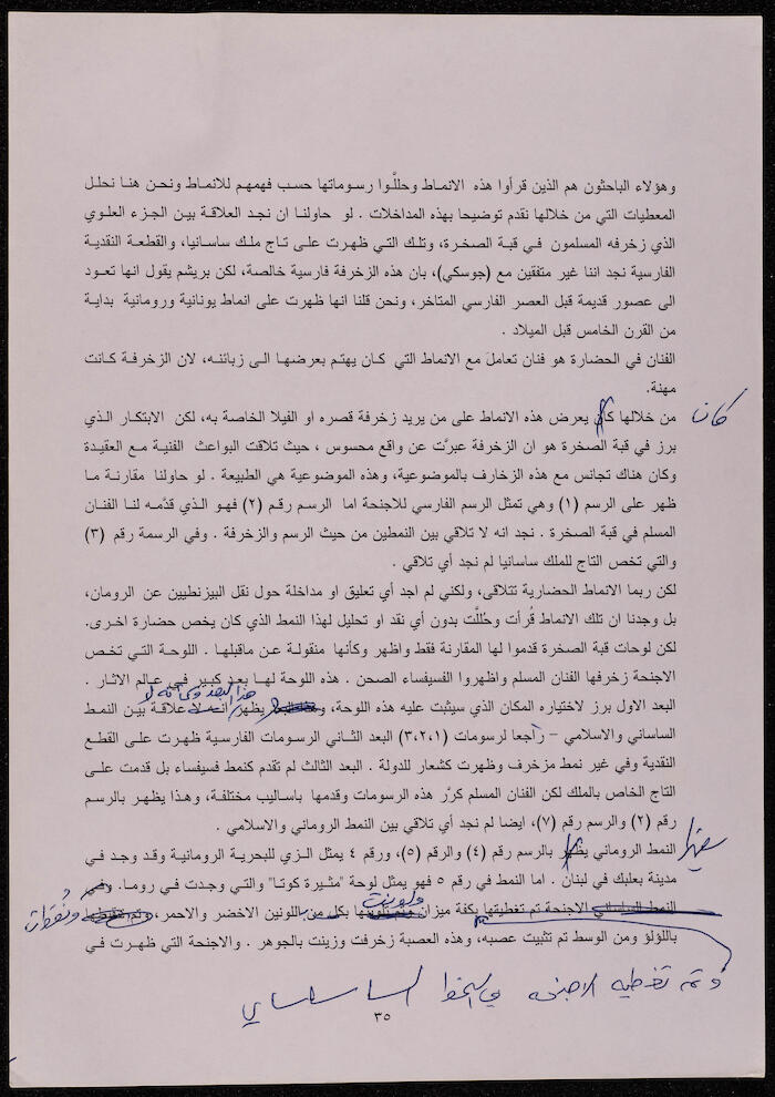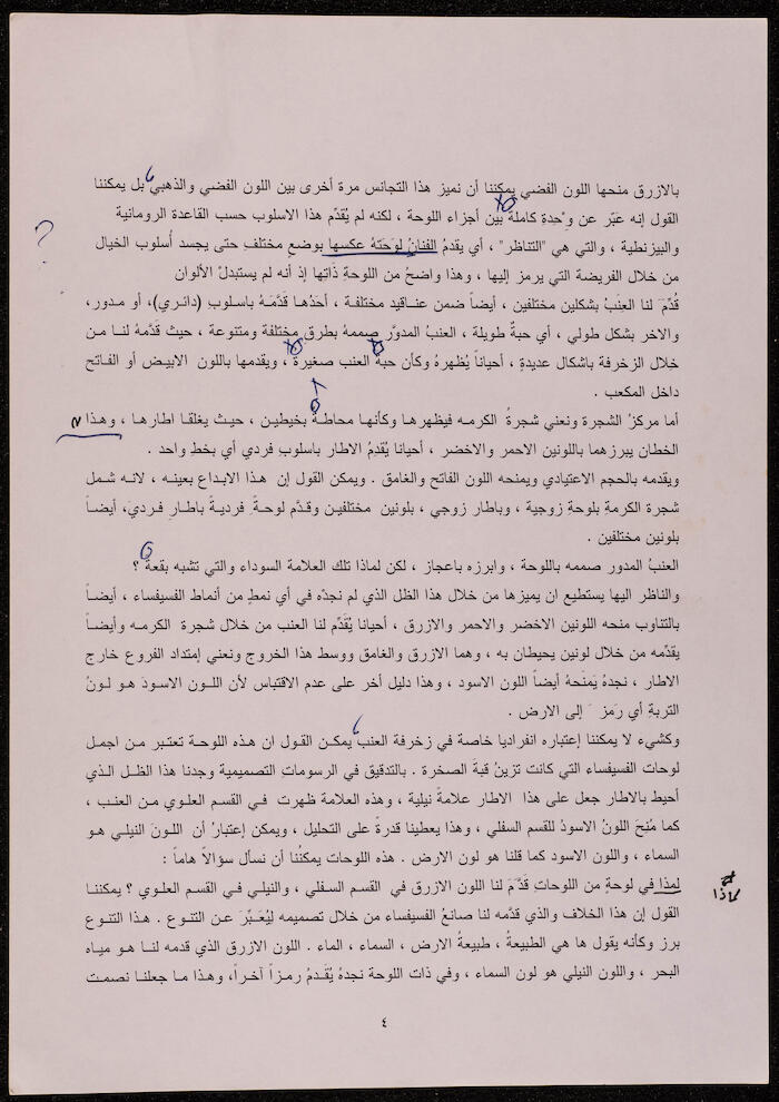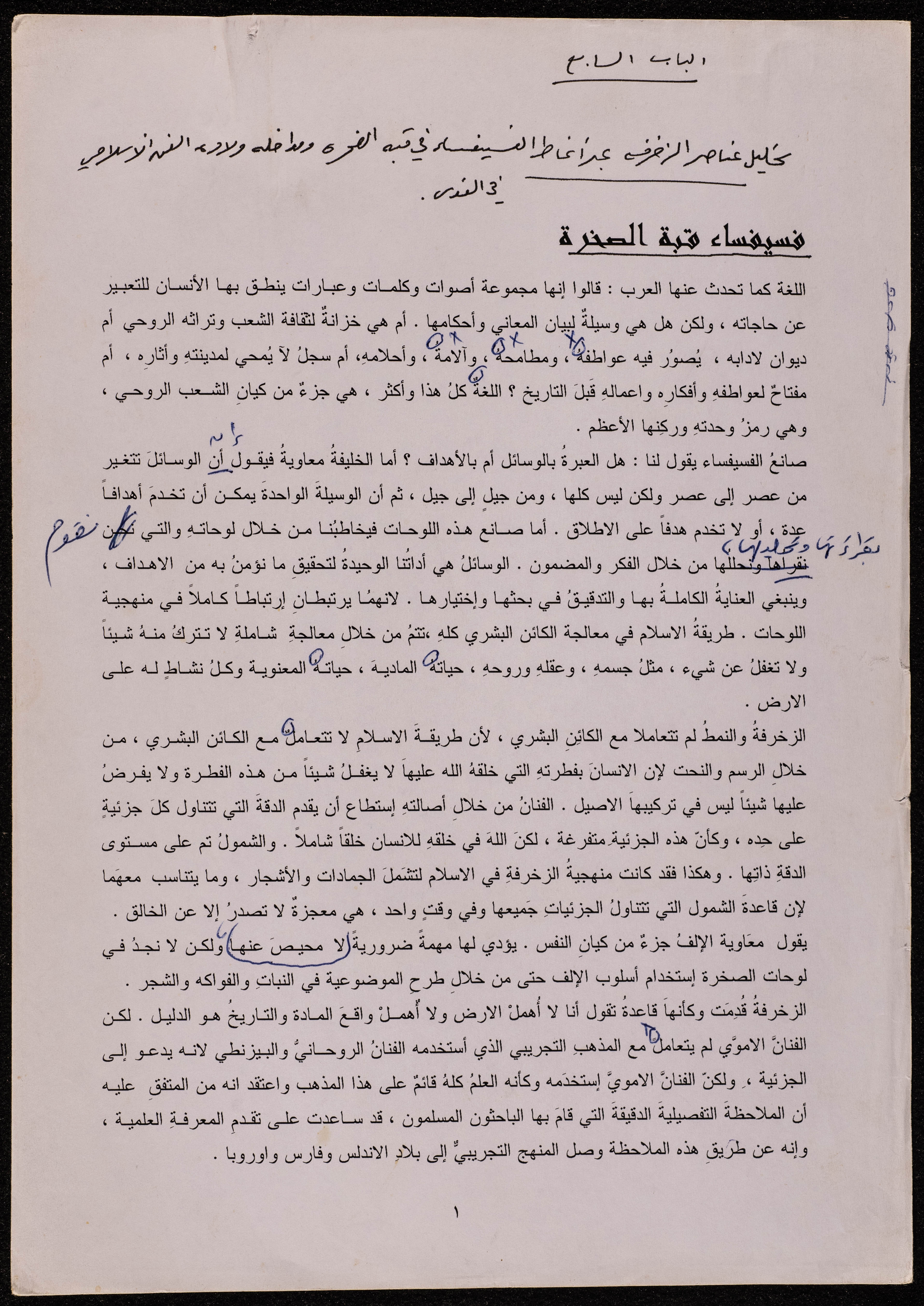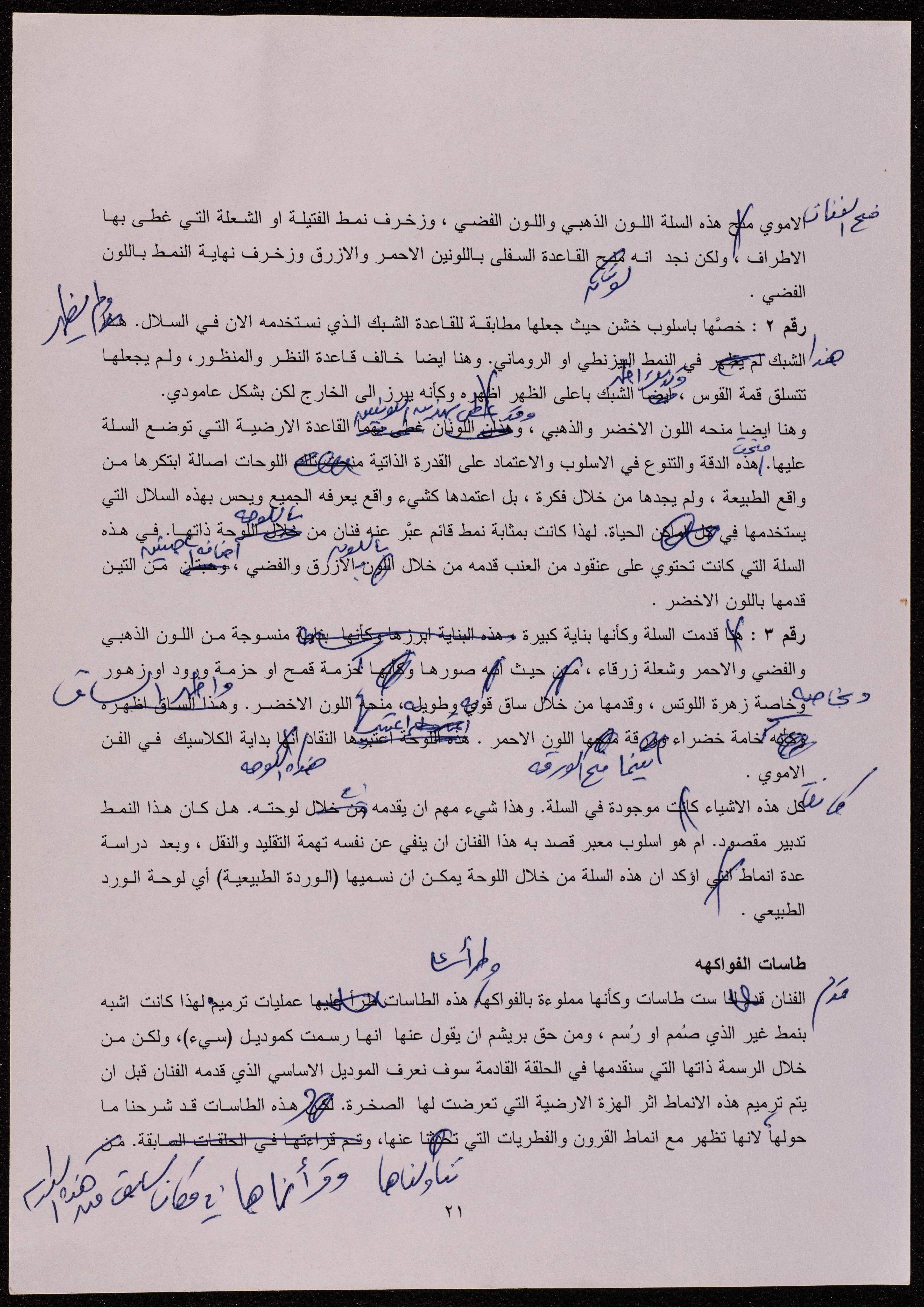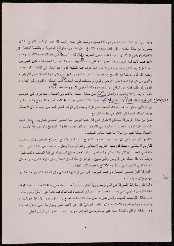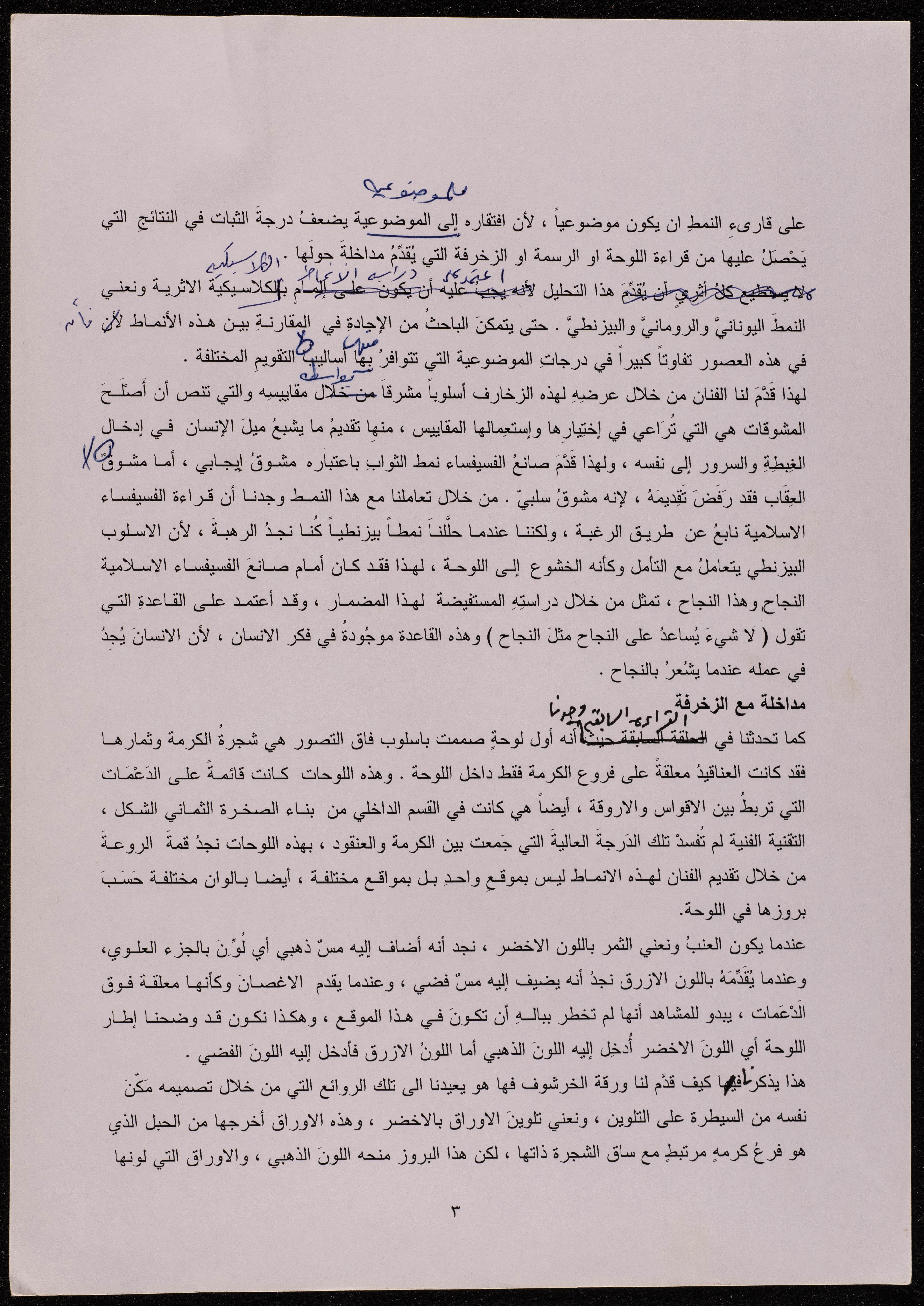 توثق هذه المادة الأرشيفية غير المؤرخة، والمطبوعة باللغة العربية، ورقة تحليلية لإبراهيم الفنّي حول فسيفساء قبة الصخرة، حيث تتبع الكاتب فن الزخرفة والفسيفساء في العصر البيزنطي والروماني واليوناني، ومجالات الفسيفساء الوجدانية والمعرفية والحركية، إضافة إلى مداخلة عن الزخرفة بأشكالها وأنواعها وتفسير وتحليل الرسومات الزخرفية حسب العصور التاريخية، كما وتناول موضوع ولادة الفن الإسلامي في القدس، وتحليل عناصر الزخرفة عبر أنماط الفسيفساء في قبة الصخرة.