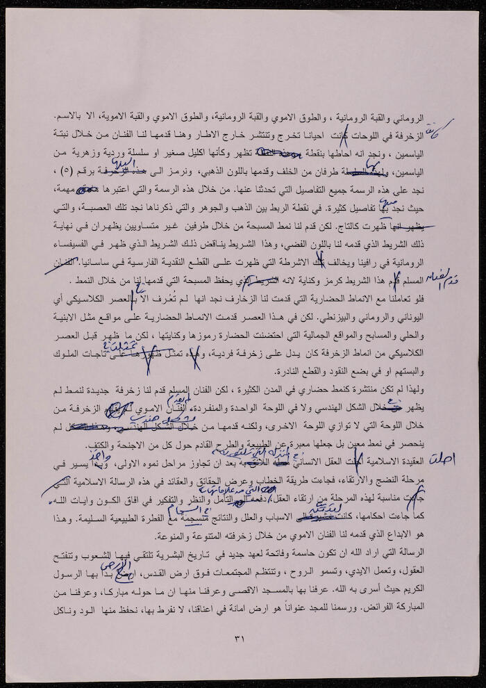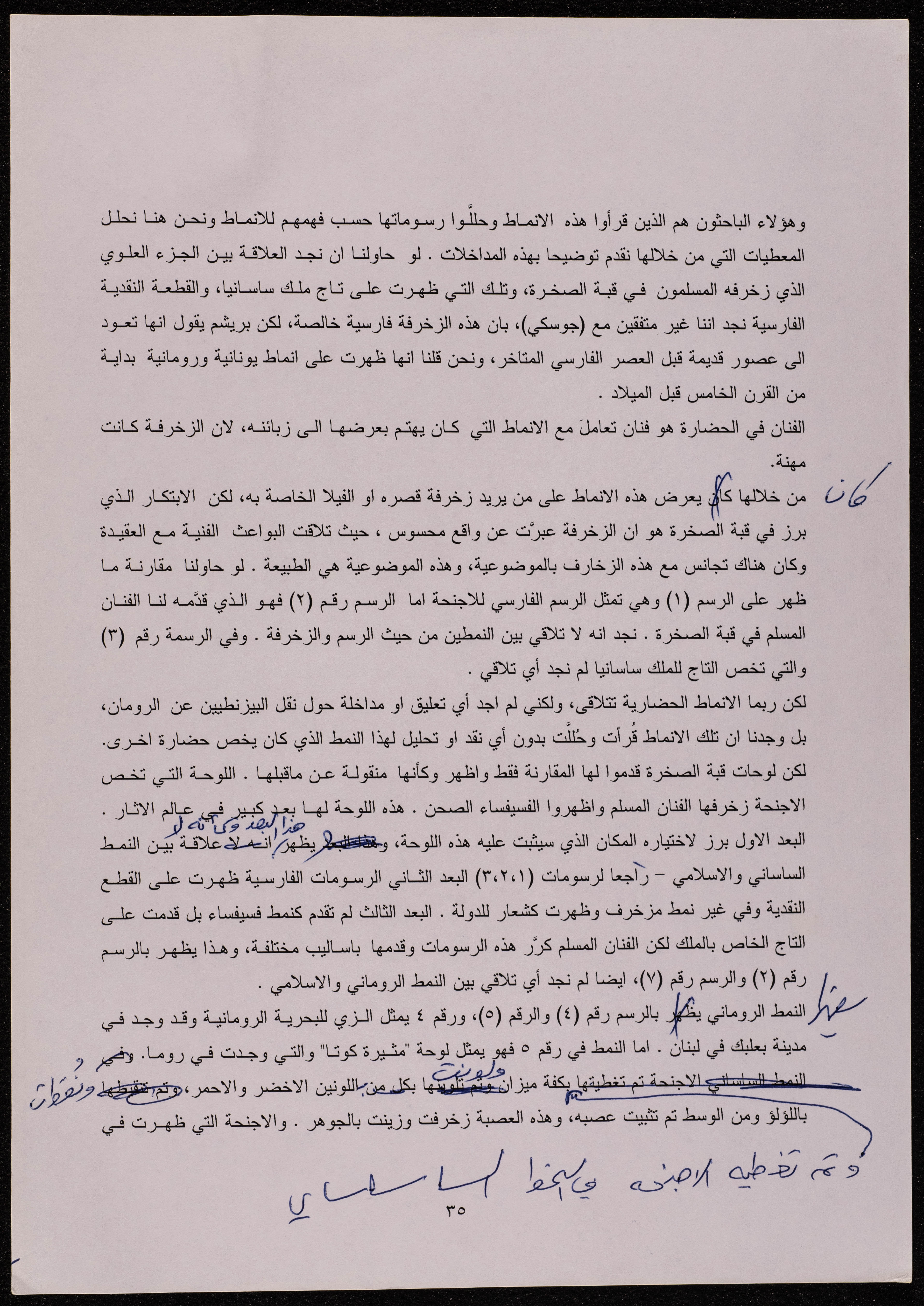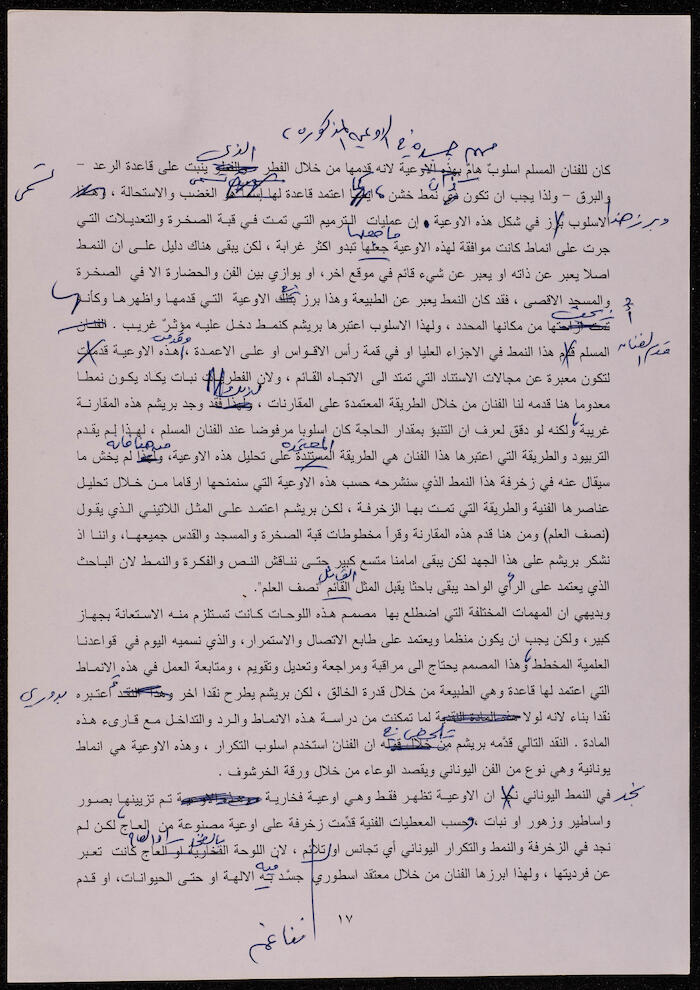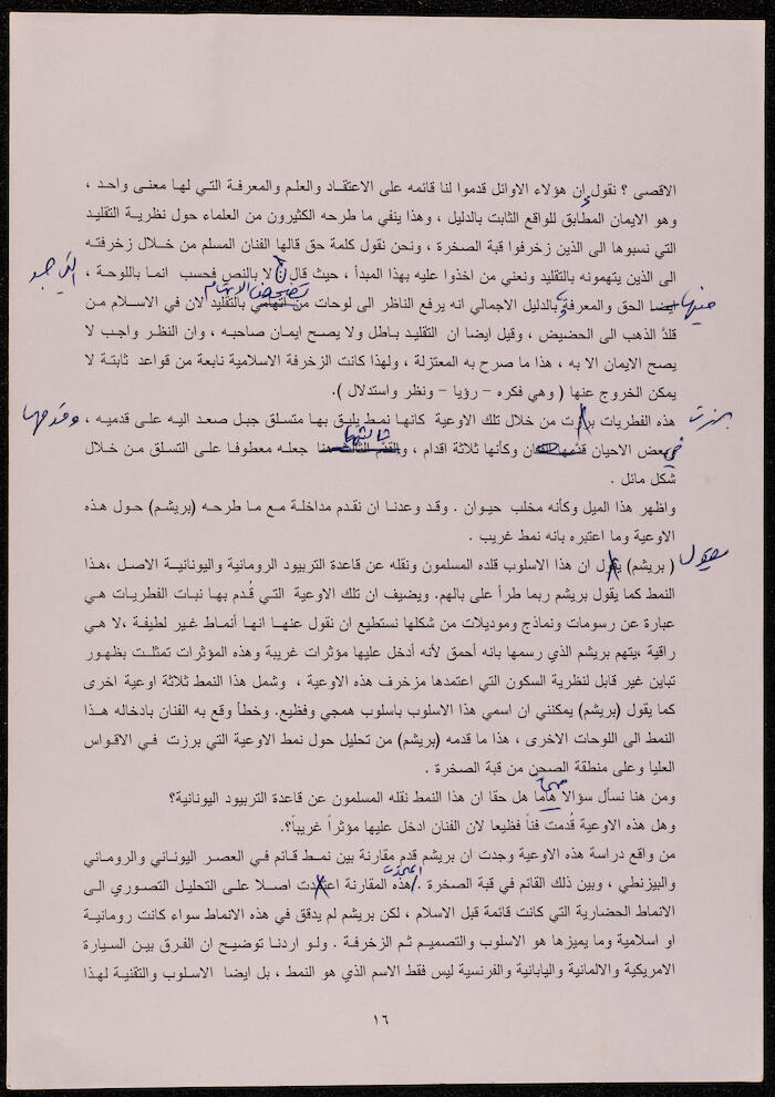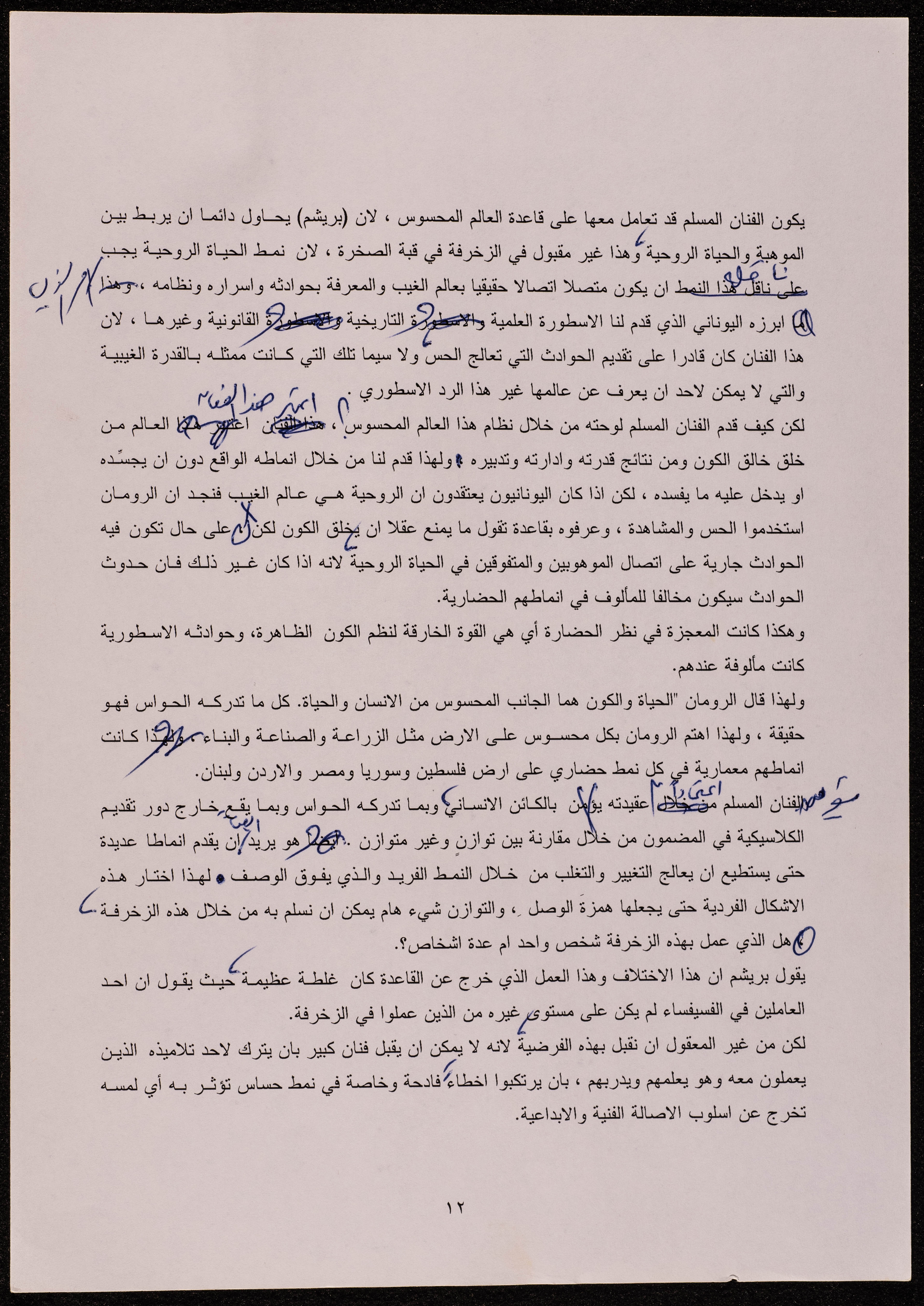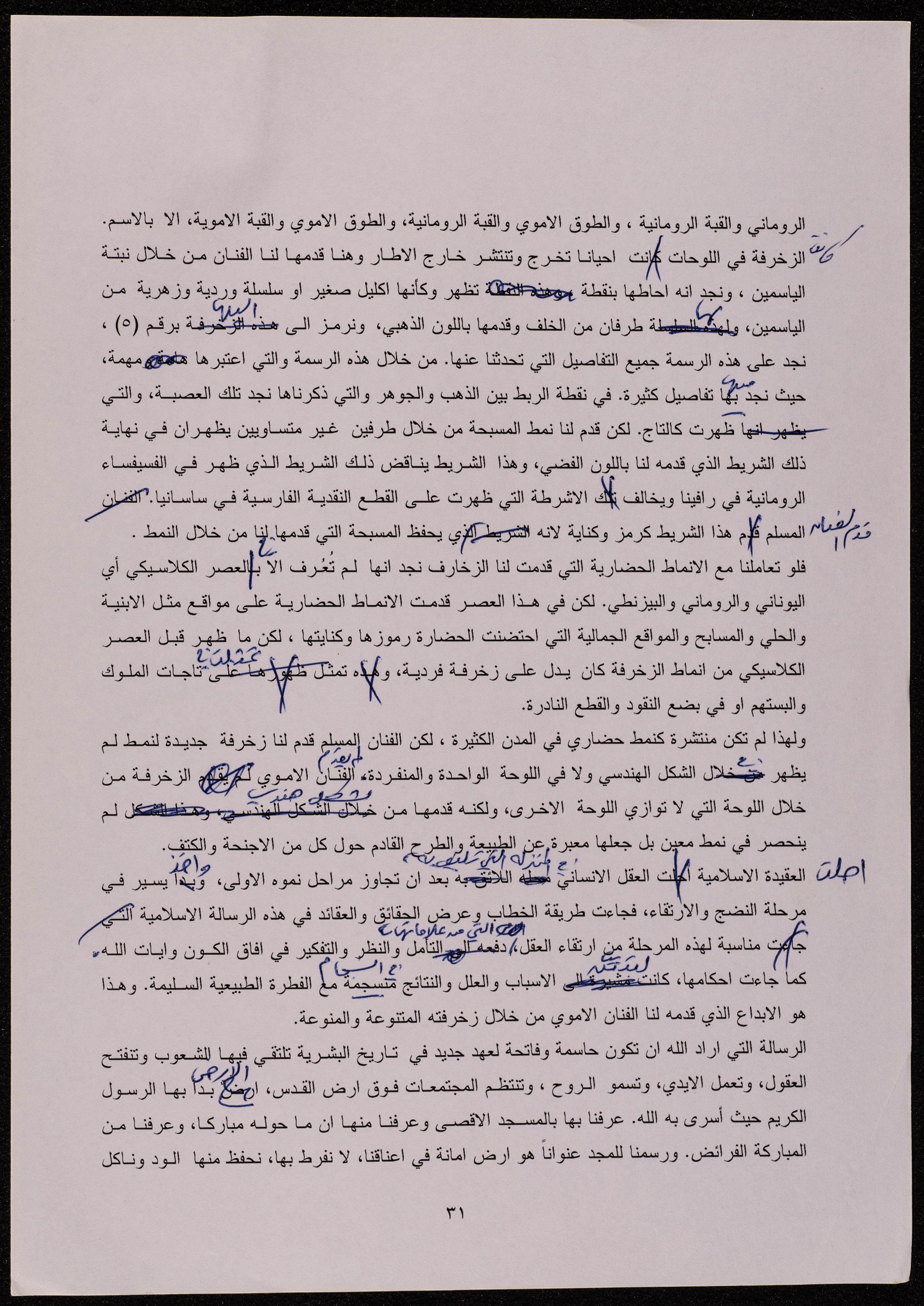 توثق هذه المادة الأرشيفية غير المؤرخة، والمطبوعة باللغة العربية، ورقة تحليلية لإبراهيم الفنّي حول فسيفساء قبة الصخرة، حيث تتبع الكاتب فن الزخرفة والفسيفساء في العصر البيزنطي والروماني واليوناني، ومجالات الفسيفساء الوجدانية والمعرفية والحركية، إضافة إلى مداخلة عن الزخرفة بأشكالها وأنواعها وتفسير وتحليل الرسومات الزخرفية حسب العصور التاريخية، كما وتناول موضوع ولادة الفن الإسلامي في القدس، وتحليل عناصر الزخرفة عبر أنماط الفسيفساء في قبة الصخرة.