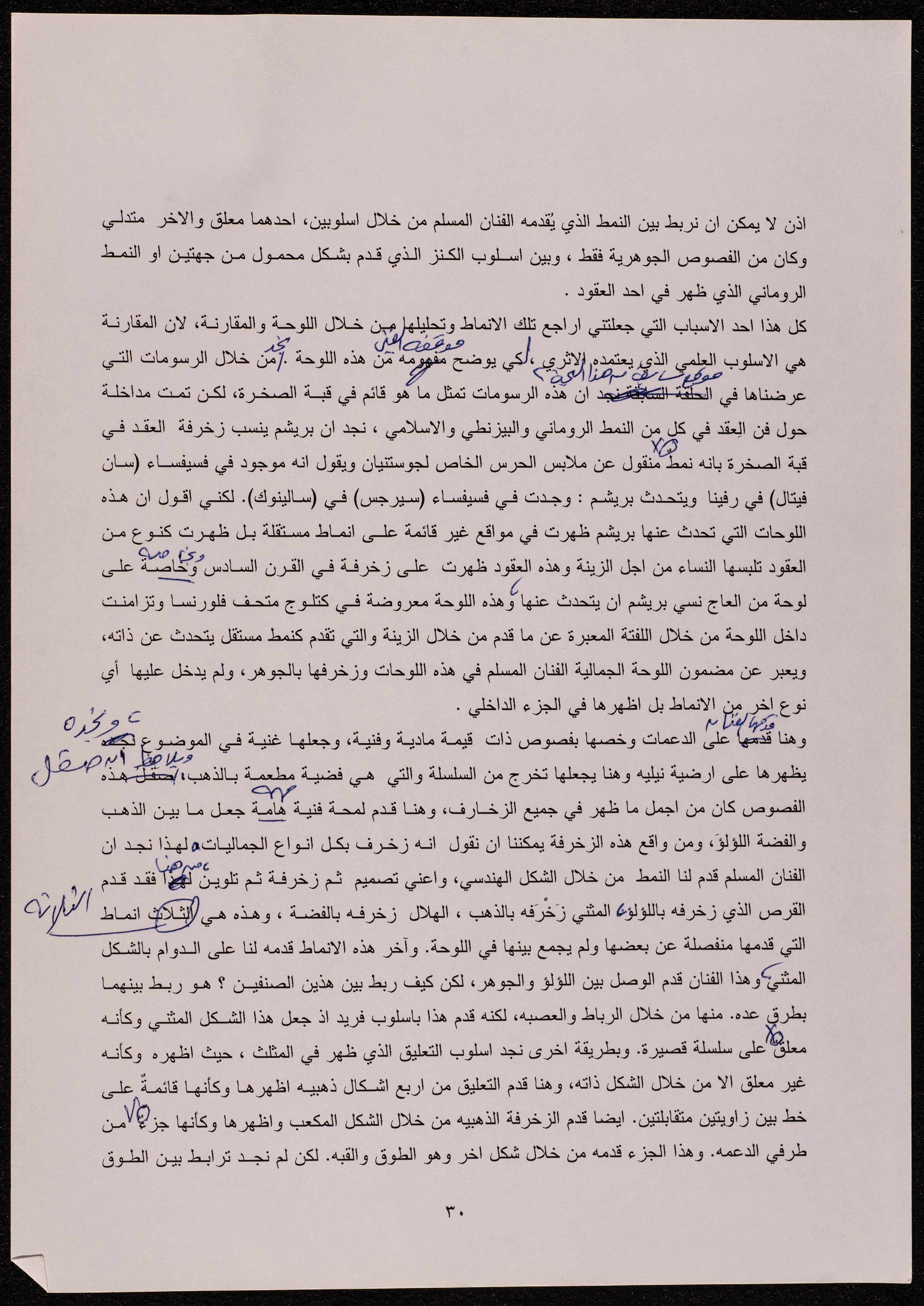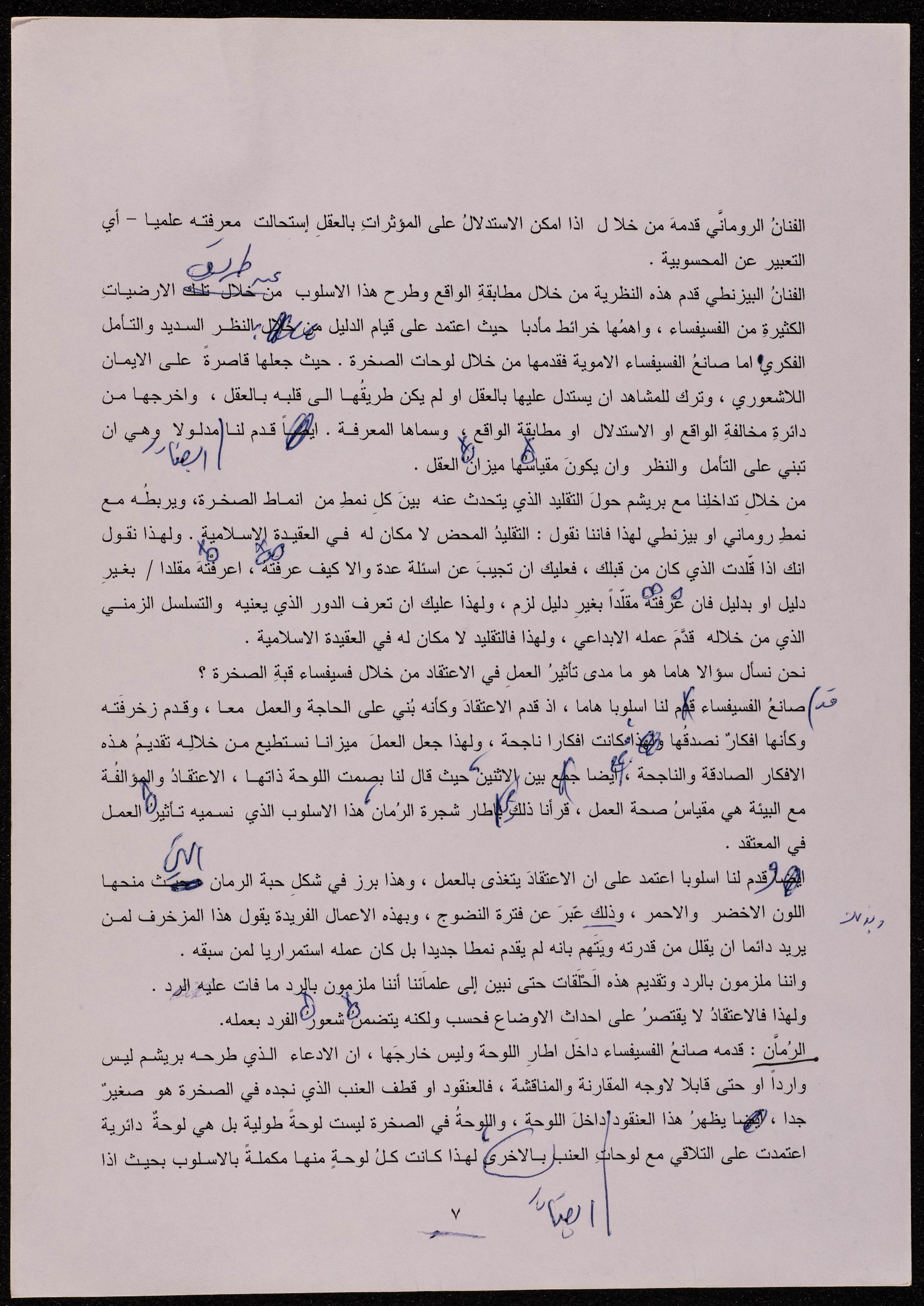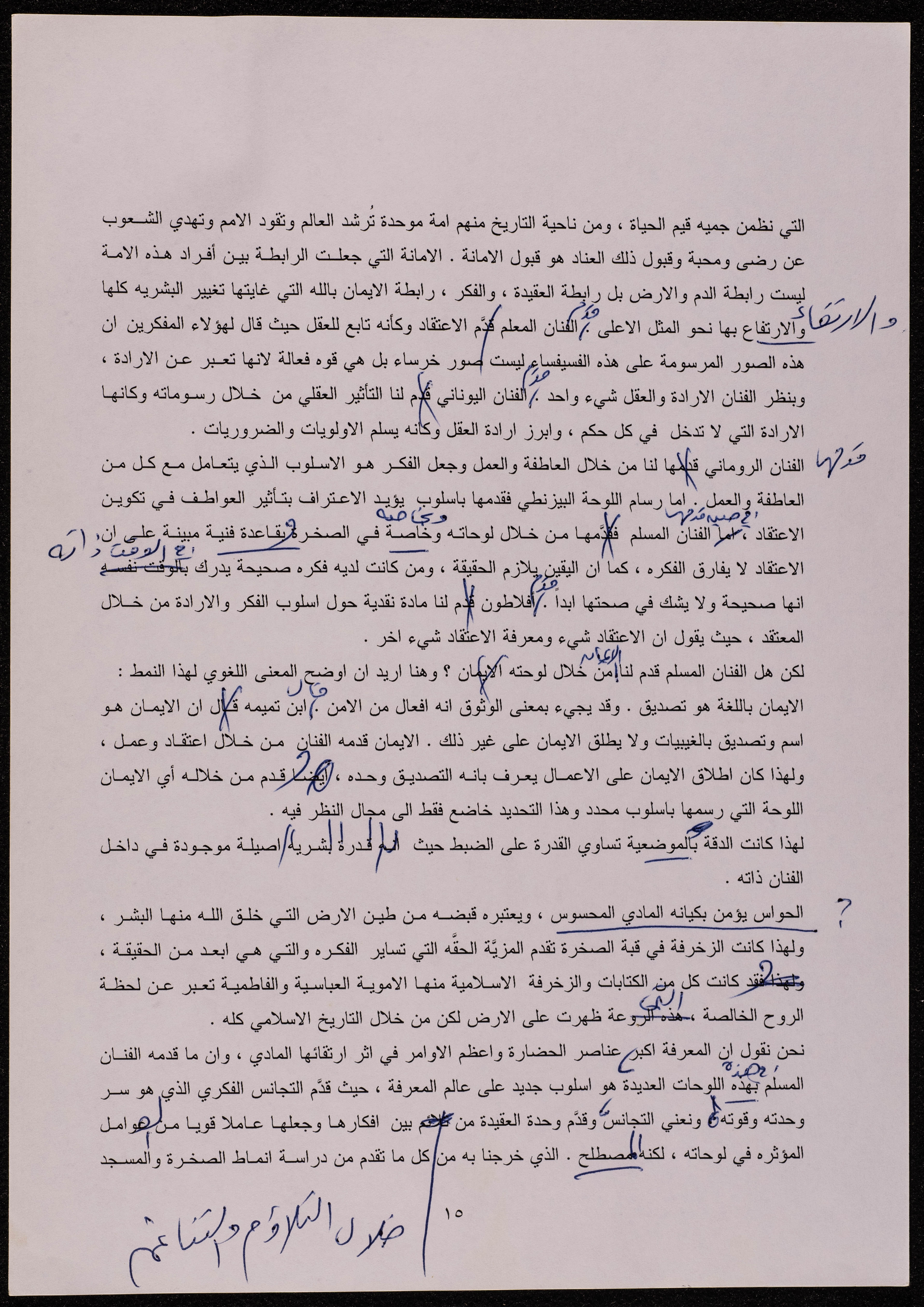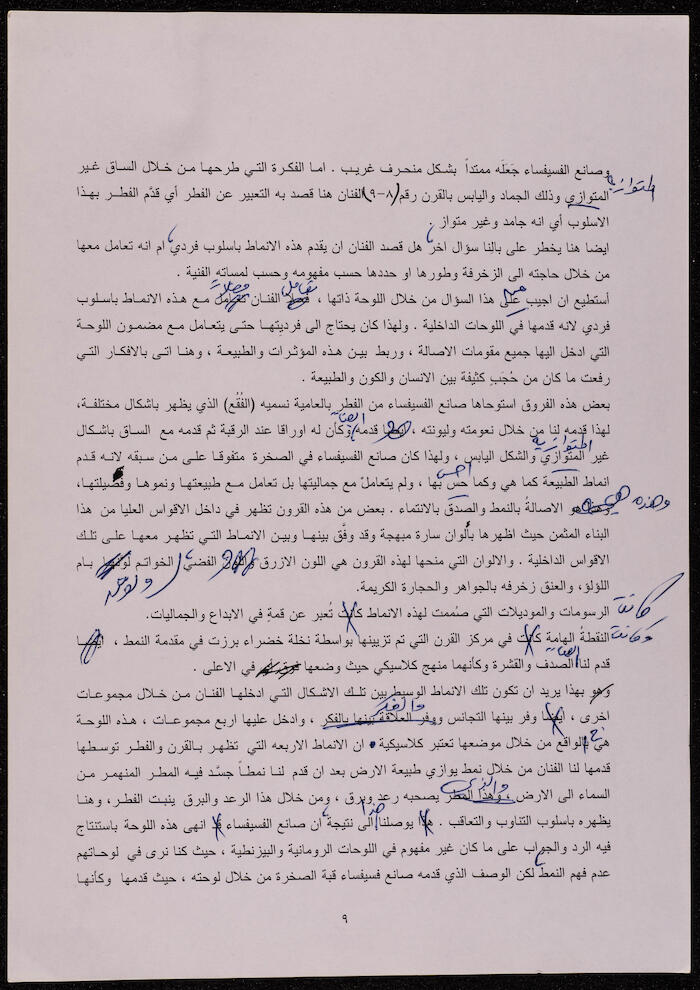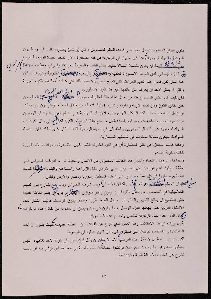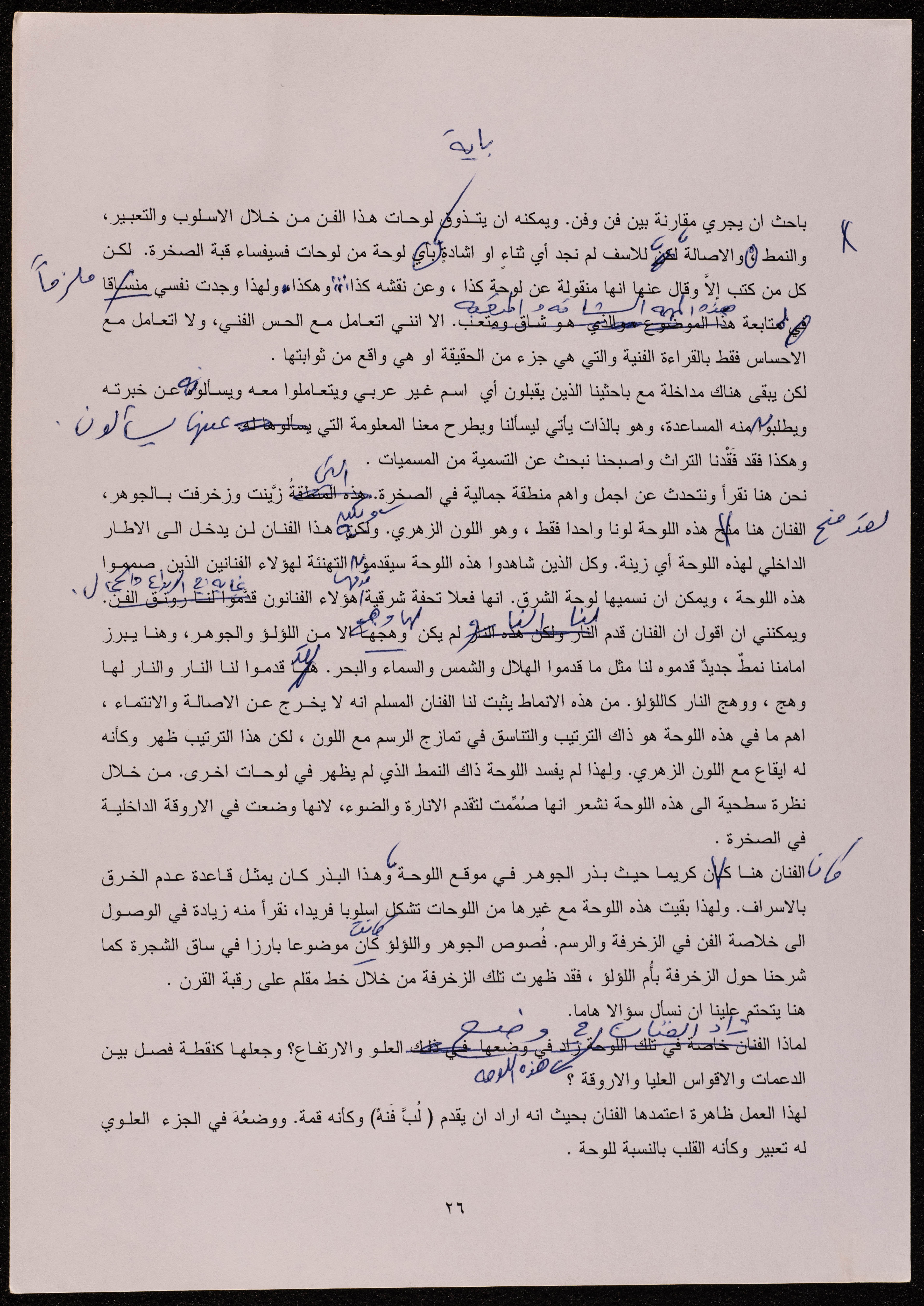 توثق هذه المادة الأرشيفية غير المؤرخة، والمطبوعة باللغة العربية، ورقة تحليلية لإبراهيم الفنّي حول فسيفساء قبة الصخرة، حيث تتبع الكاتب فن الزخرفة والفسيفساء في العصر البيزنطي والروماني واليوناني، ومجالات الفسيفساء الوجدانية والمعرفية والحركية، إضافة إلى مداخلة عن الزخرفة بأشكالها وأنواعها وتفسير وتحليل الرسومات الزخرفية حسب العصور التاريخية، كما وتناول موضوع ولادة الفن الإسلامي في القدس، وتحليل عناصر الزخرفة عبر أنماط الفسيفساء في قبة الصخرة.