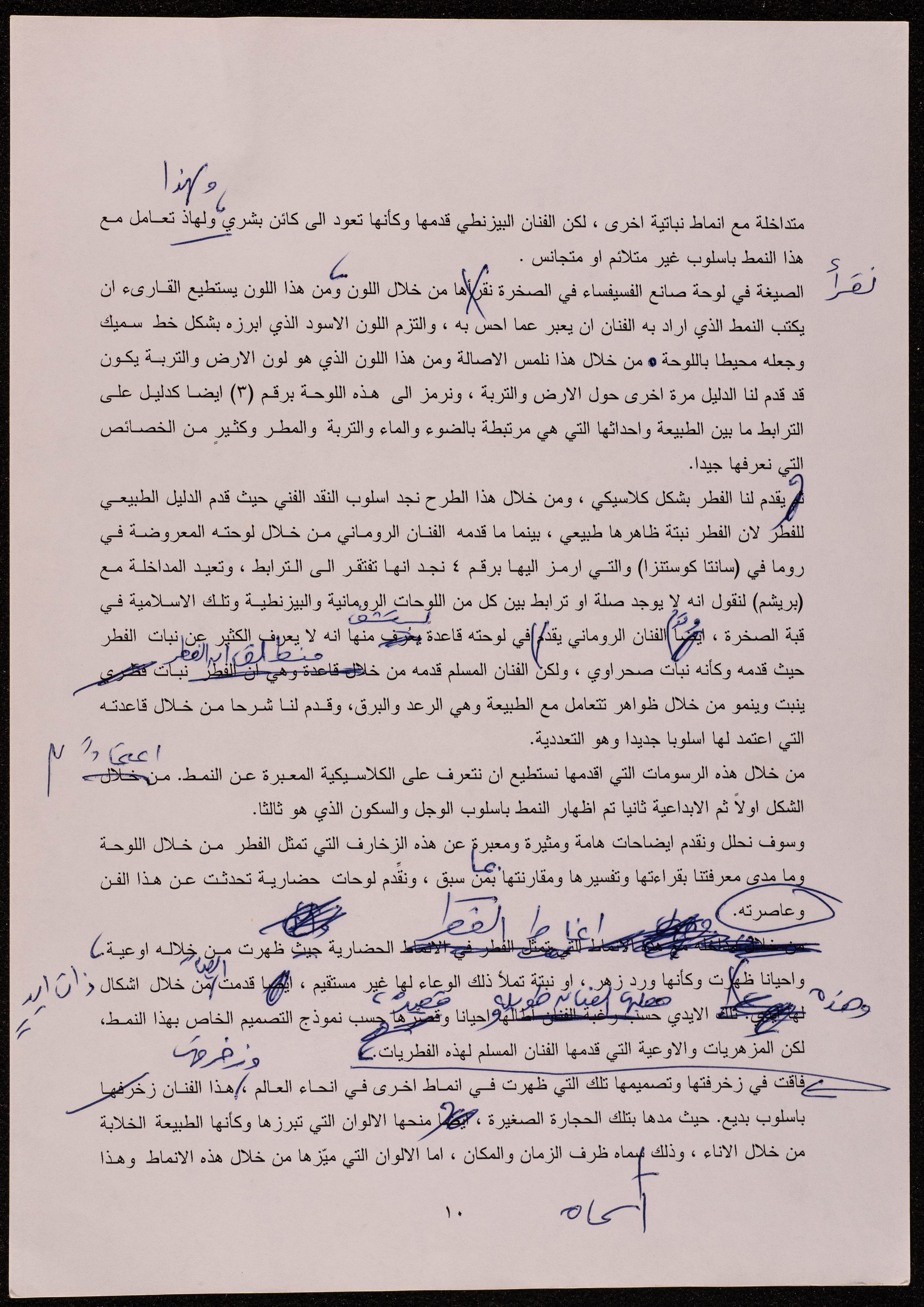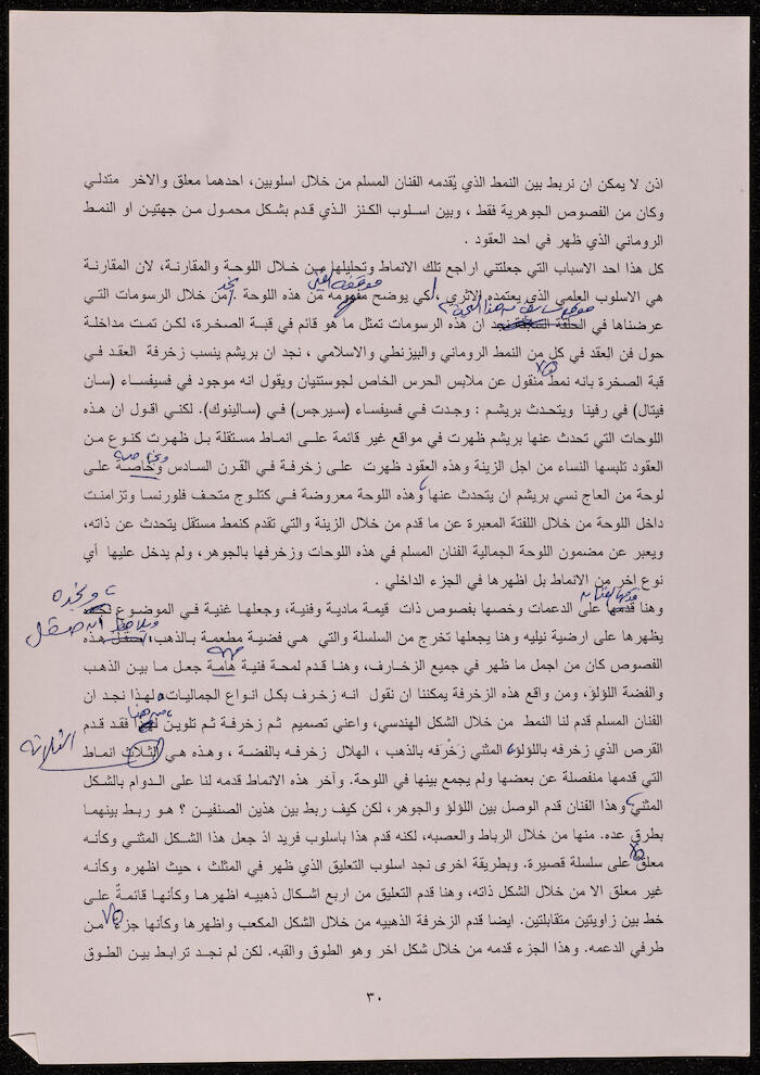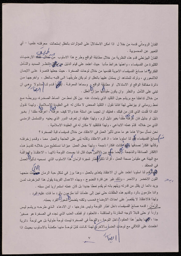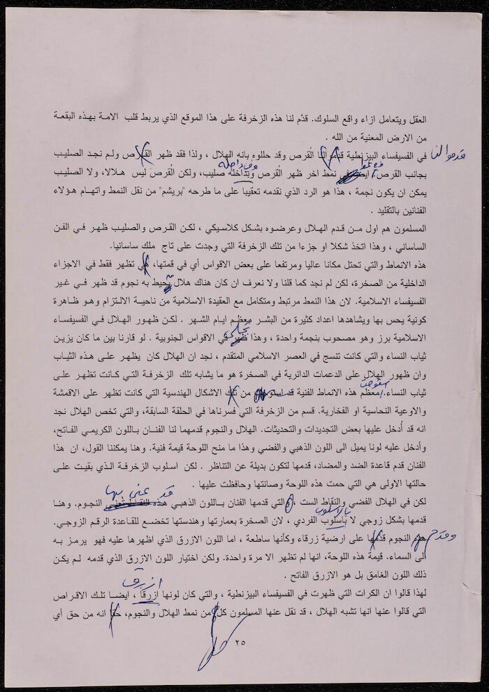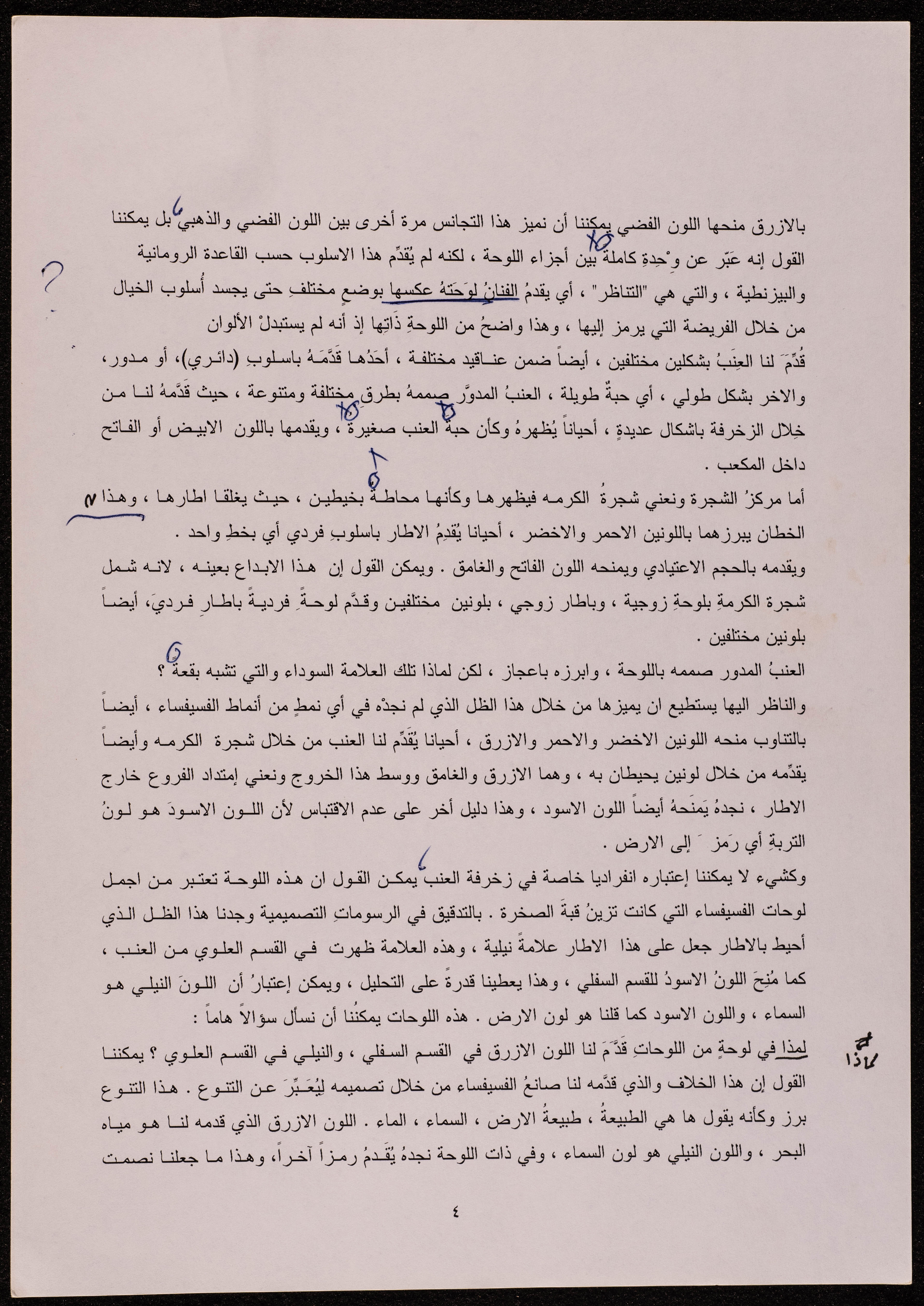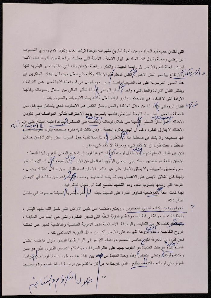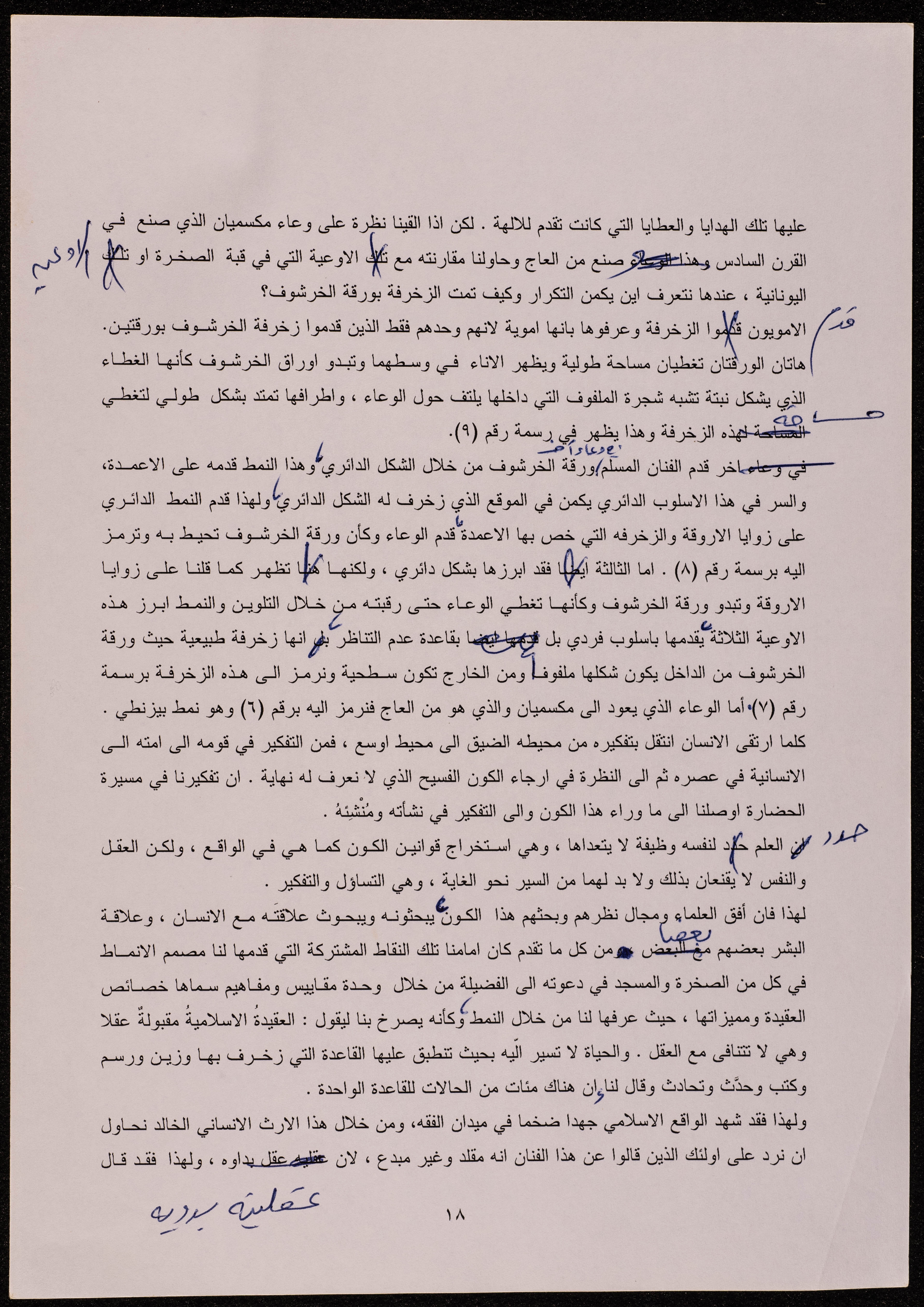توثق هذه المادة الأرشيفية غير المؤرخة، والمطبوعة باللغة العربية، ورقة تحليلية لإبراهيم الفنّي حول فسيفساء قبة الصخرة، حيث تتبع الكاتب فن الزخرفة والفسيفساء في العصر البيزنطي والروماني واليوناني، ومجالات الفسيفساء الوجدانية والمعرفية والحركية، إضافة إلى مداخلة عن الزخرفة بأشكالها وأنواعها وتفسير وتحليل الرسومات الزخرفية حسب العصور التاريخية، كما وتناول موضوع ولادة الفن الإسلامي في القدس، وتحليل عناصر الزخرفة عبر أنماط الفسيفساء في قبة الصخرة.