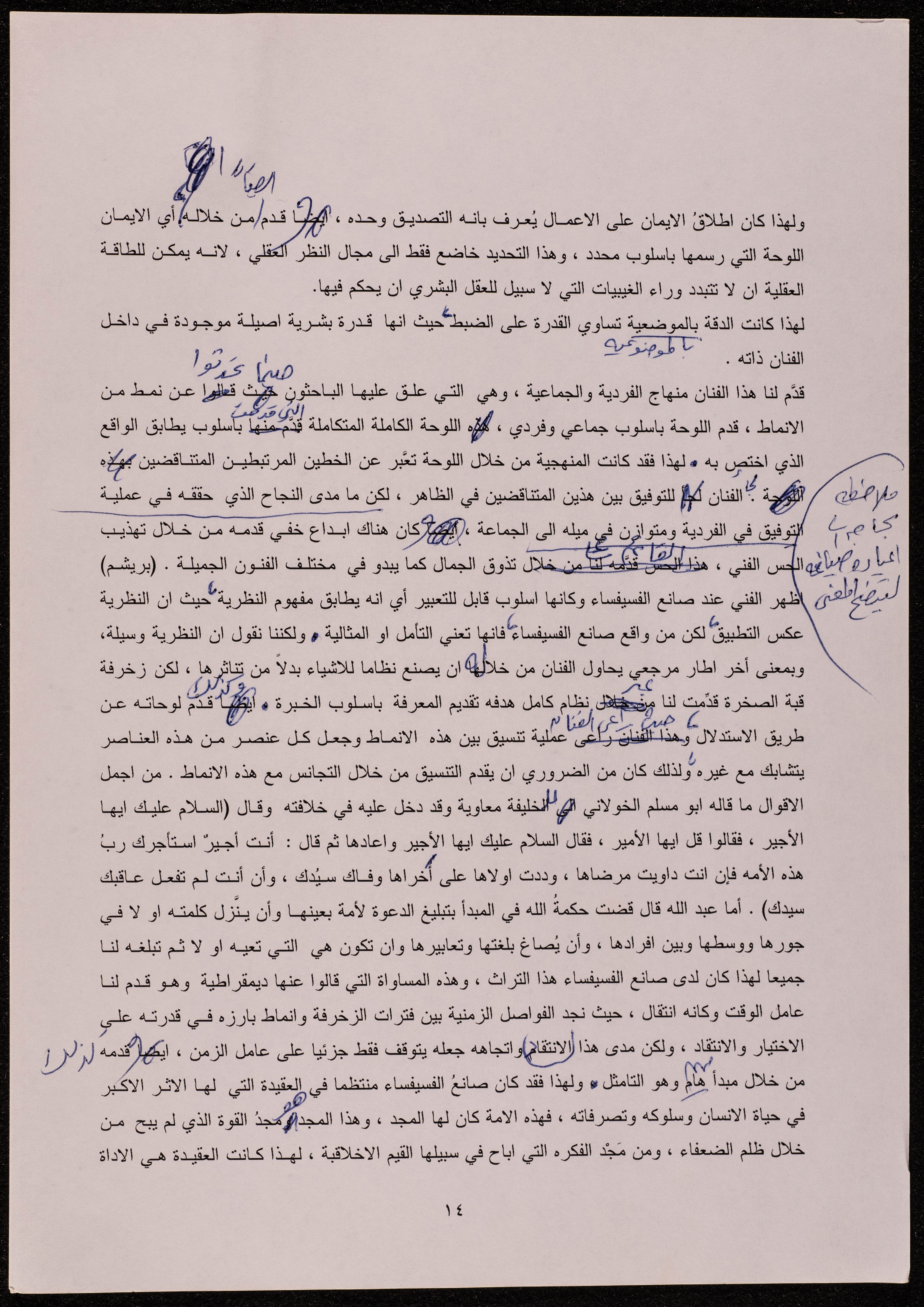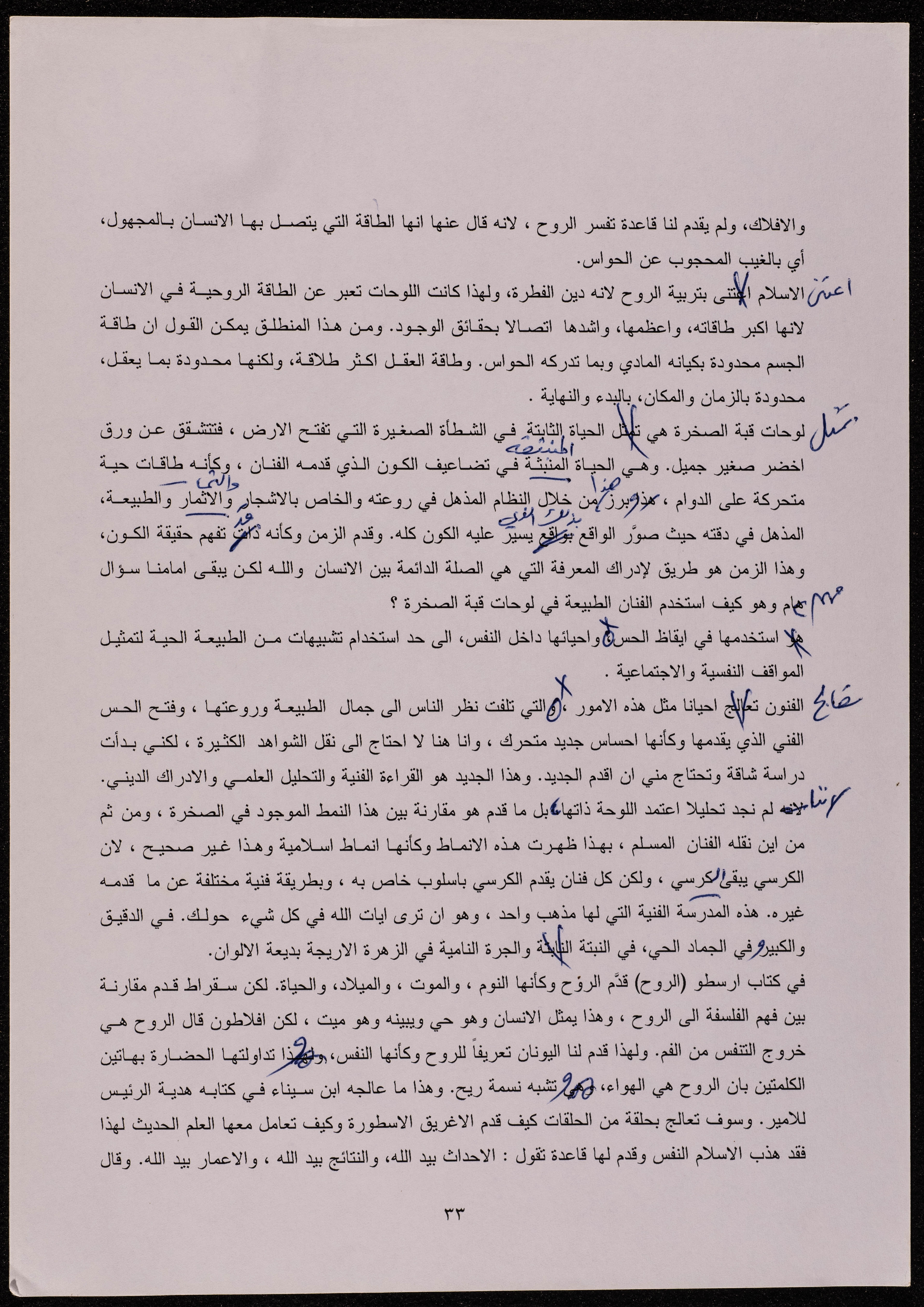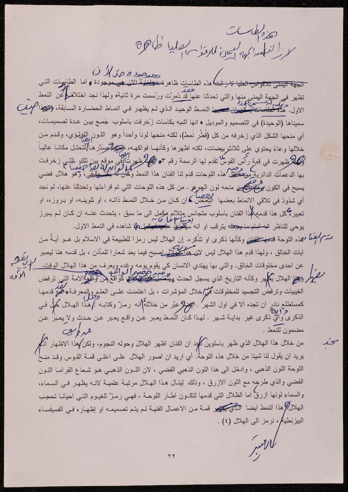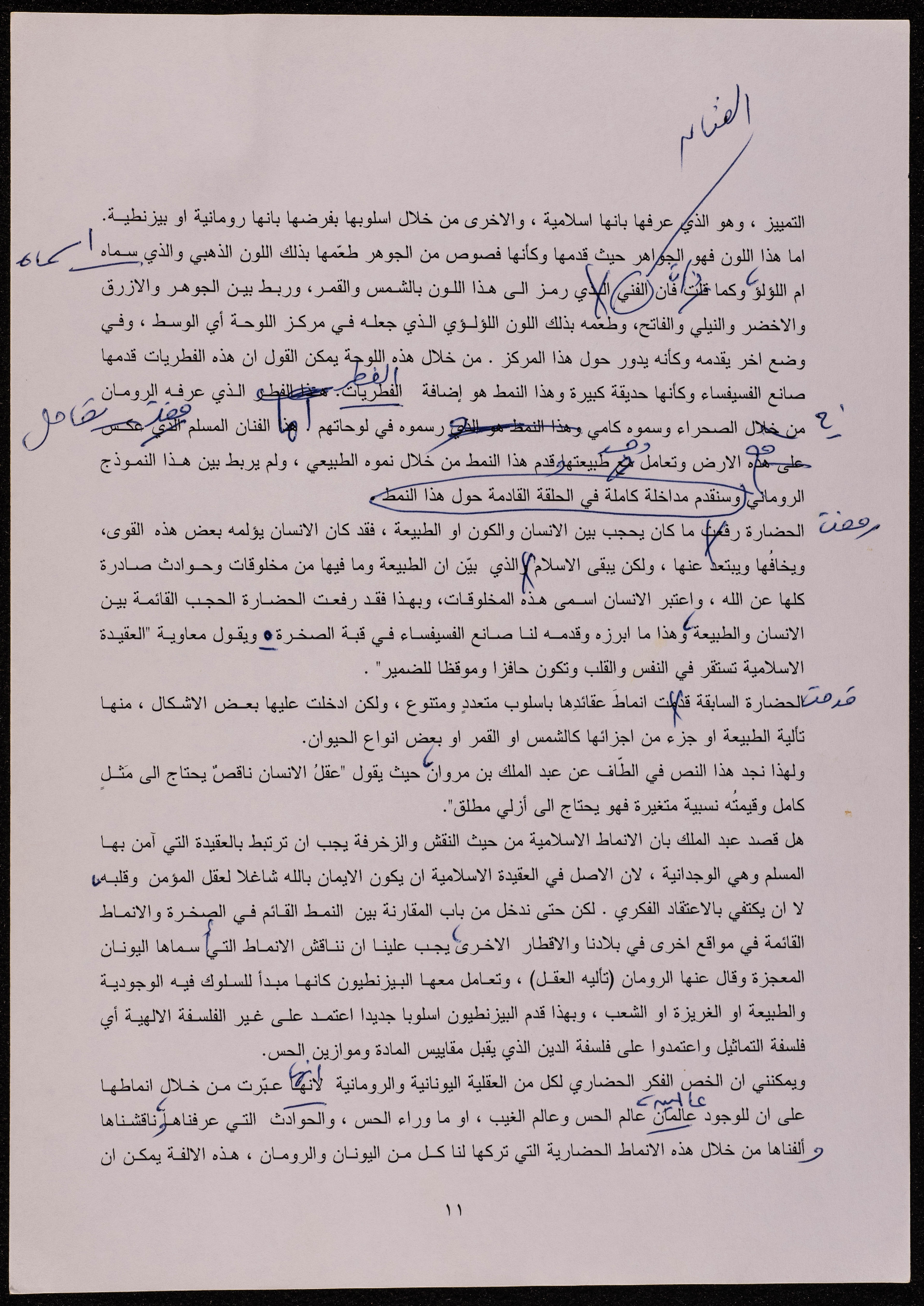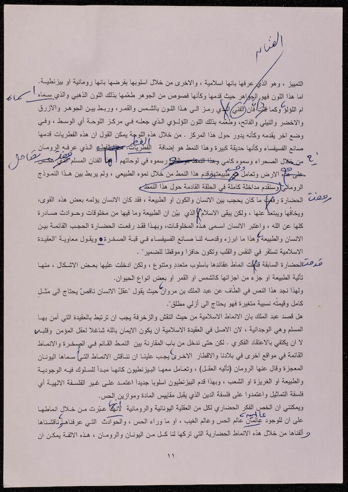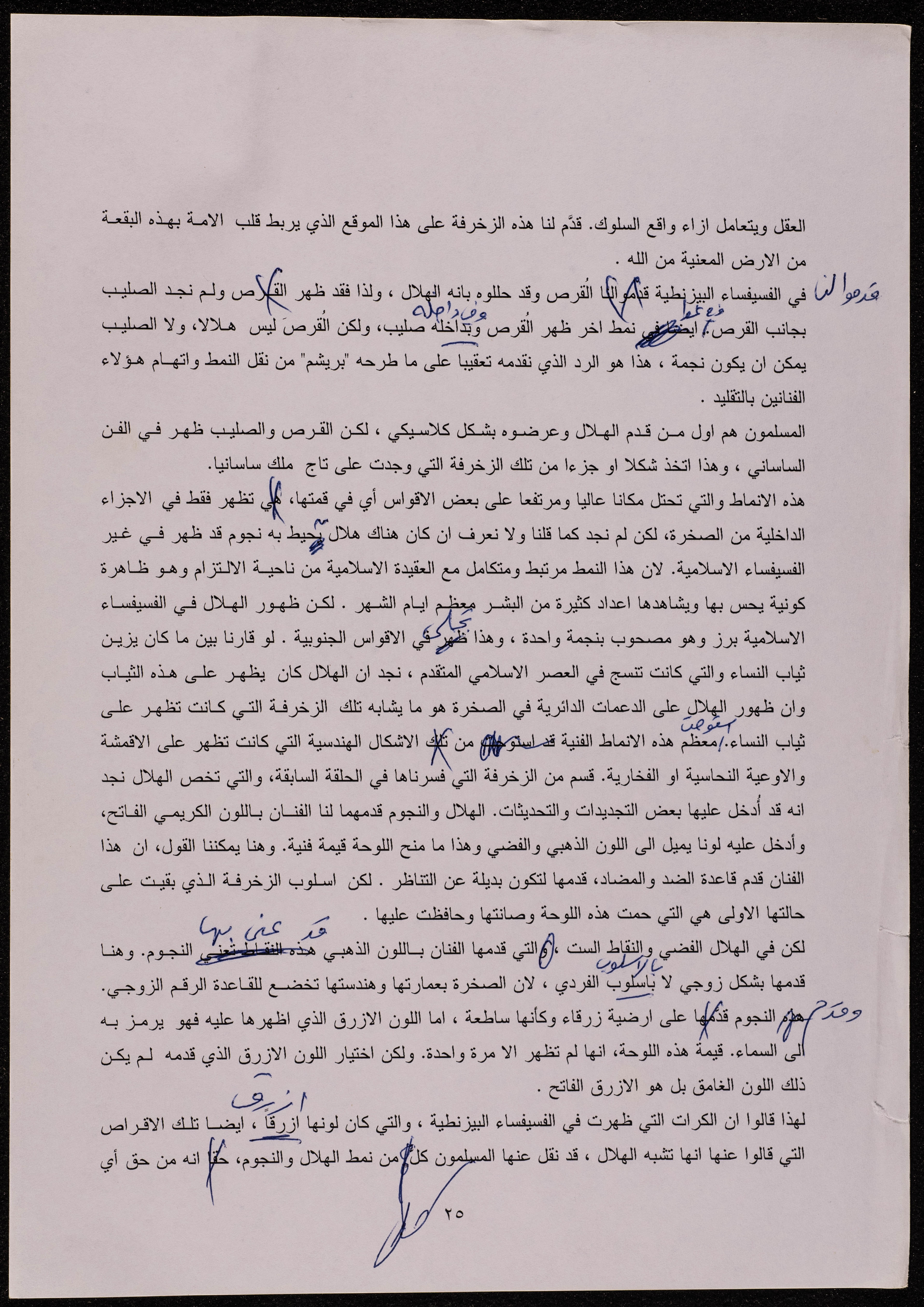 توثق هذه المادة الأرشيفية غير المؤرخة، والمطبوعة باللغة العربية، ورقة تحليلية لإبراهيم الفنّي حول فسيفساء قبة الصخرة، حيث تتبع الكاتب فن الزخرفة والفسيفساء في العصر البيزنطي والروماني واليوناني، ومجالات الفسيفساء الوجدانية والمعرفية والحركية، إضافة إلى مداخلة عن الزخرفة بأشكالها وأنواعها وتفسير وتحليل الرسومات الزخرفية حسب العصور التاريخية، كما وتناول موضوع ولادة الفن الإسلامي في القدس، وتحليل عناصر الزخرفة عبر أنماط الفسيفساء في قبة الصخرة.