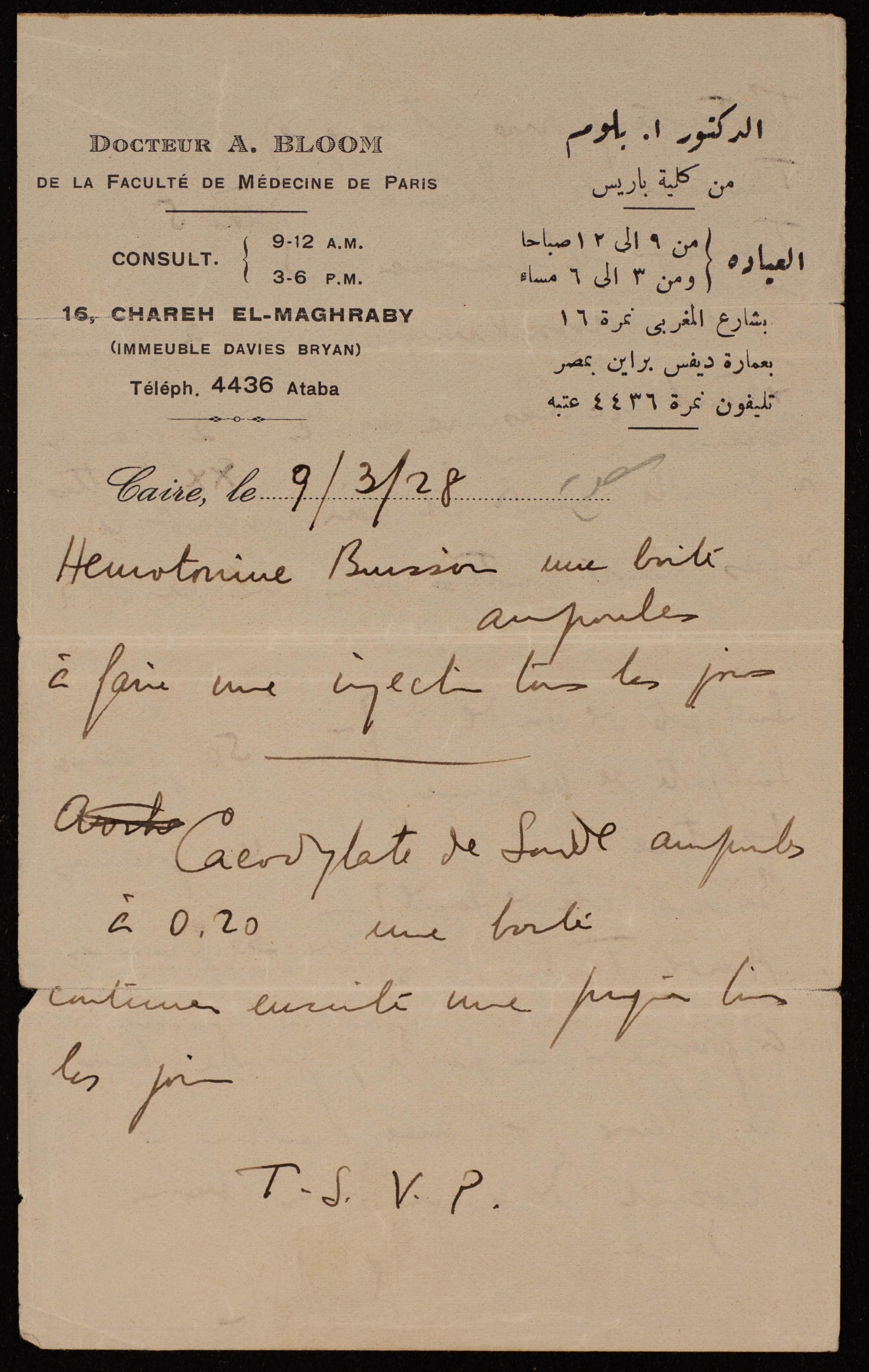 A Medical Prescription for Sa'deyeh al-Alami by Dr Bloom, Egypt, 9 March 1928
