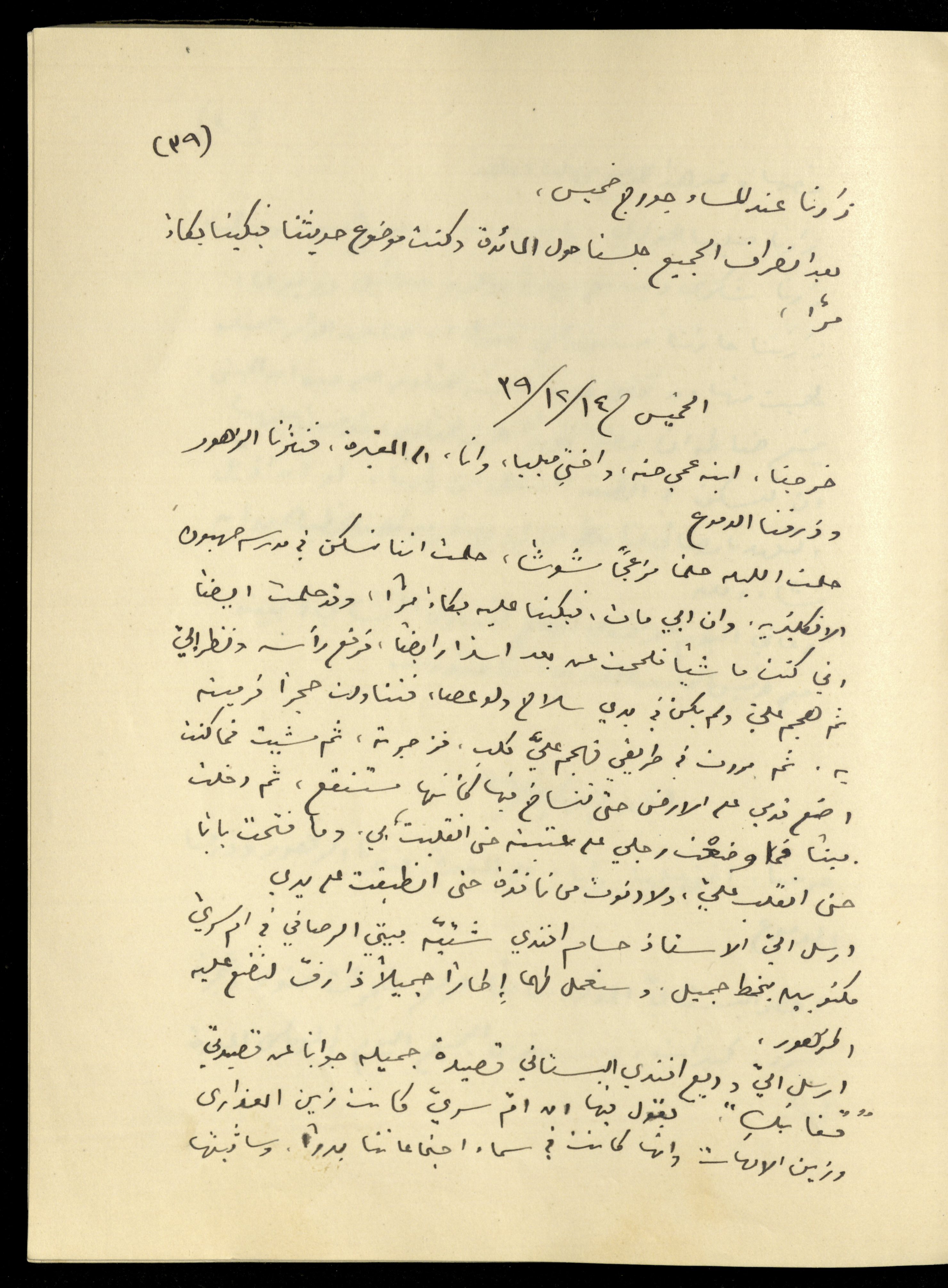 توثق هذه المادة الأرشيفية، المكتوبة بخط يد خليل السكاكيني، يوميته المؤرخة في يوم الخميس الموافق 14 كانون الأول 1939، افتتحها بذكر خروجه وابنة عمه حنة وأخته ميليا إلى المقبرة ونثرهم الزهور عليها، ومما جاء فيها أيضاً أن حسام أفندي شتية أرسل له اثنين من أبيات شعر الرصافي في سلطانة، وذكر بعد ذلك من زاره في ذلك اليوم؛ صليبا الجوزي، وعيسى ديبة، وجورج خميس، وشكري ديب وزوجته وولديه جبرائيل وريمون، كما زارتهم زوجة دافي، وذكر أن عمر أفندي الصالح دعاه لتناول الشاي في بيته مع رئيس الجامعة العبرية فاعتذر.