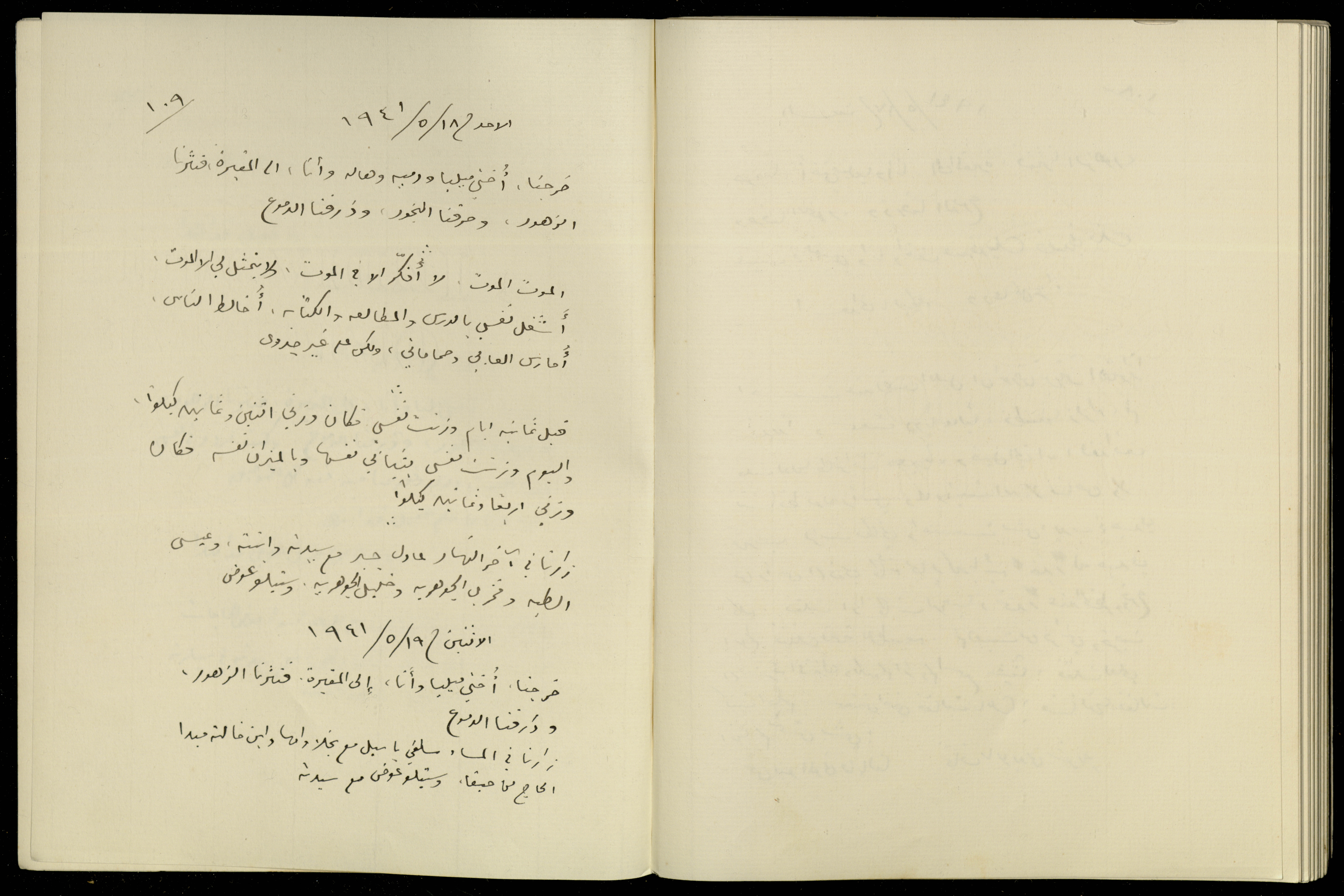 Handwritten, this archival item documents the diaries of Khalil Sakakini on Sunday 18 May 1940, which he began by pointing out visiting the cemetery and spreading flowers with his sister Milia and his daughters Dumia and Hala, remembering death, trying to distract himself with reading, writing and socializing, weighting himself 8 days ago where he was 82 Kilograms, whereas in that day he weighted 84 kilograms, the visit of Adel Jaber with his wife and daughter, Issa al-Taba, Fakhri al-Jowharieh and Stilo Awad. On the same page, Sakakini wrote the beginning of his diary on Monday 19 May 1940, which he began by pointing out visiting the cemetery and spreading flowers with his sister Milia, and the visit of Basil with Najla, her mother, his cousin Meeda al-Haj from Haifa, and Stilo Awad with his wife.