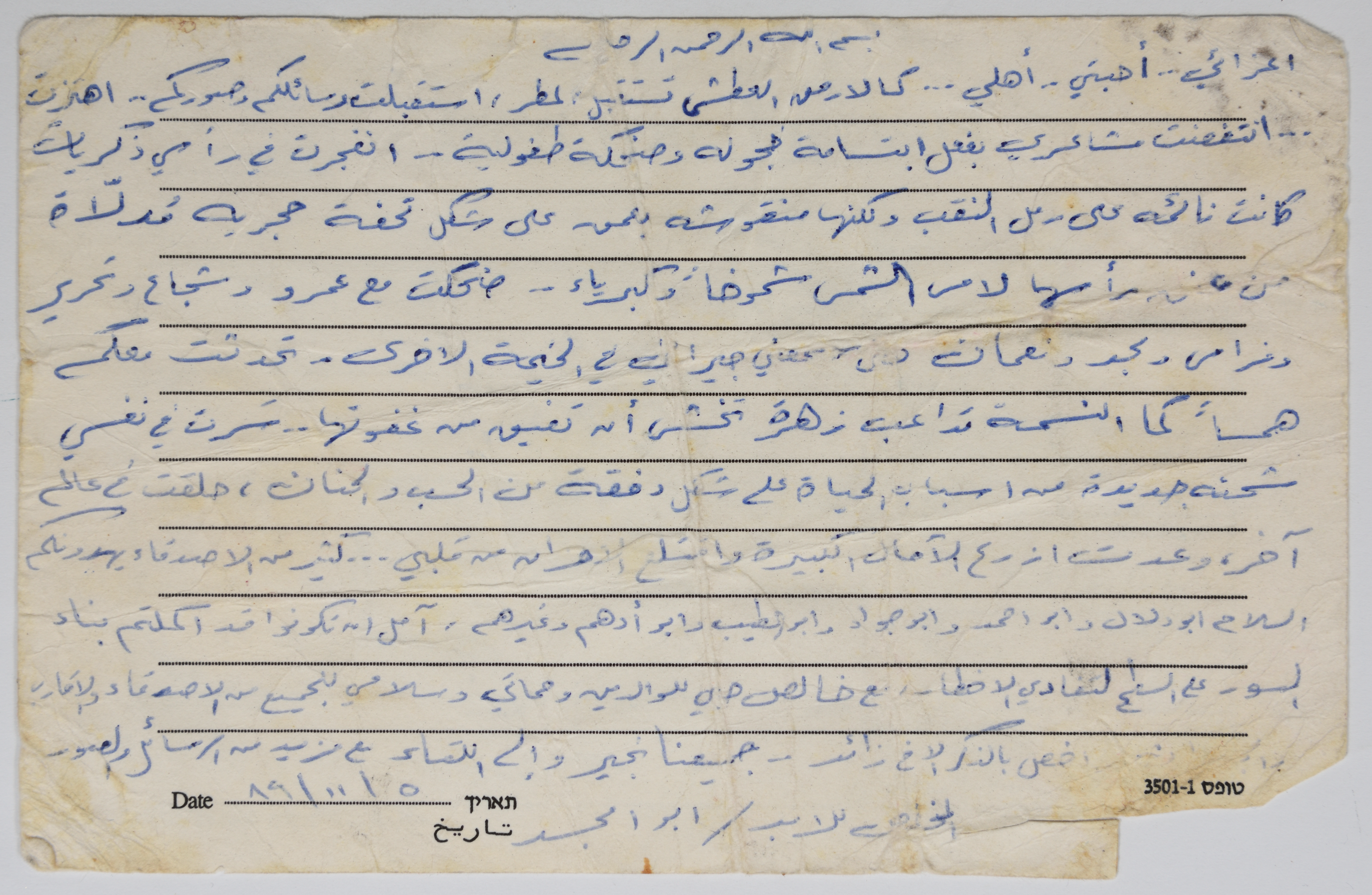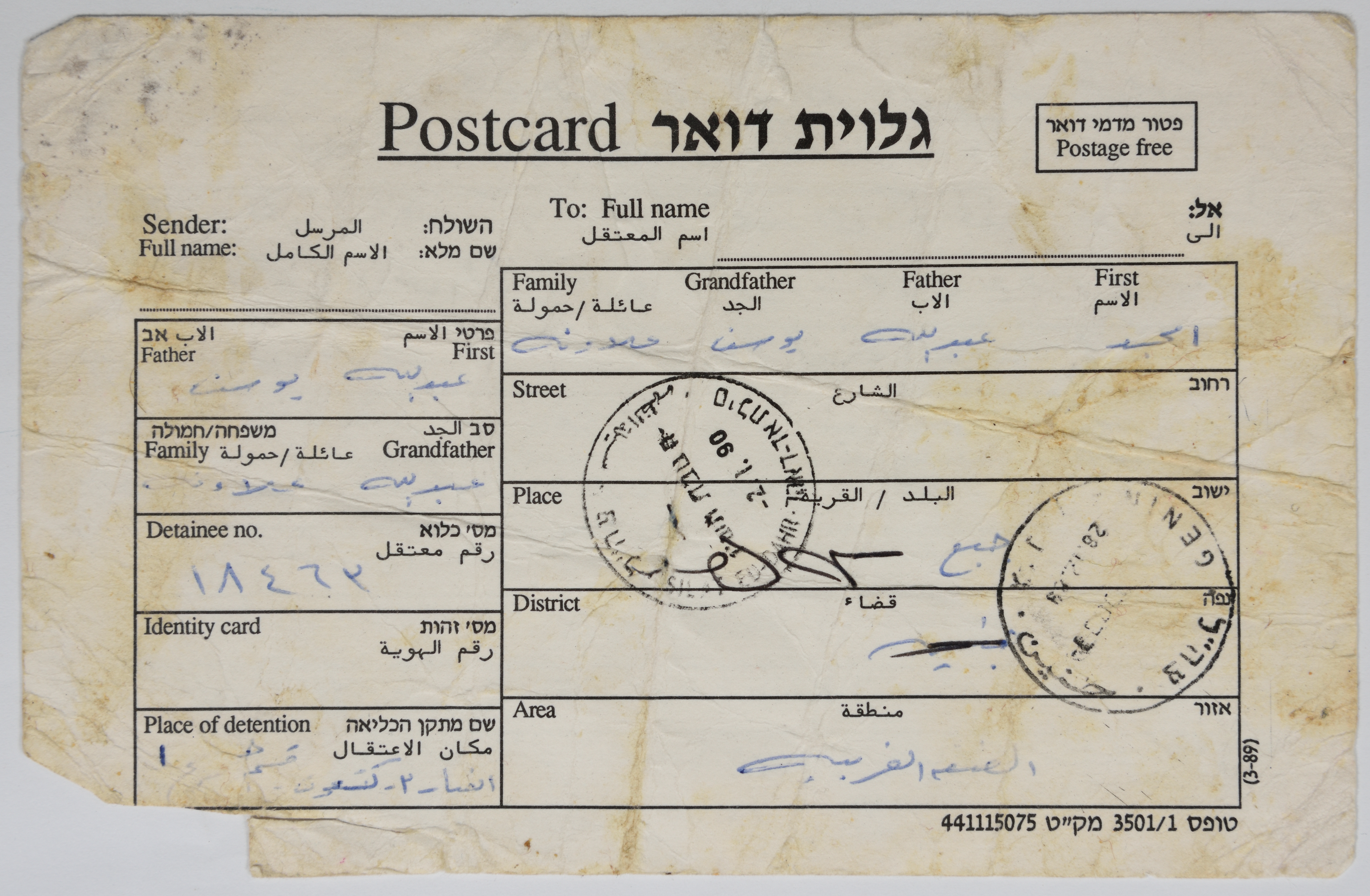 A two-sided postcard; distributed by the General Prisons Directorate, sent from the Negev Prison (Ktzi'ot Prison) by Abdullah Alawneh to his son Amjad ʿalawne. He tells him how happy he was to receive photos of his children and he asks for more photos