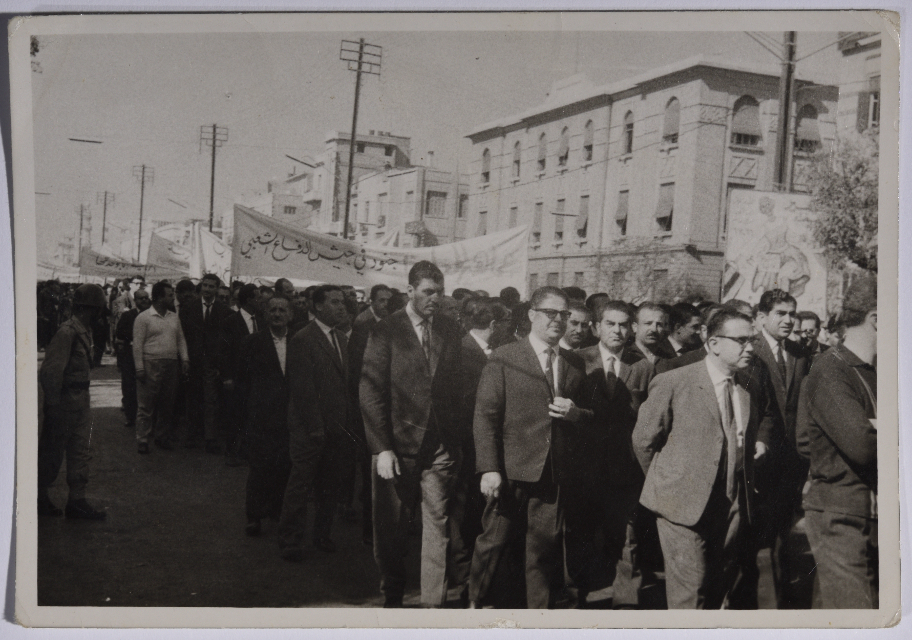 Taken in the late 1950s in Damascus, this black-and-white photograph features a protest against Baghdad Pact where protesters are seen holding posters and signs against the establishment of Baghdad Pact.