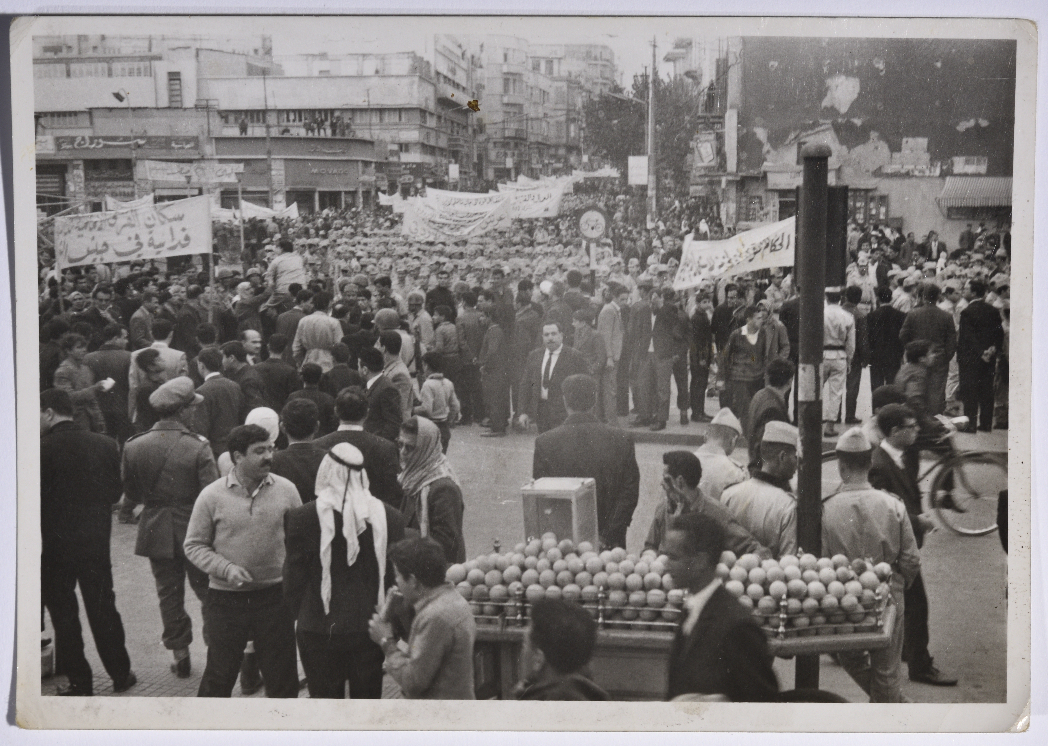 Taken in the late 1950s in Damascus, this black-and-white photograph features a protest against Baghdad Pact where protesters are seen holding posters and signs about Palestine and the unity of Arabs. Police officers are seen mingling among the protesters.