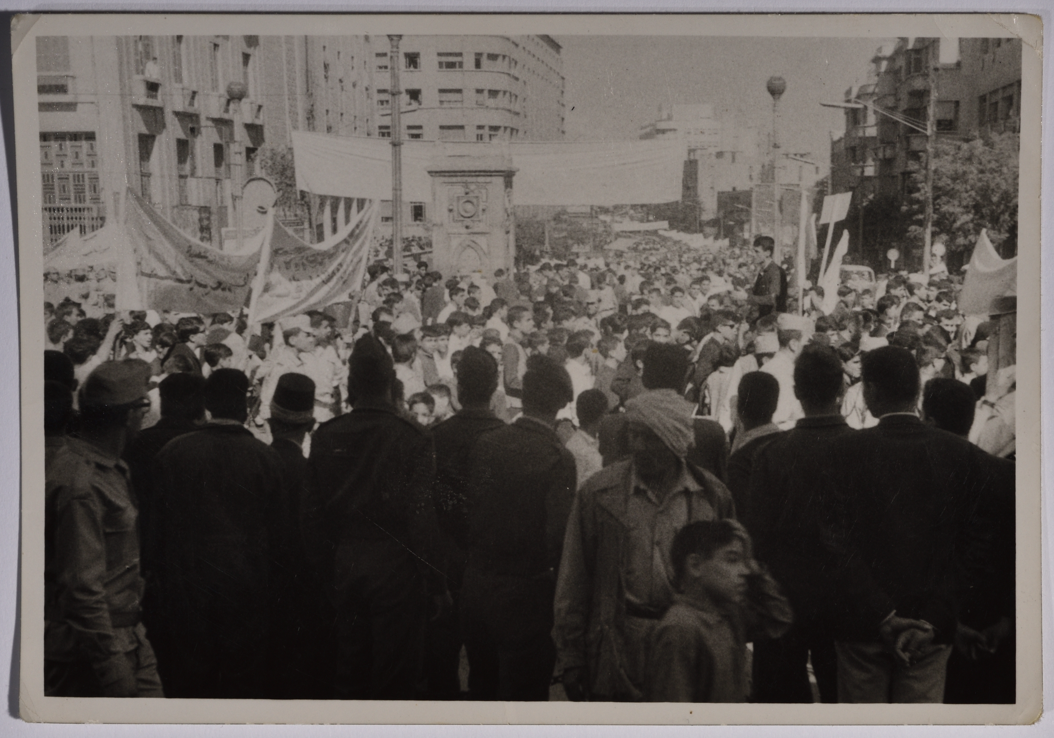 Taken in the late 1950s in Damascus, this black-and-white photograph features a protest against Baghdad Pact where protesters are seen holding posters and signs calling for unity and freedom.