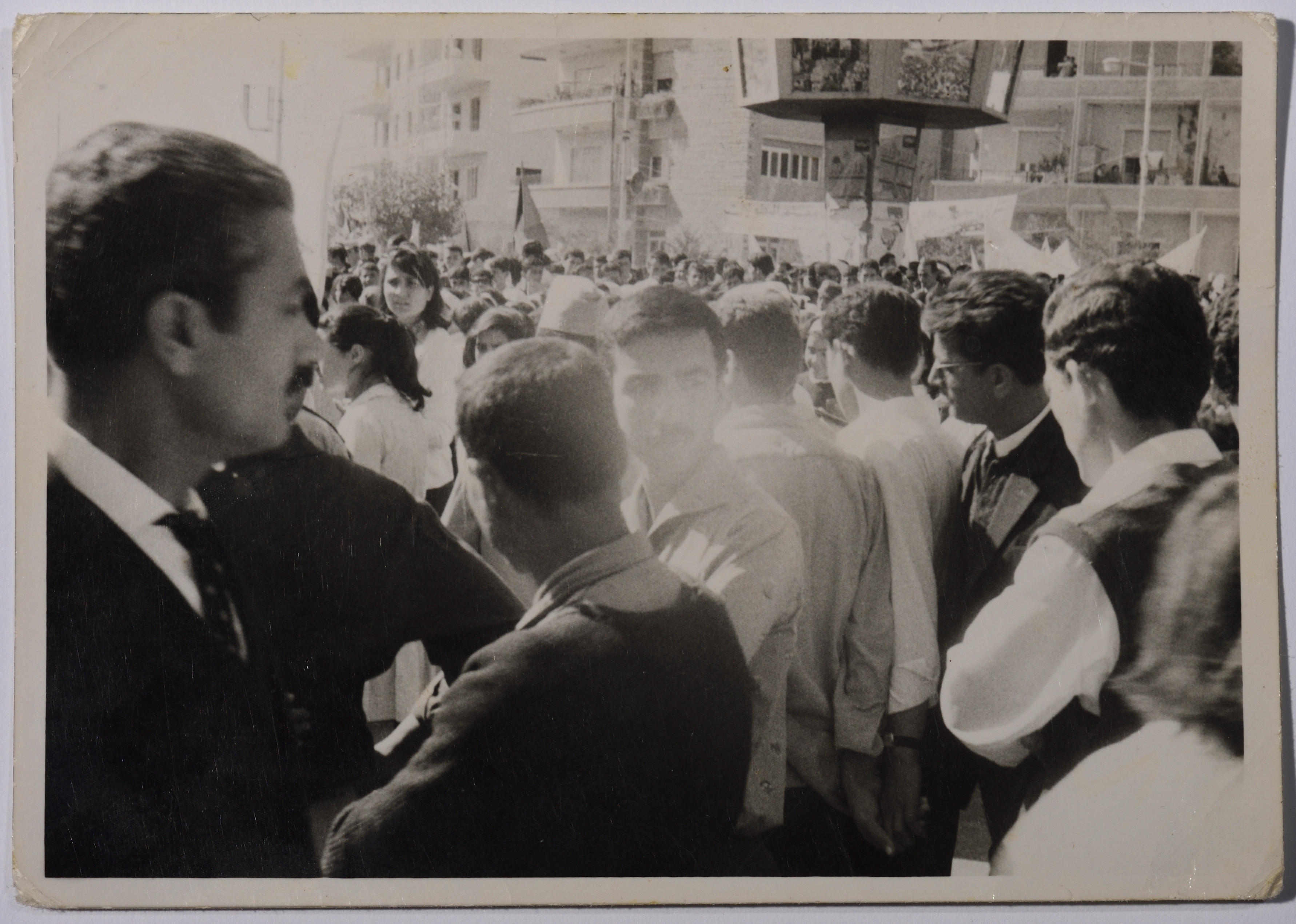 Taken in the late 1950s in Damascus, this black-and-white photograph features a protest against Baghdad Pact.