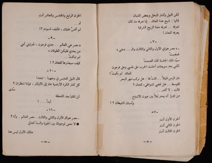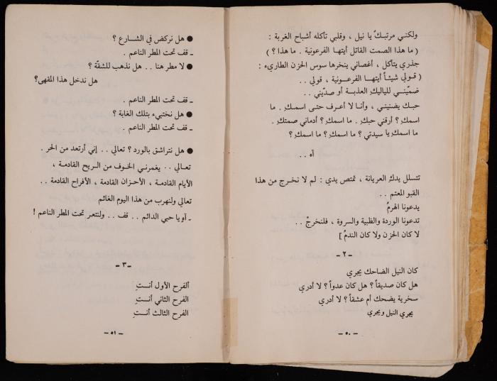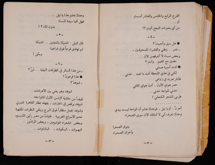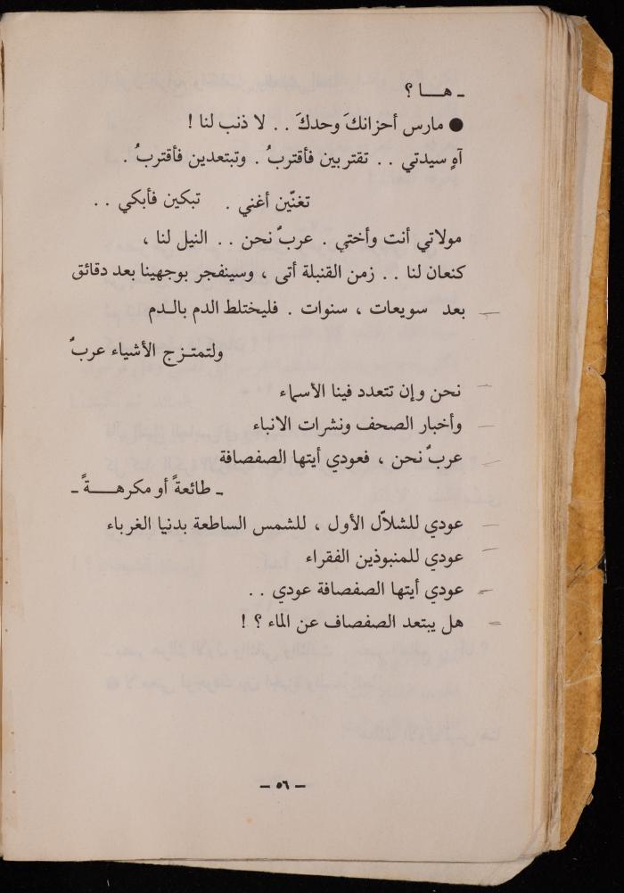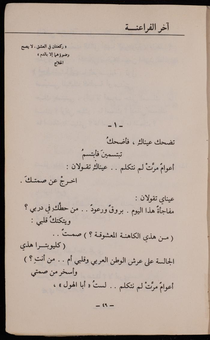 Printed in Arabic, this document shows a poem by Ali Fodeh titled "Akher al-Faraaineh (The Last of the Pharaos)", and it is from his poetry collection "Iwa' ath-Thi'b (Howl of the Wolf)" which was published in 1977.;Ozrail, Samar. Hind Battah. "Ali Fodeh Collection". Archival Inventory, 17 December 2019. The Palestinian Museum Digital Archive.