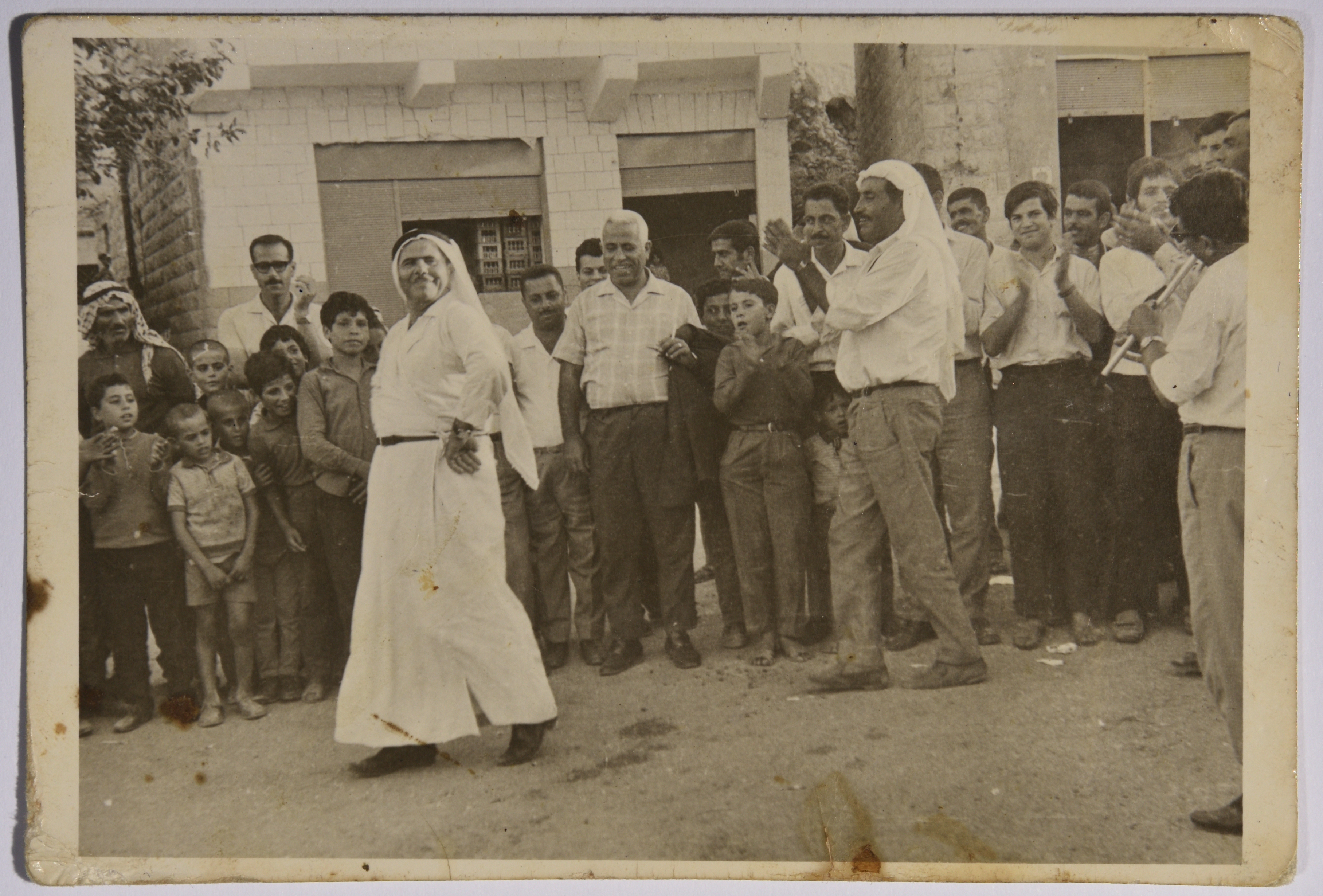 صورة بالأبيض والأسود لراجح السلفيتي وهو يؤدي وصلة زجلية ويرقص الدبكة خلال إحدى الزفات في سلفيت، ويظهر في الصورة أن العرض كان في ساحة التوتة في سلفيت وهي ساحة مشهورة في البلدة وكانت تعتبر المركز الرئيسي لتجمع الأهالي في البلدة.