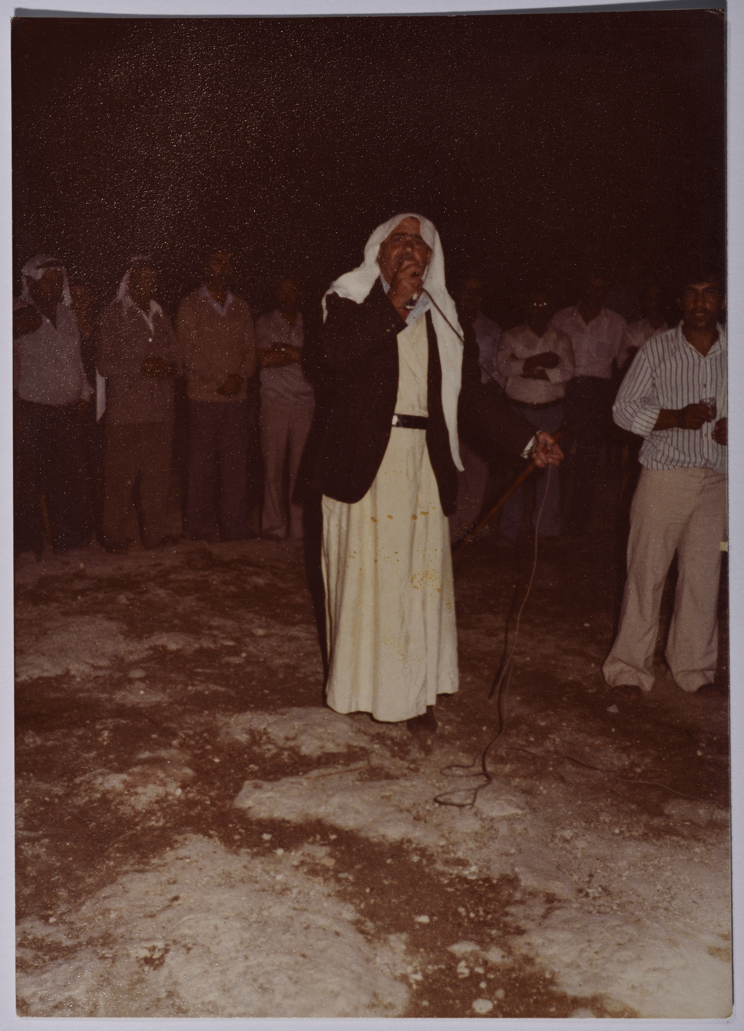 صورة ملونة لراجح السلفيتي وهو يؤدي وصلة زجل في حفل زفاف أقيم في قرية فرخة قرب سلفيت، في ثمانينيات القرن الماضي