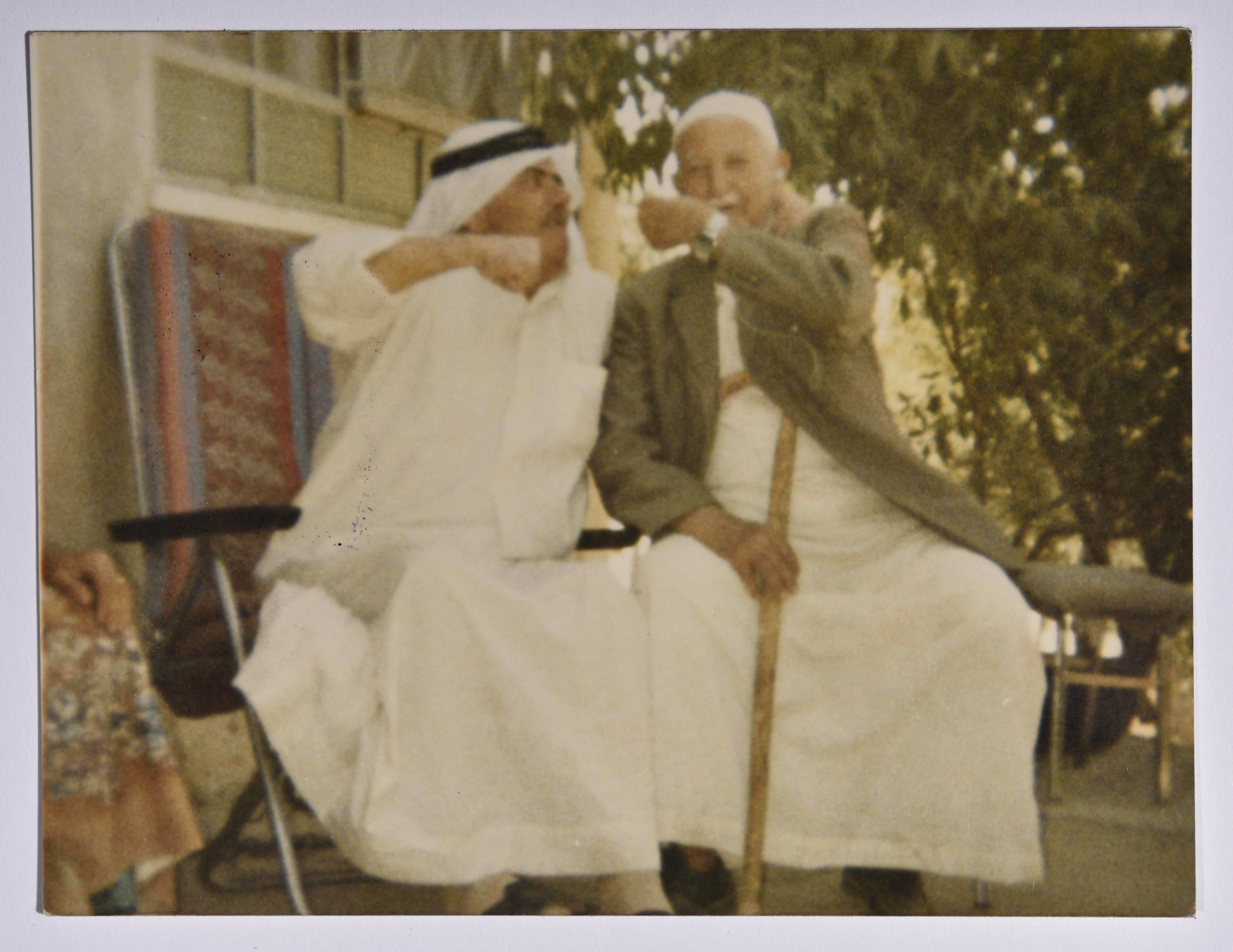 صورة ملونة لراجح السلفيتي وصديقه الحاج نمر الحريم وهما يتعاركان ويضحكان، يذكر أن الحاج نمر الحريم كان يكبر راجح بسنوات كثيرة لكنه كان صديق راجح السلفيتي وكان جاره أيضا.