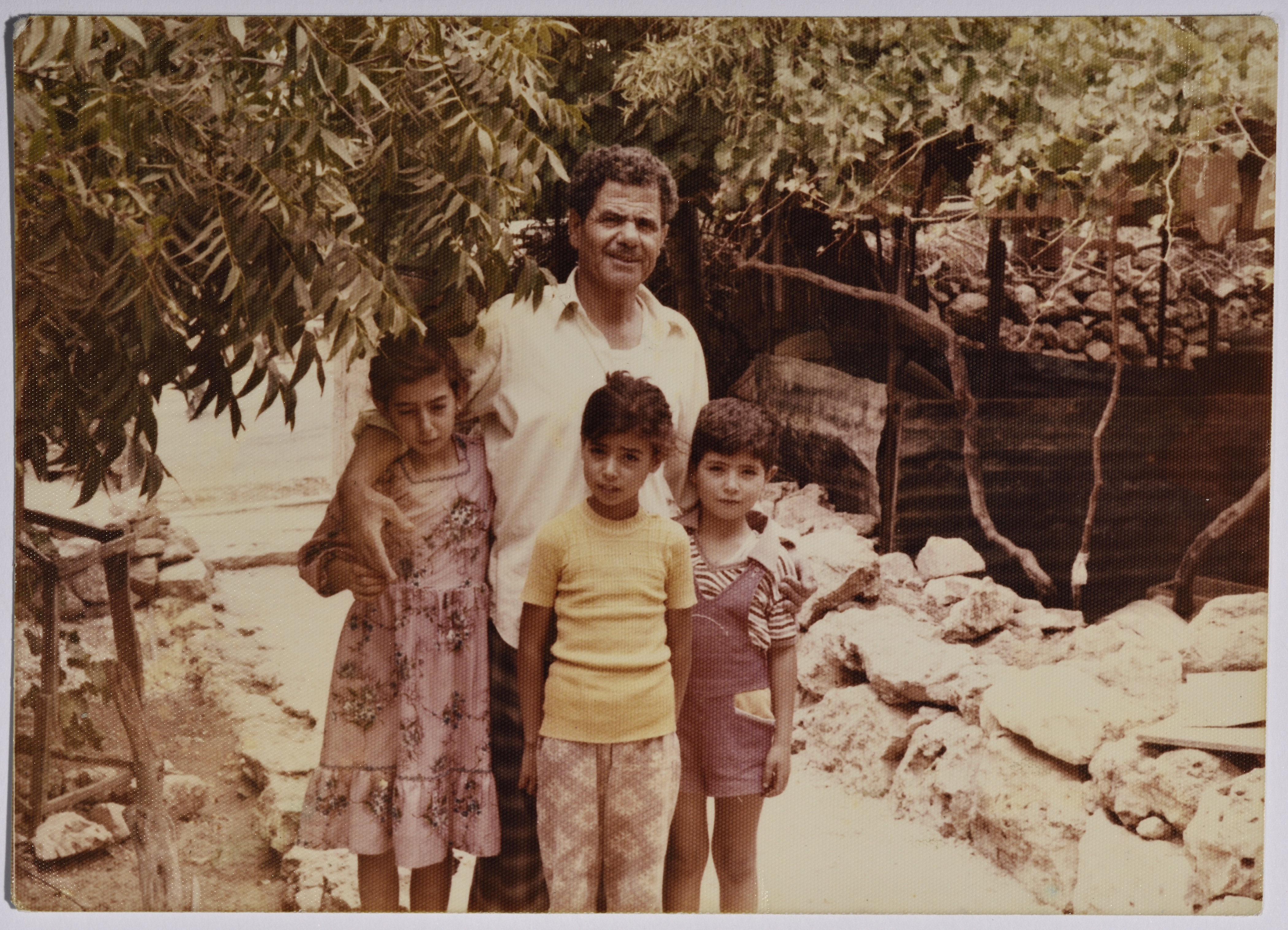 Taken in 1978, this colour photograph features Rajih al Salfeety in the backyard of his house in Salfit with his children Duha, Ahmad, and ʿandalib.