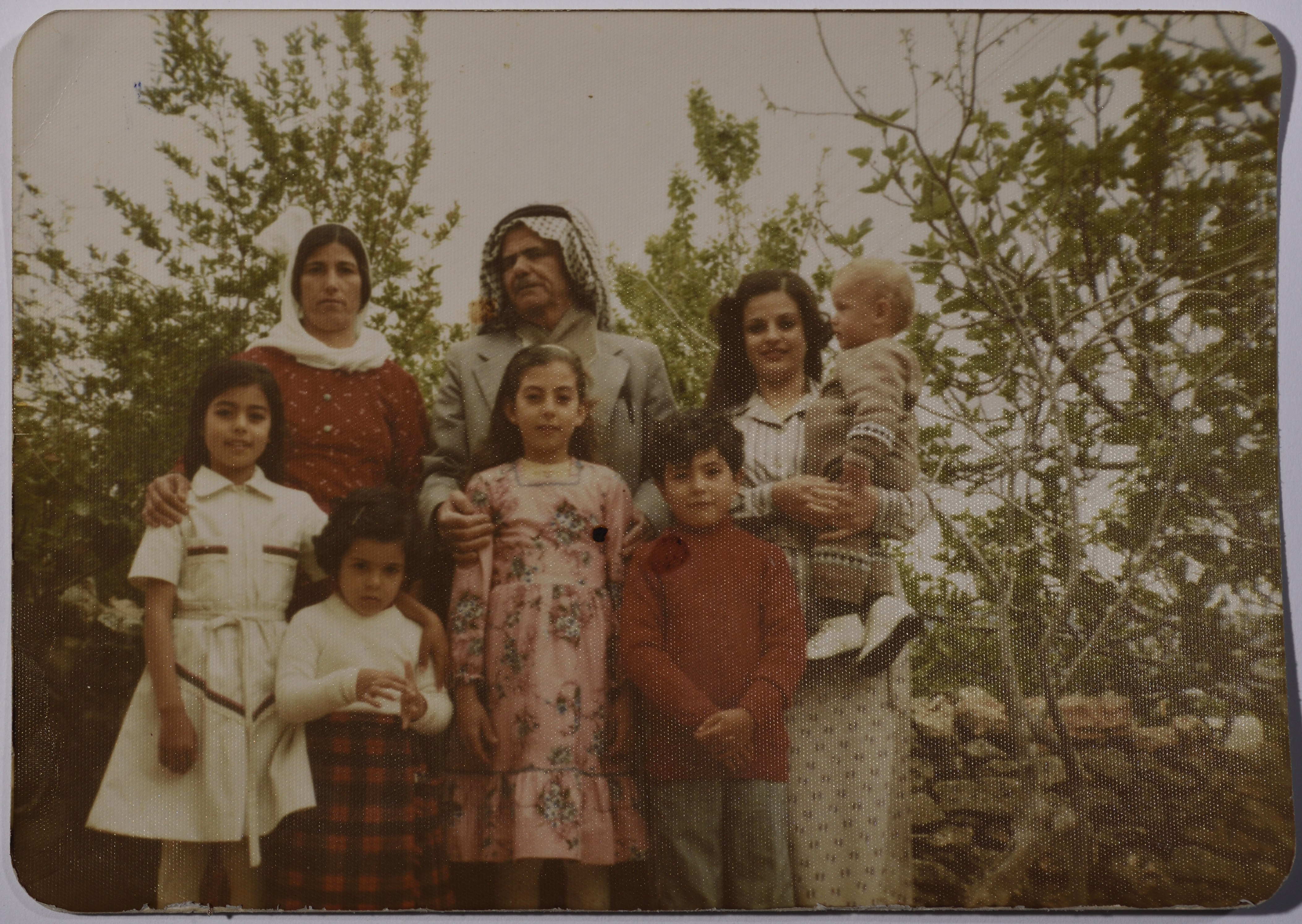 Taken in 1978, this colour photograph features Rajih al Salfeety in his house in Salfit with his wife and children. Next to him is his sister and her children.