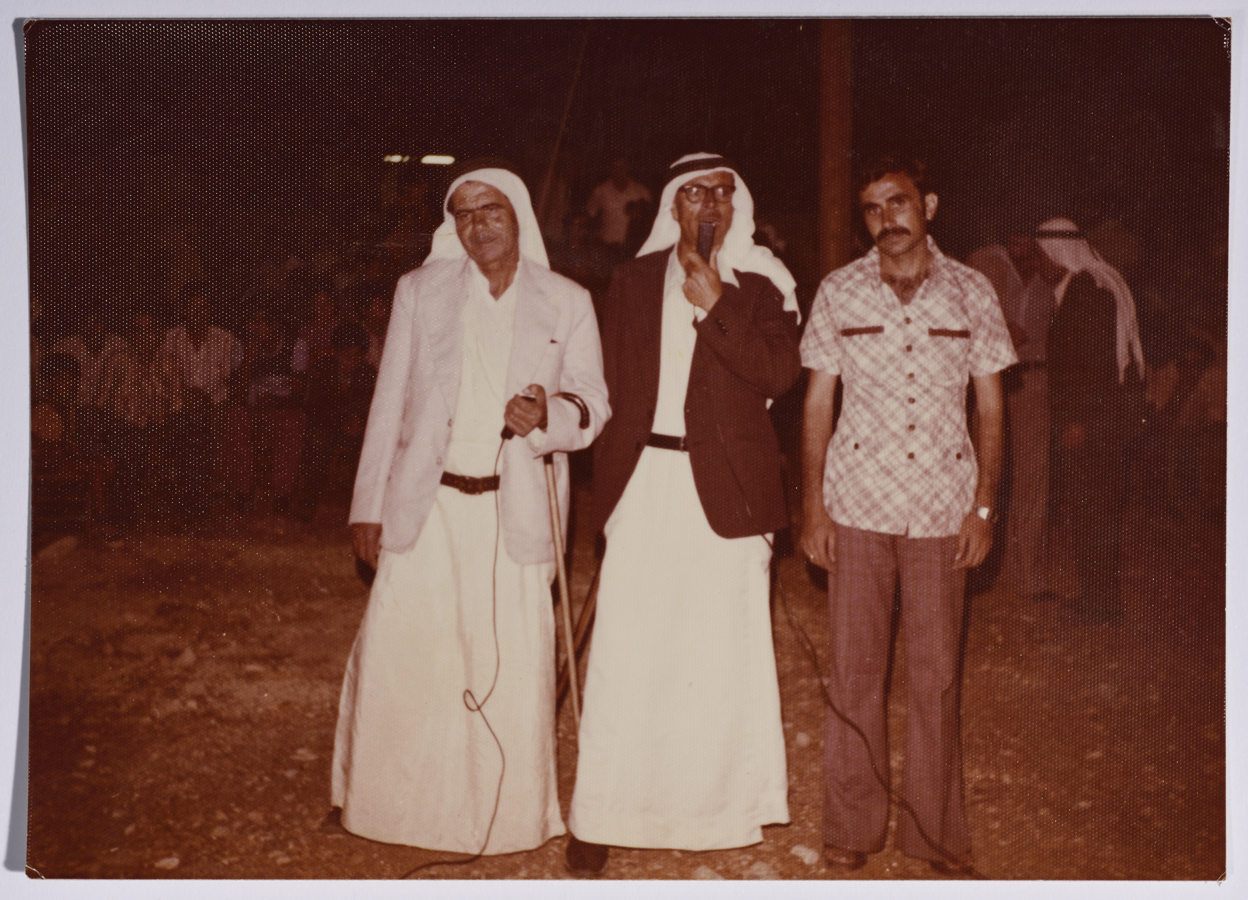 Taken in the 1980s, this colour photograph features Rajih al Salfeety with his fellow singer and goog friend Hammuda al-Farkhawi singing Zajal (Rhymed Poetry) at a wedding in the West Bank.